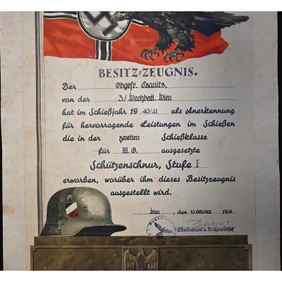 Very nice and decorative Wehrmacht Wach-Bataillon Wien related Schützenschnur Stufe I document in used condition.