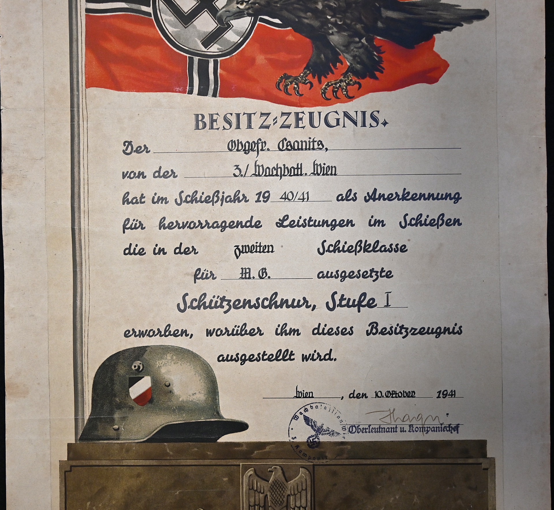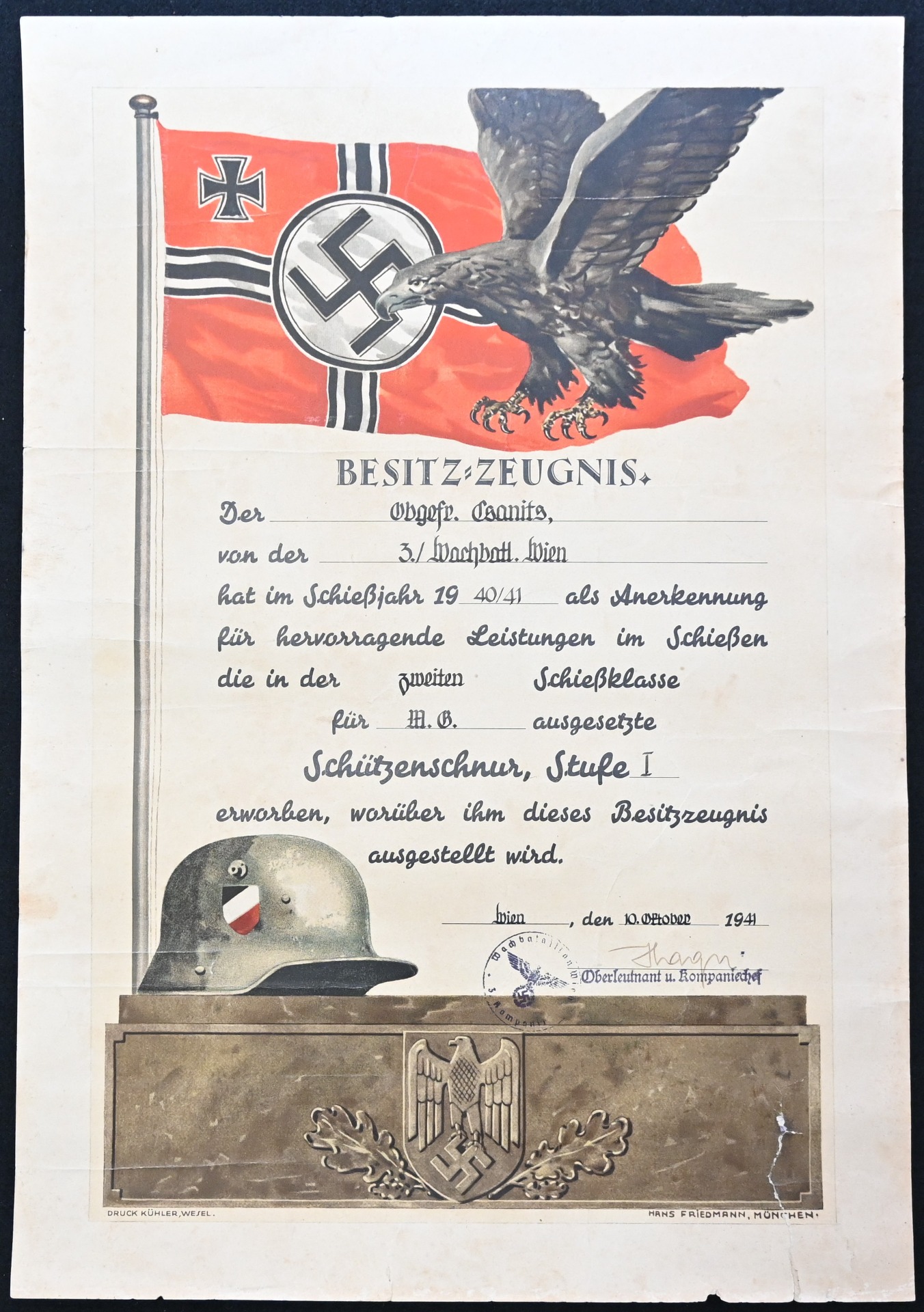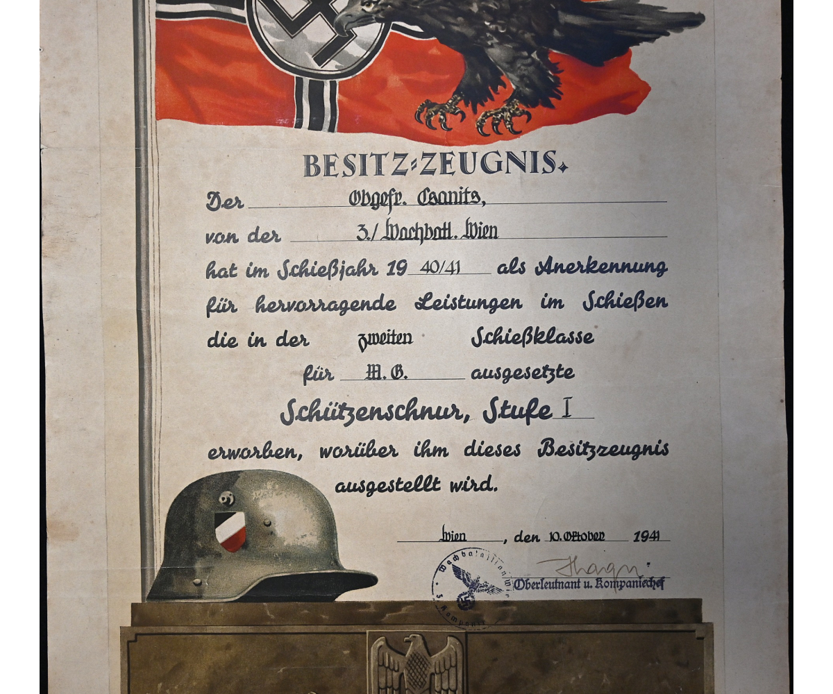 The document shows overall normal signs of wear. Mainly on the edges. On the bottom right corner it has a repair. It was issued to Obergefreiten Isanitz who served within the 3.Kompanie Wach-Bataillon Wien whom participated a MG shooting contest and earned the Schützenschnur or shooting lanyard. It's dated 10 October 1941.