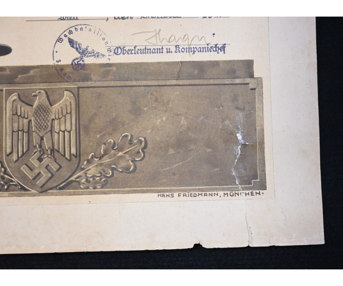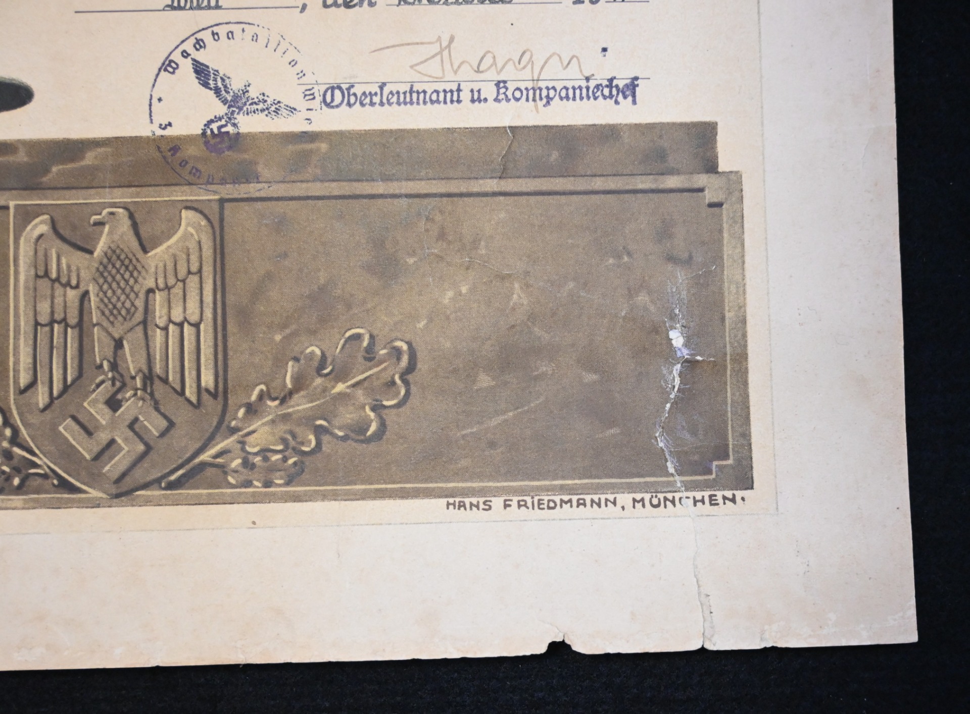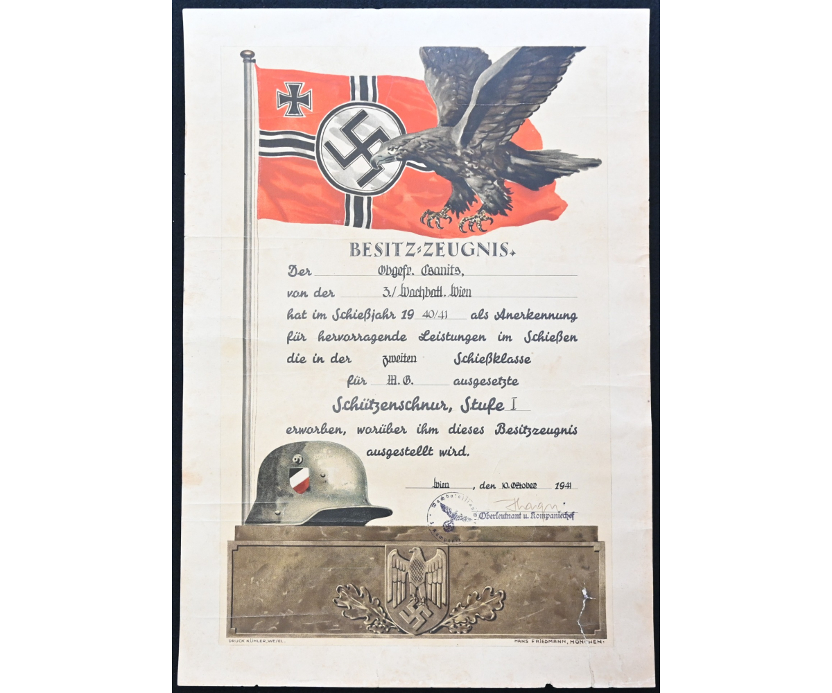 The document shows overall normal signs of wear. Mainly on the edges. On the bottom right corner it has a repair. It was issued to Obergefreiten Isanitz who served within the 3.Kompanie Wach-Bataillon Wien whom participated a MG shooting contest and earned the Schützenschnur or shooting lanyard. It's dated 10 October 1941.