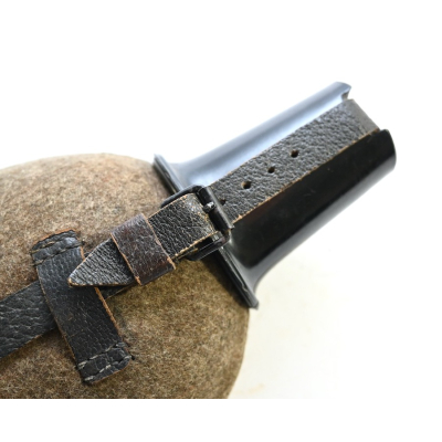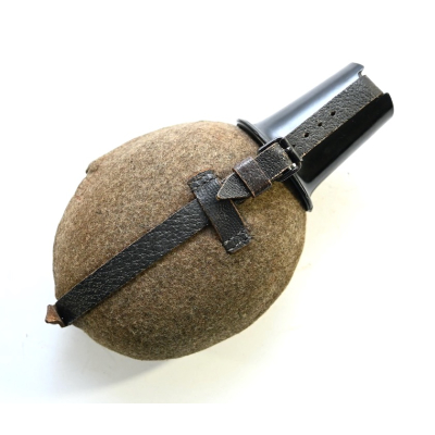 The cover is complete with the 4 buttons. Its in used but good condition (show 1 small hole on the back). The leather straps are present and supple. The canteen comes with a black '1944' dated bakelite canteen cup. The red alluminium lid and canteen are in good condition. The canteen is marked, but hard to read.