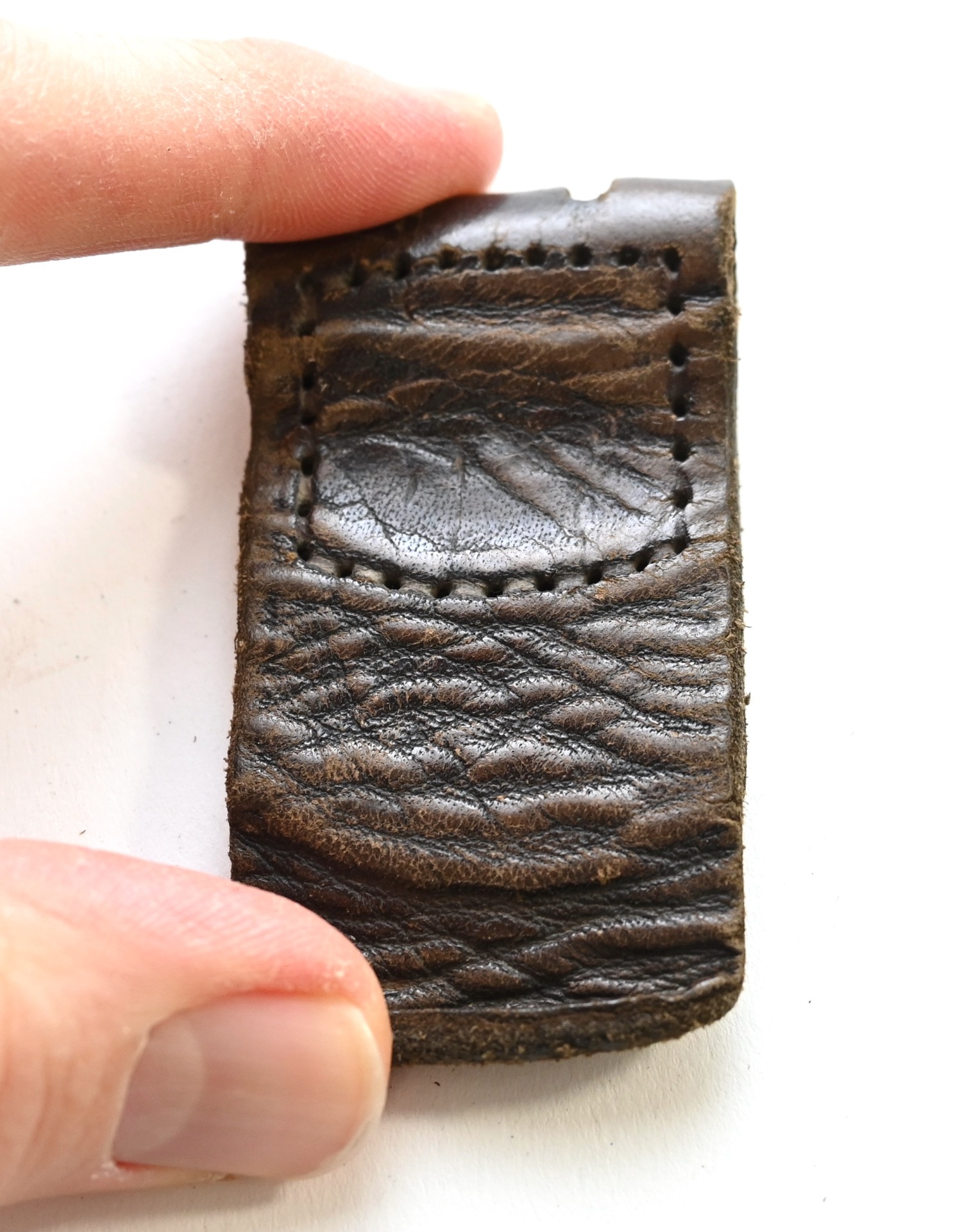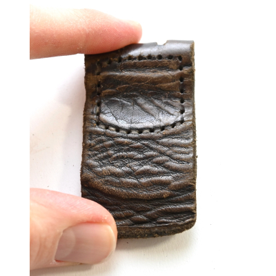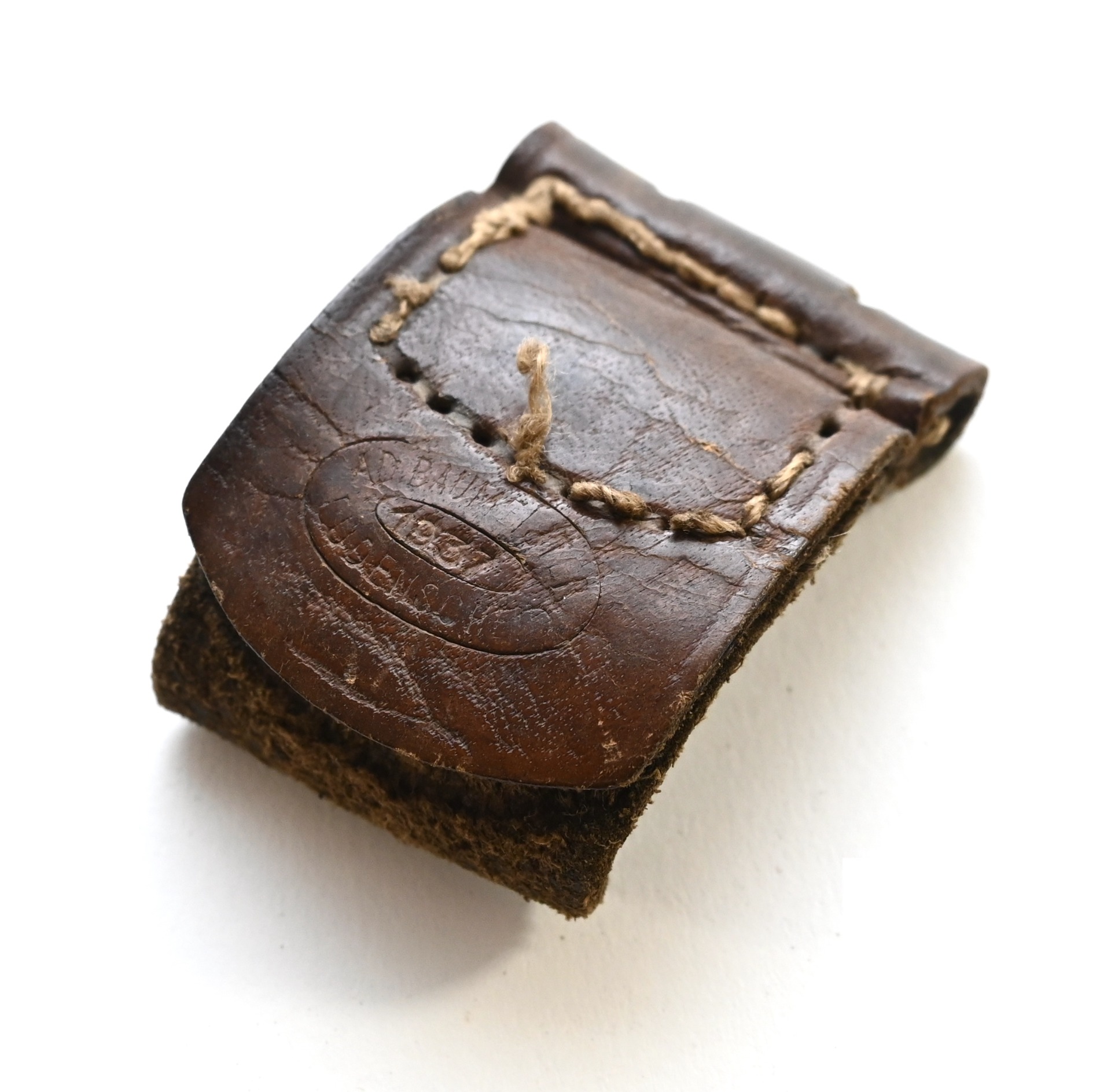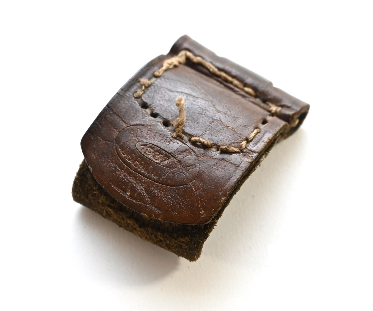 The tab shows overall signs of wear. The leather is supple and solid. Marked by maker 'A.D.Baumeister' from 'Lüdenscheid' and dated '1937'.