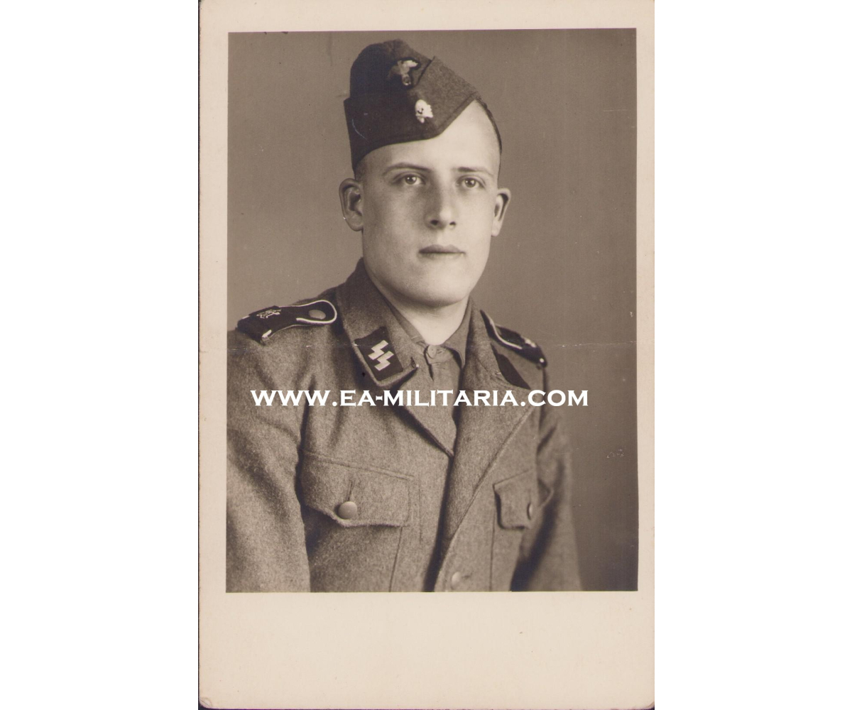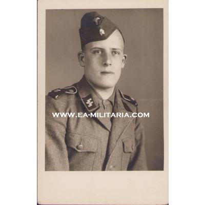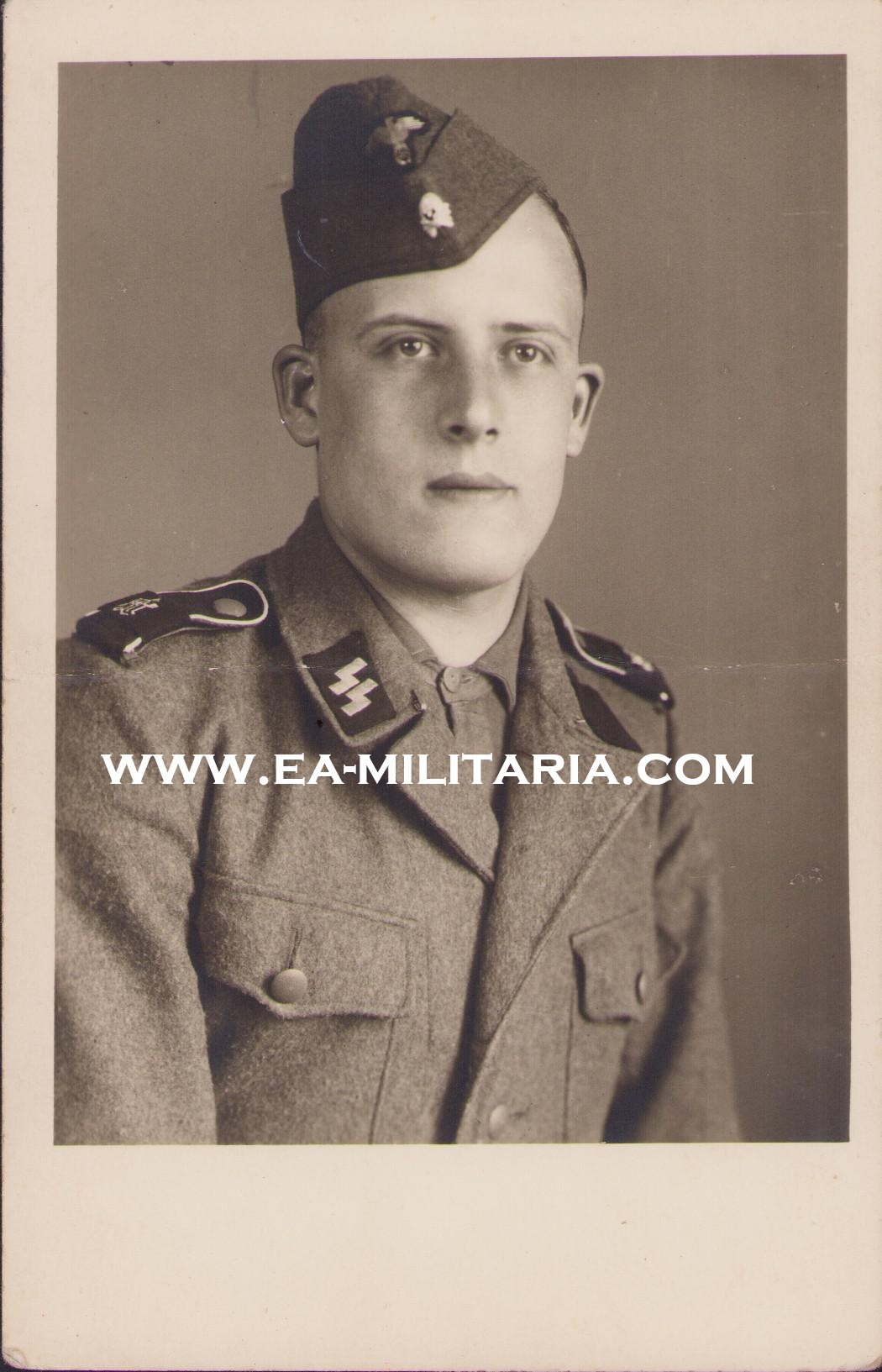 The photograph shows overall signs of wear. It was folded once, but it's solid. The soldier is wearing his combat tunic and side cap or 'Schiffchen'. The slip-ons on his shoulder-straps tells us he served within the Leibstandarte SS Adolf Hitler.