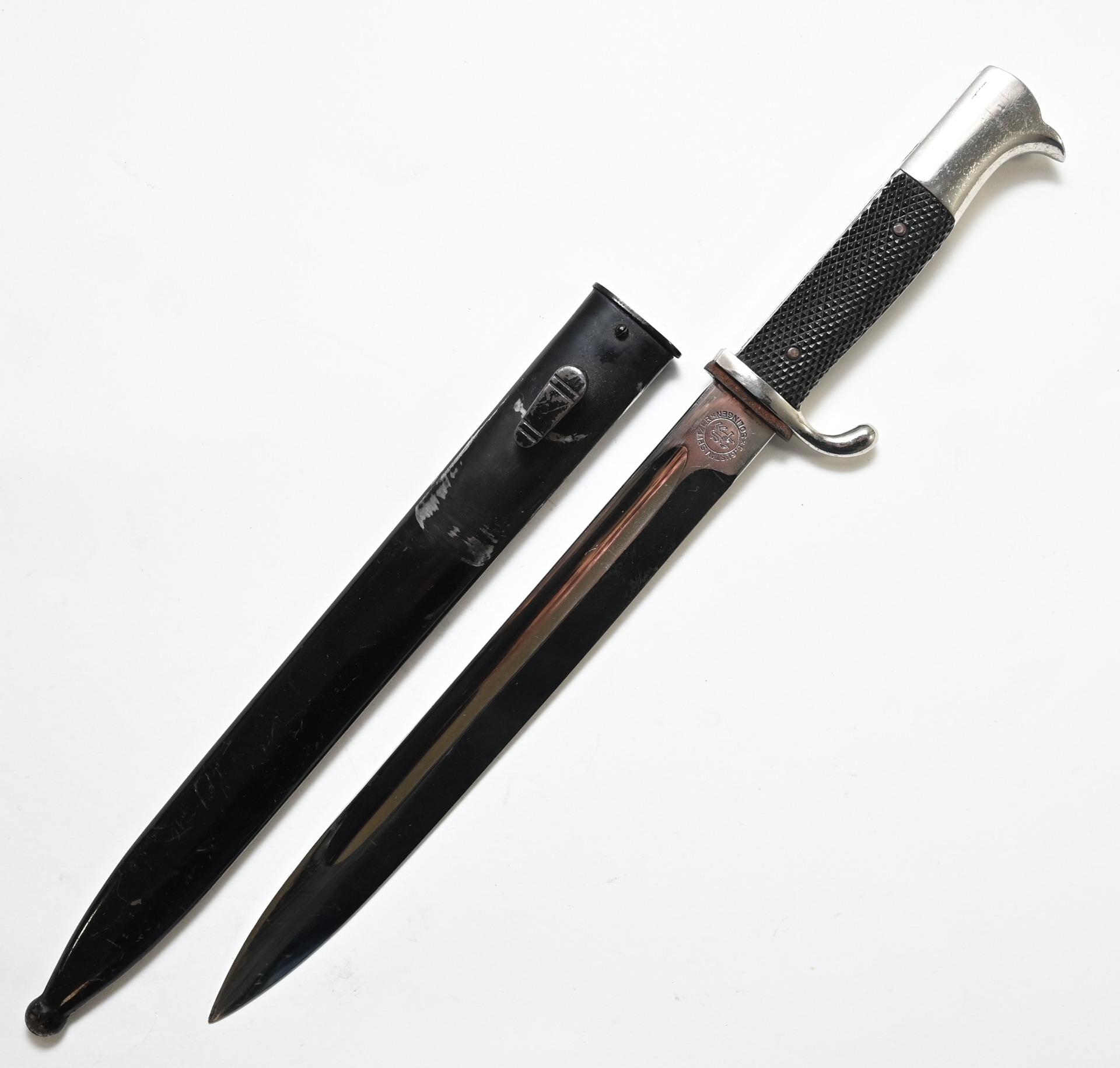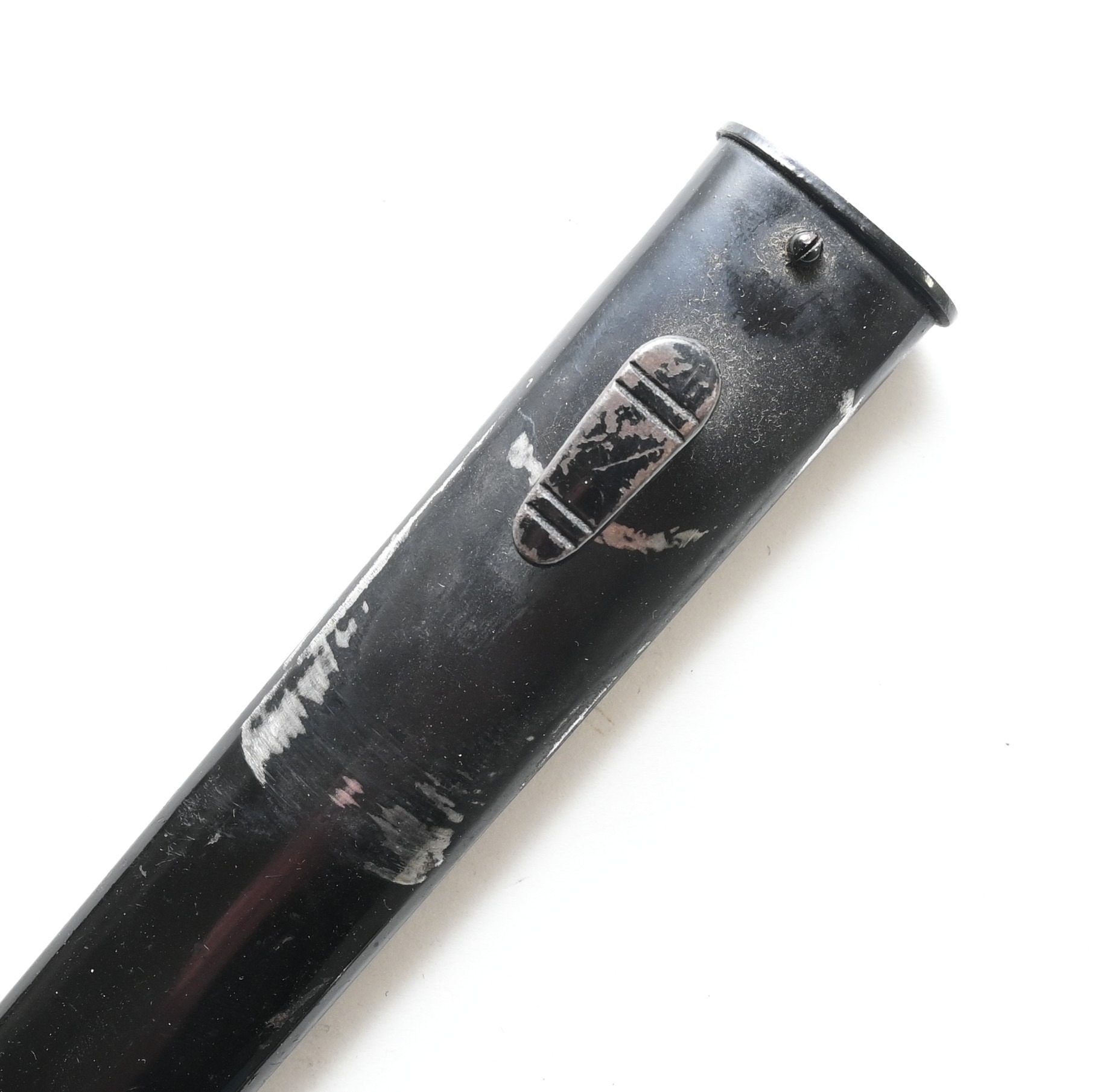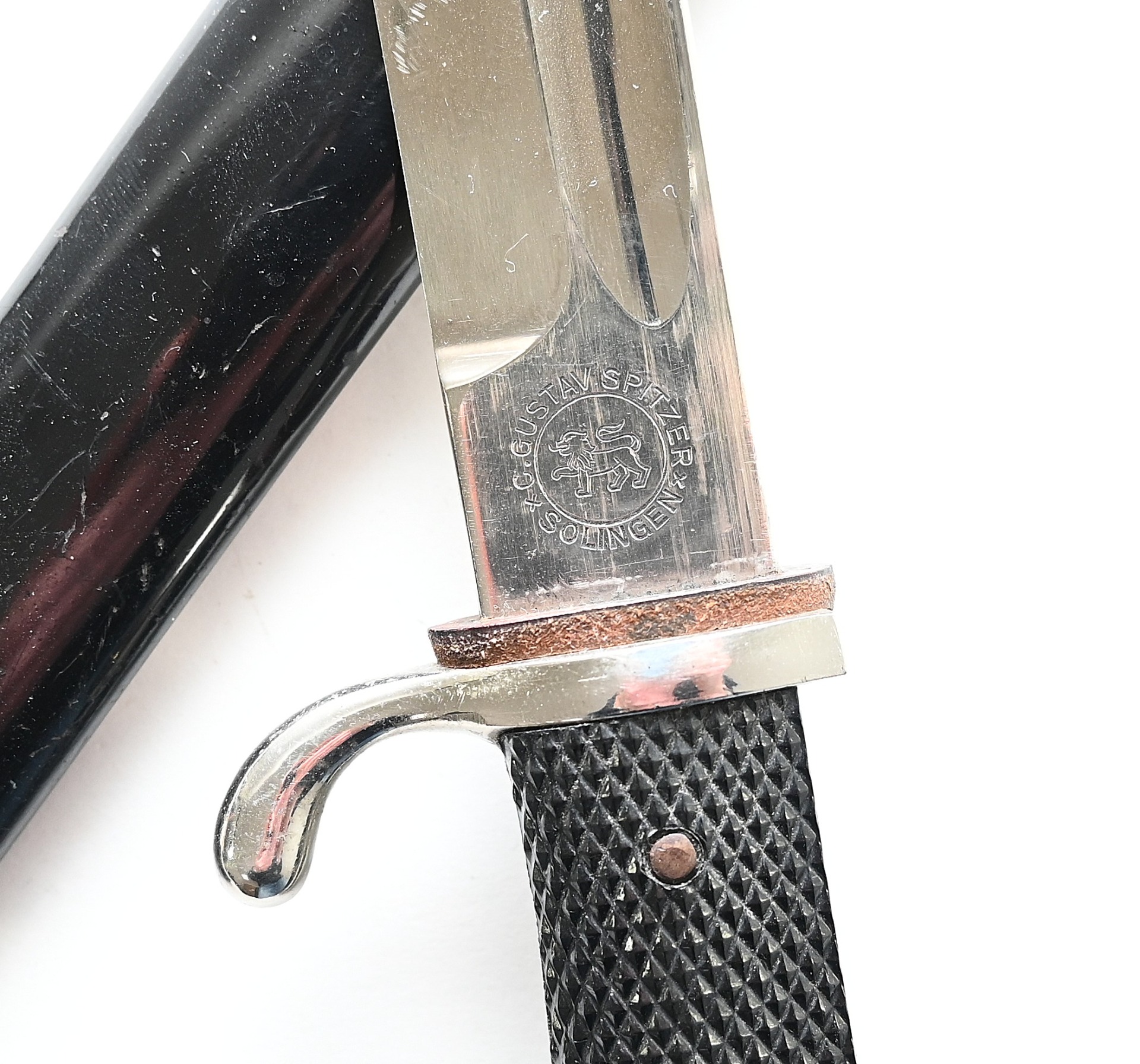 The set shows overall normal signs of wear. The scabbard contains almost all off its original black color. The blade is maker marked by ''C.Gustav Spitzer' from 'Solingen'. This is the long version of the dress/parade bayonet.