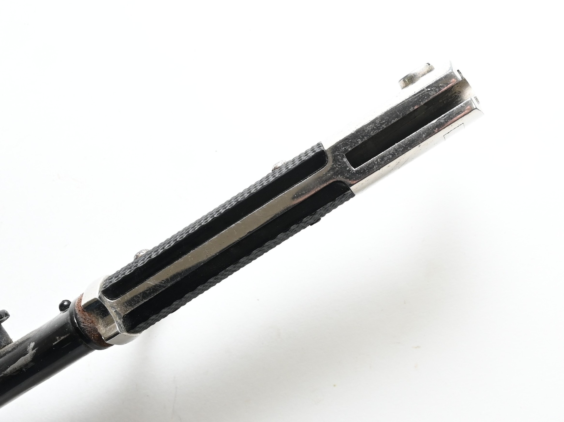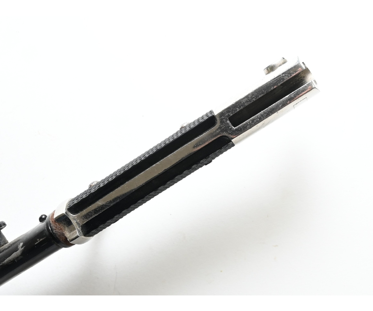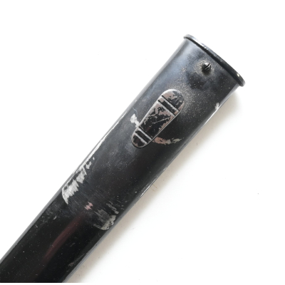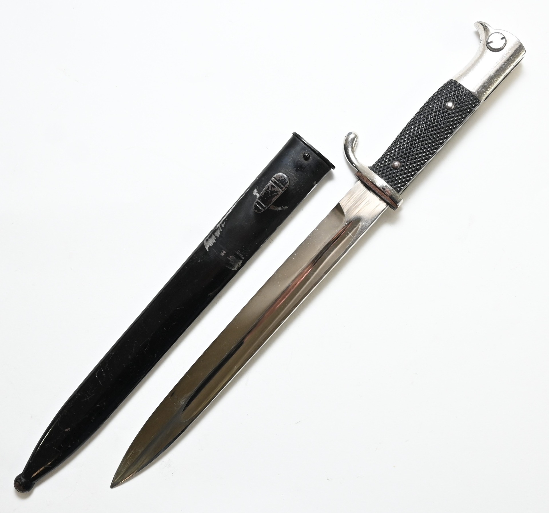 The set shows overall normal signs of wear. The scabbard contains almost all off its original black color. The blade is maker marked by ''C.Gustav Spitzer' from 'Solingen'. This is the long version of the dress/parade bayonet.