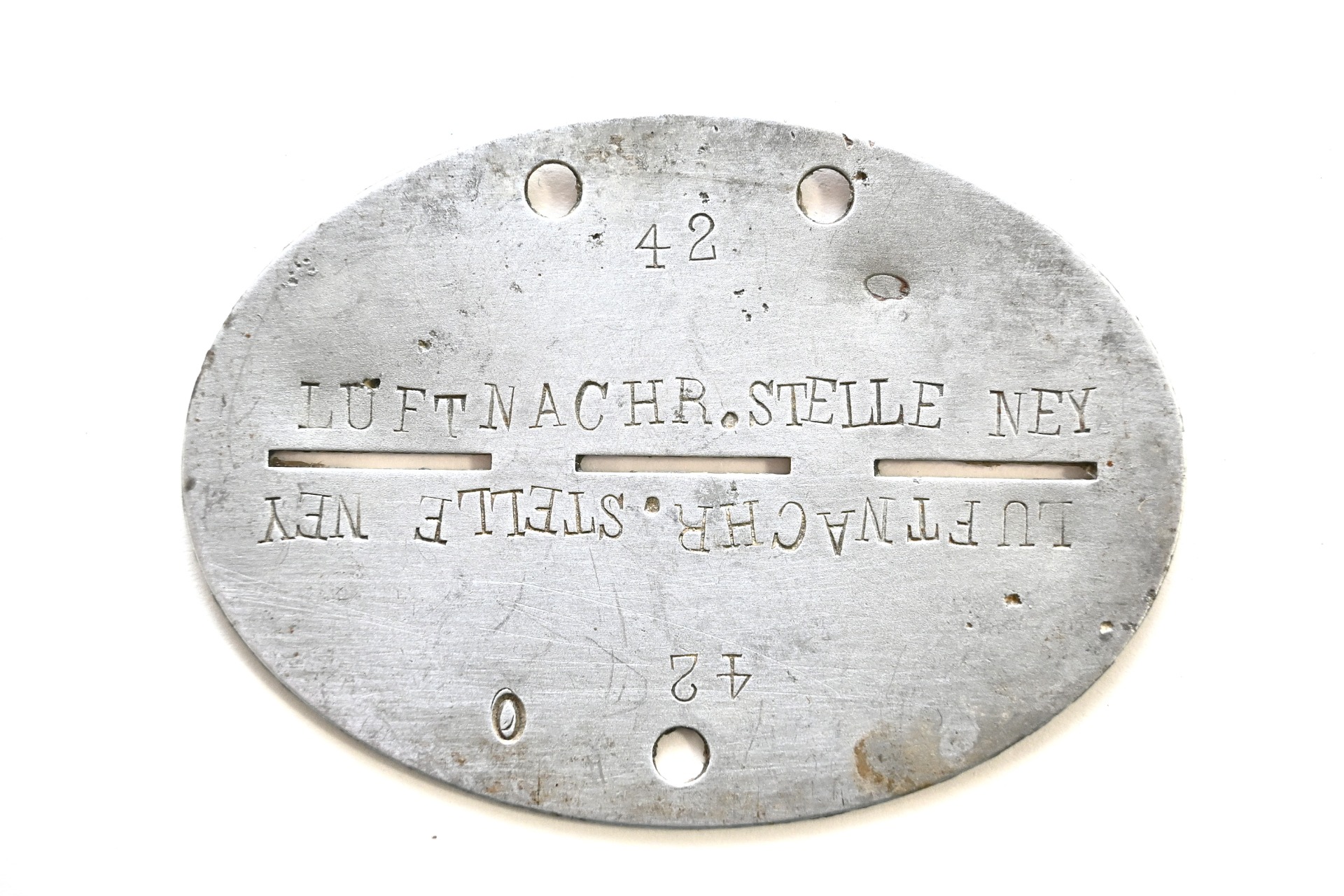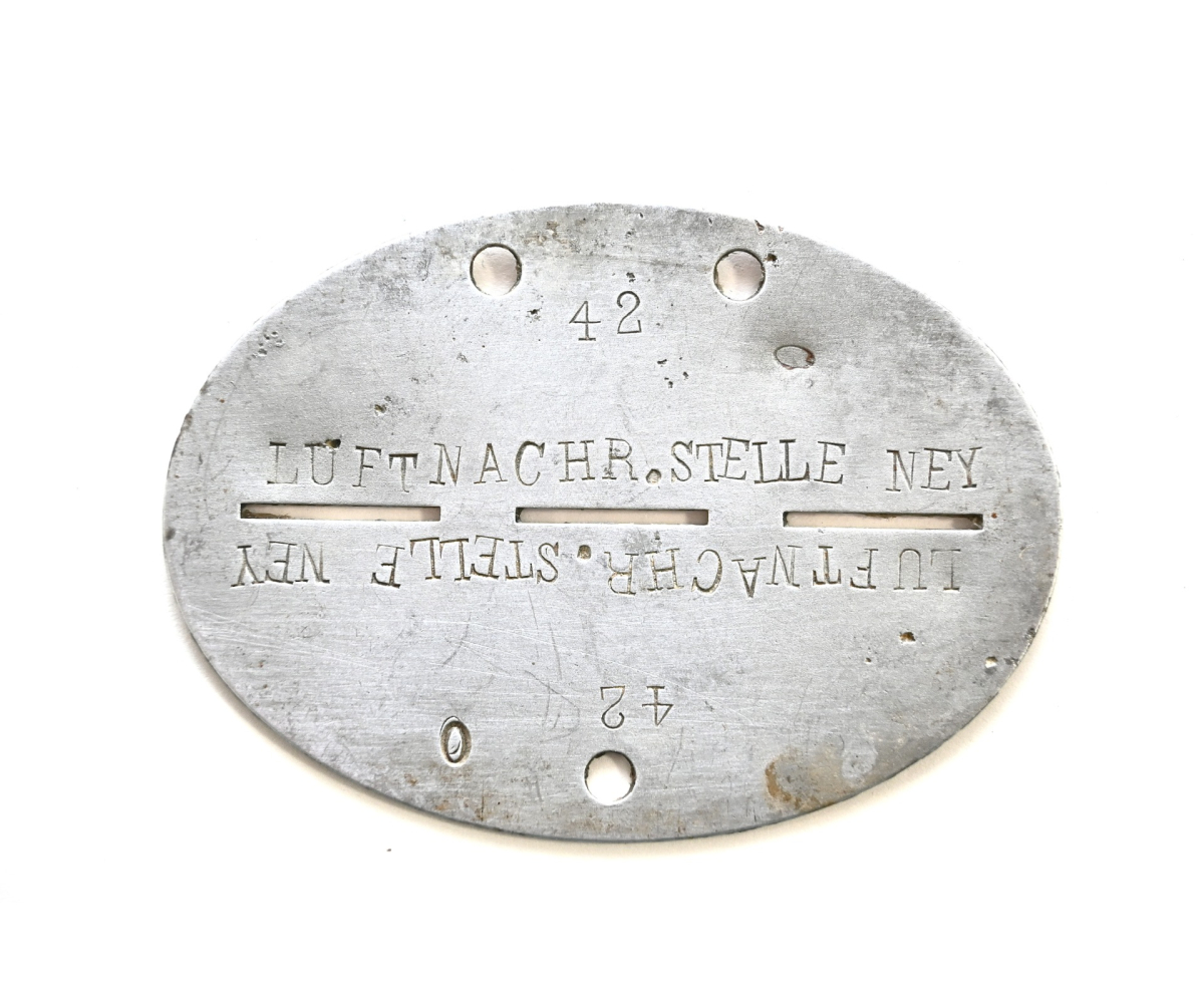 The tag or 'Erkennungsmarke' shows overall normal signs of wear. It belonged to a soldier who served within the Luftnachrichten Stelle (Seefliegerhorst) Norderney. This airfield was formed in 1914 during the First World War. In 1937 the Küstenfliegergruppe 106 was stationed here and later also the Seenotstaffel 1.