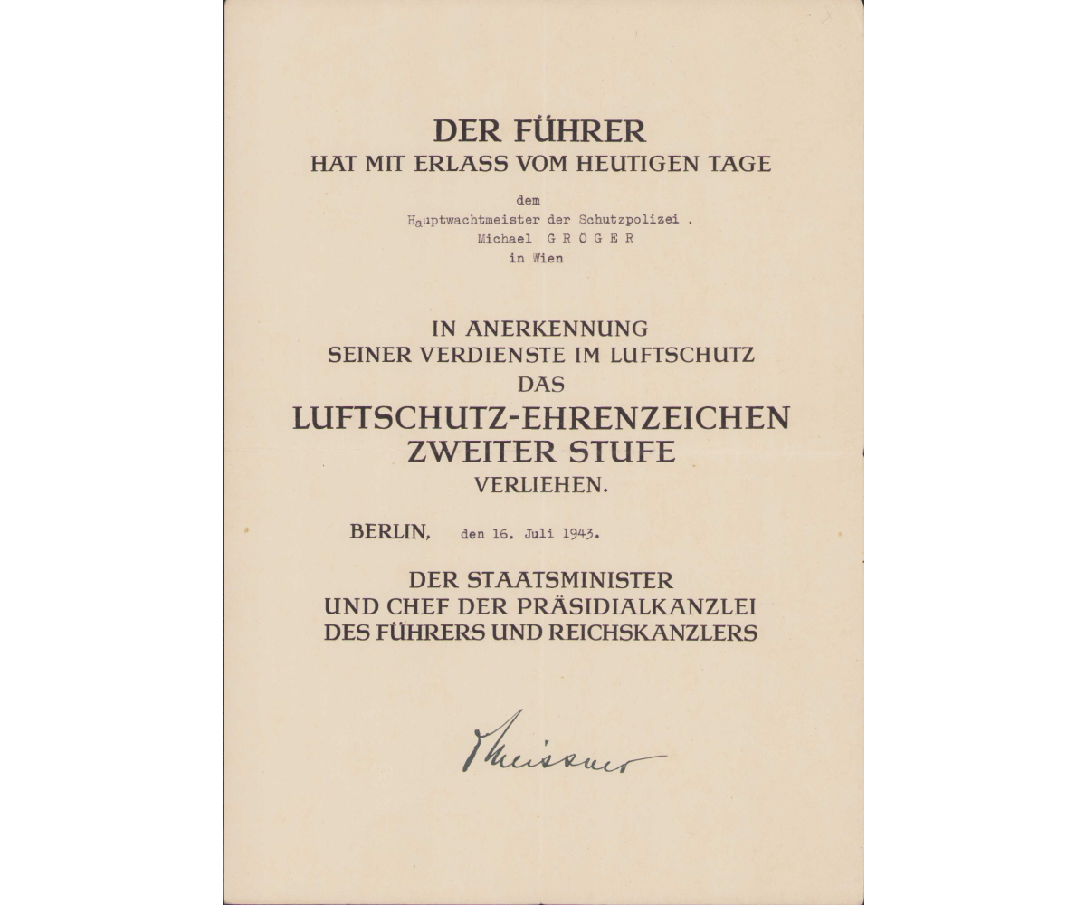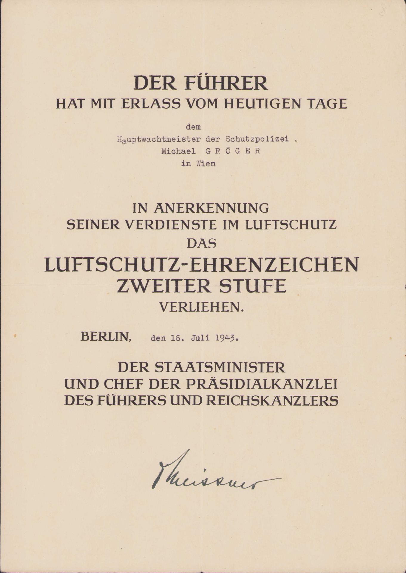 The document shows overall normal signs of wear. The medal was awarded to Hauptwachtmeister der Schutzpolizei Michael Gröger from Wien (Vienna). The medal was issued on the 16th of July 1943.