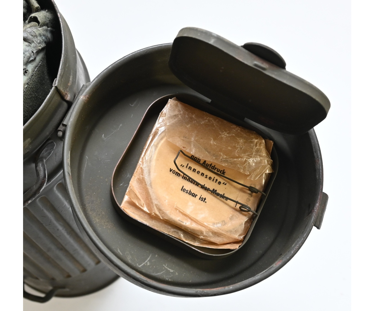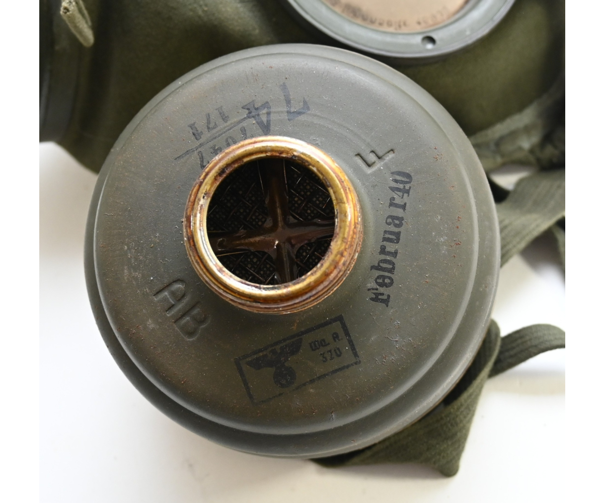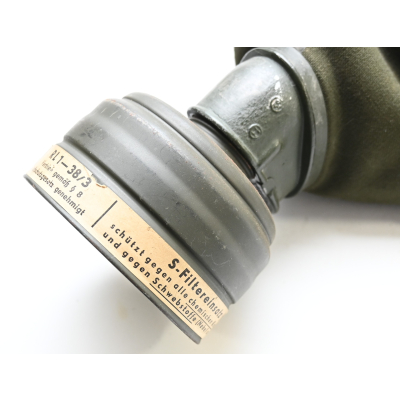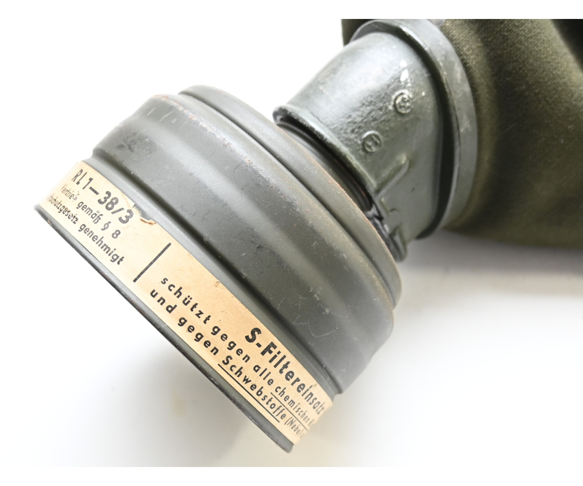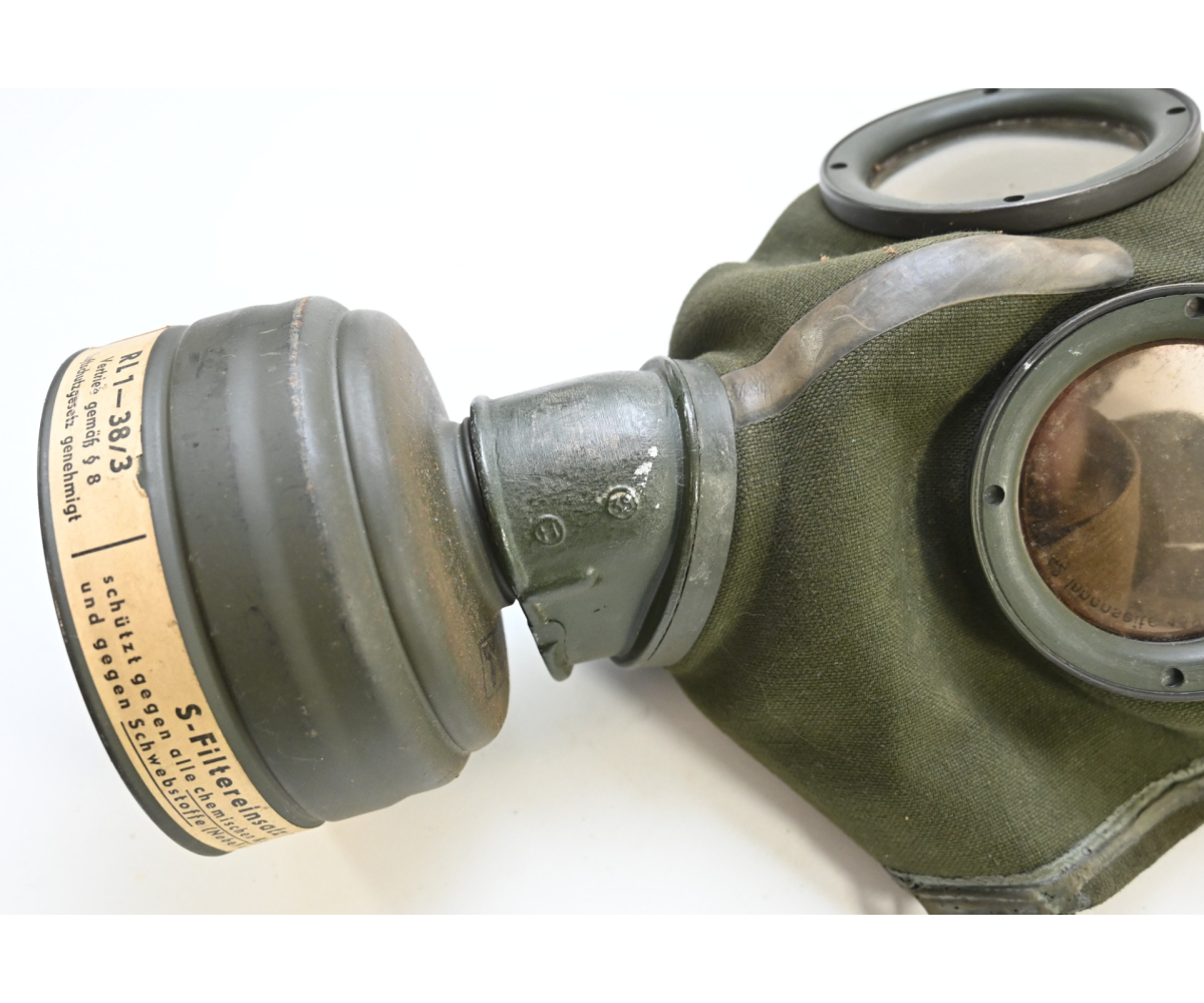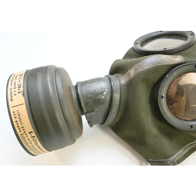 The set shows overall minor signs of wear. The canister contains all of its original paint. Named on the bottom 'Scholz'. The mask is made out of canvas and is still supple and in super conditon. it's dated 1939. Complete with all straps. The label on the filter is intact and the filter is marked with multiple stamps.