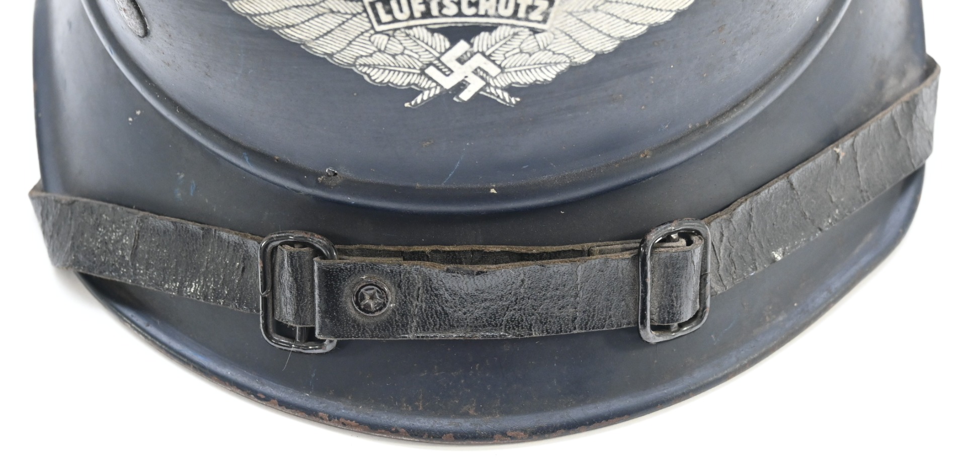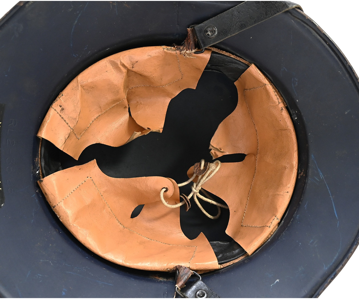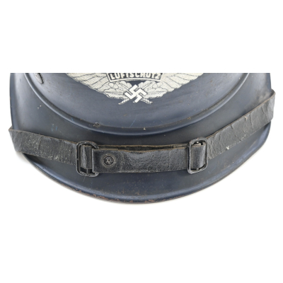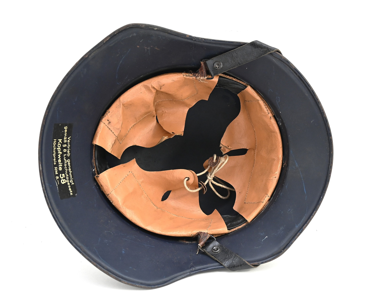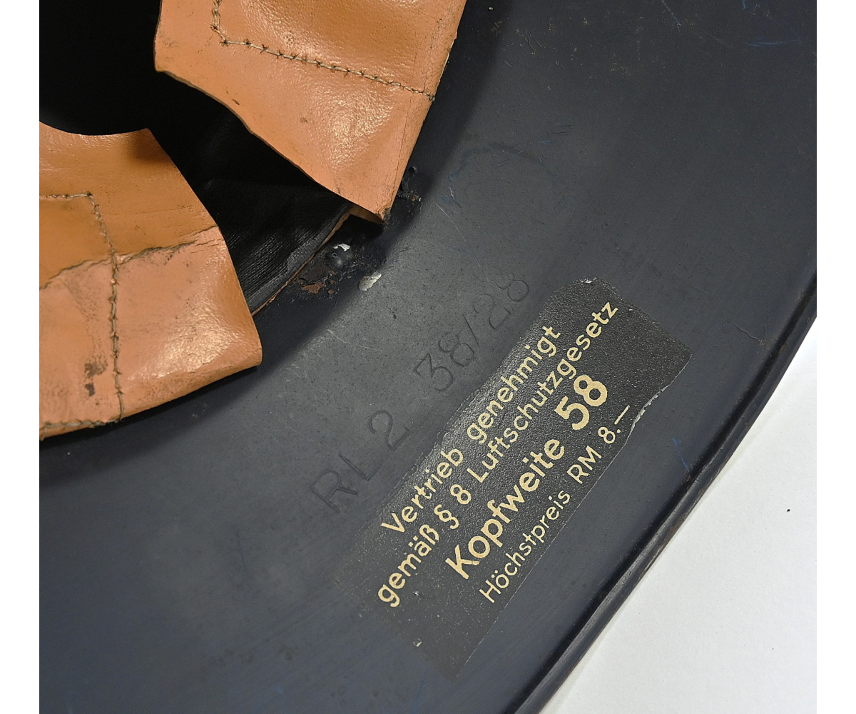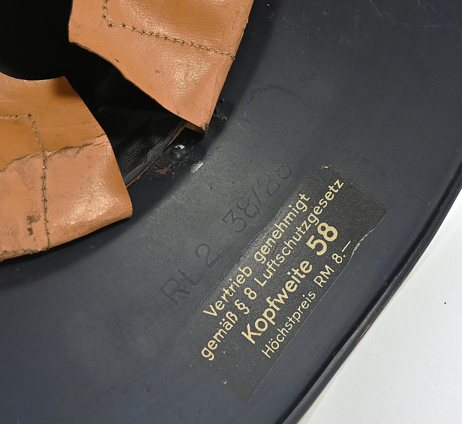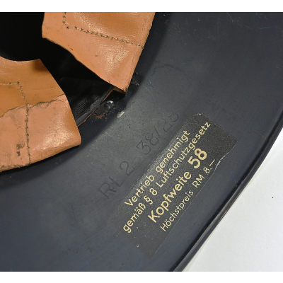 The helmet shows overall normal signs of wear. All of its original blue color present and the decal is intact. It's complete with the black leather chin strap and the liner is also present. The liner shows some signs of wear. The draw string is present. The helmet is marked 'RL2-38/28' , size marked '58'. and marked 'Hochstpreis Rm.8'.