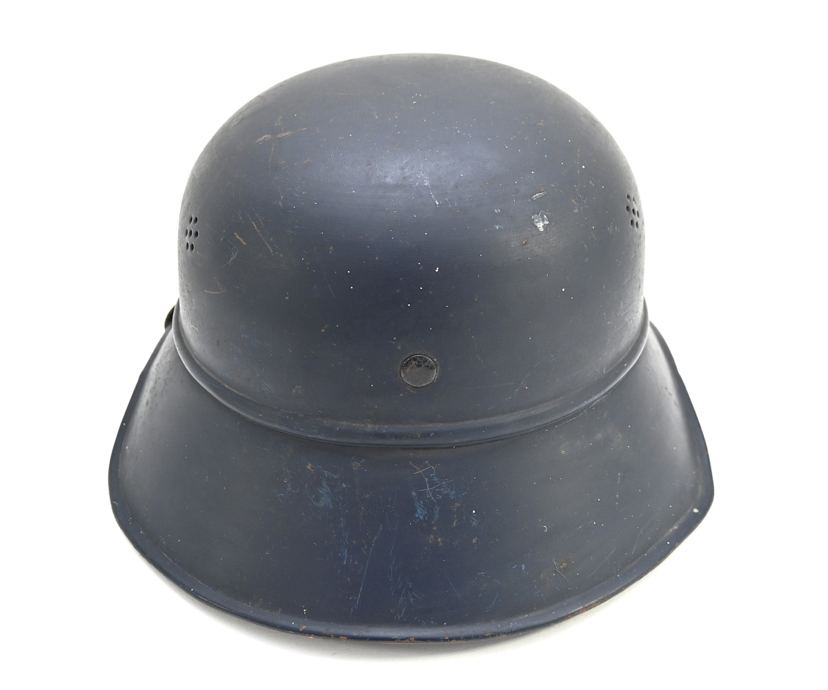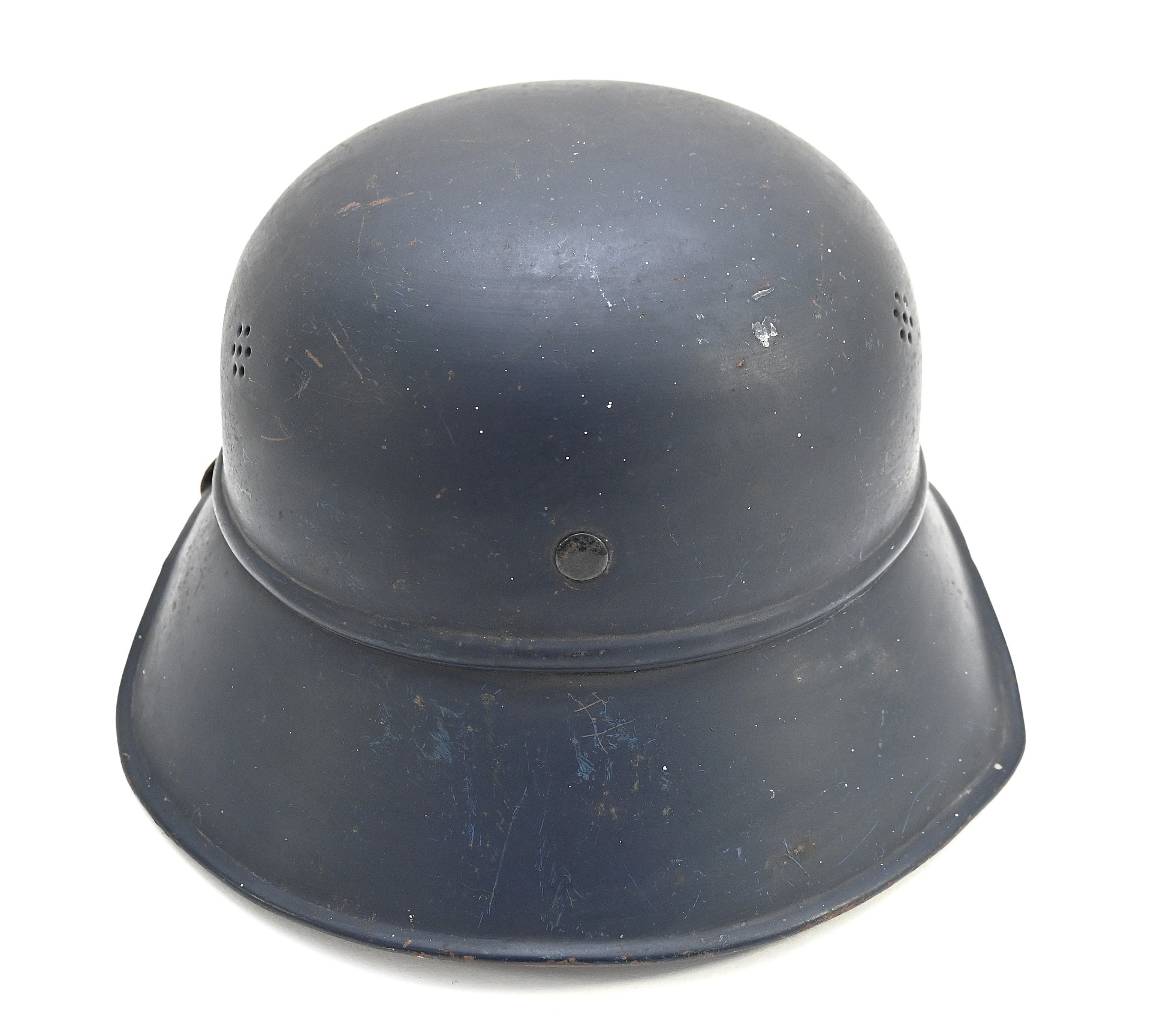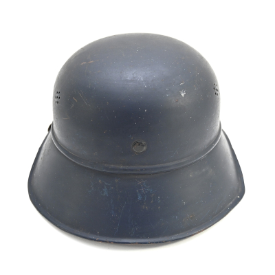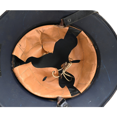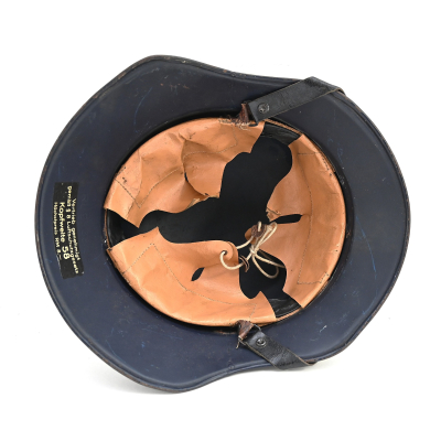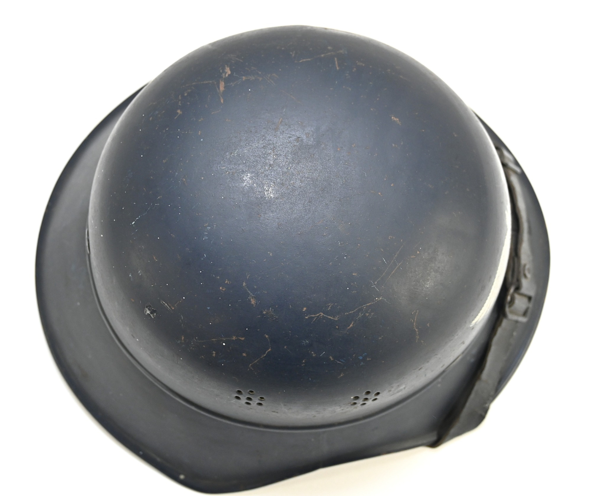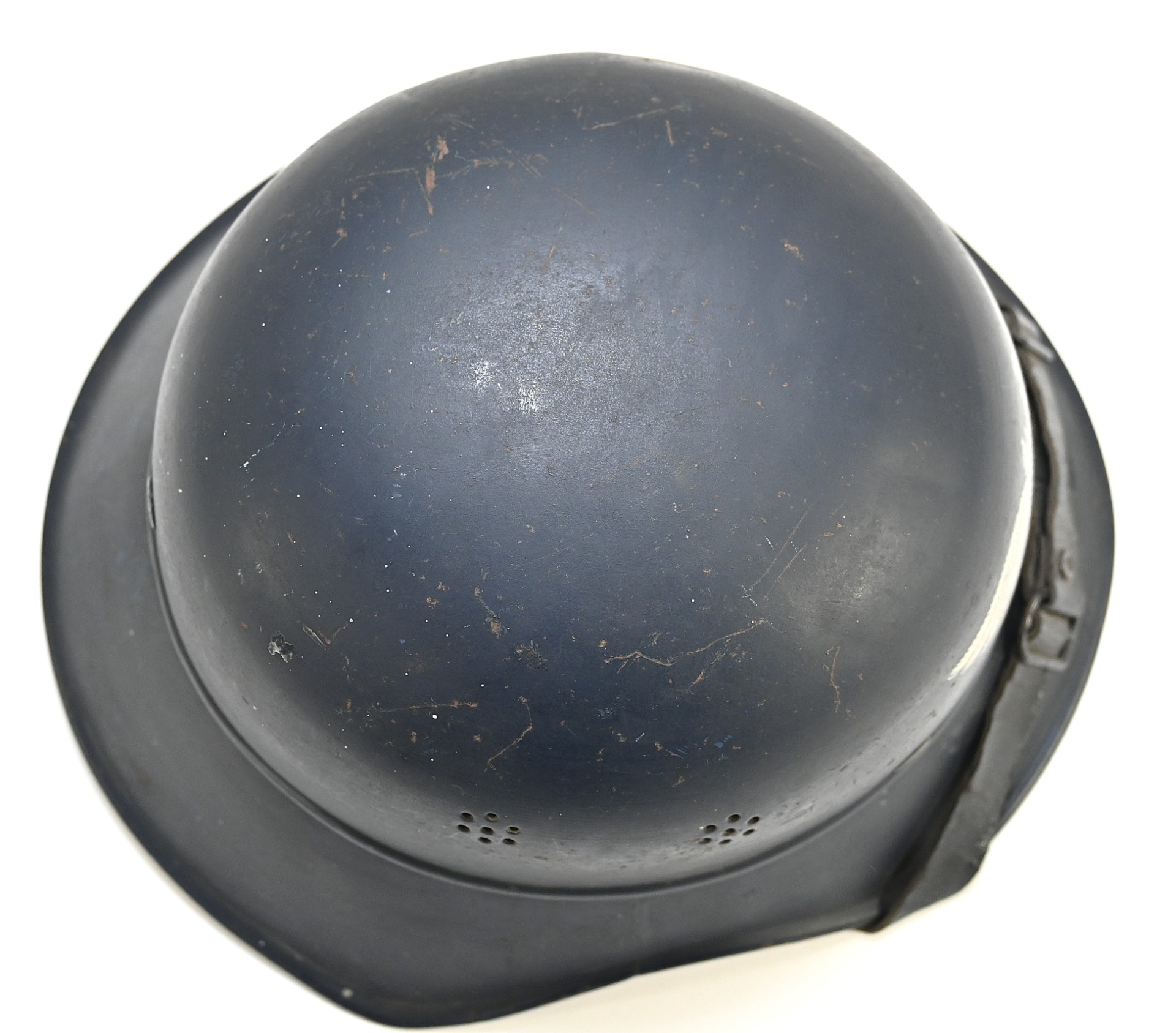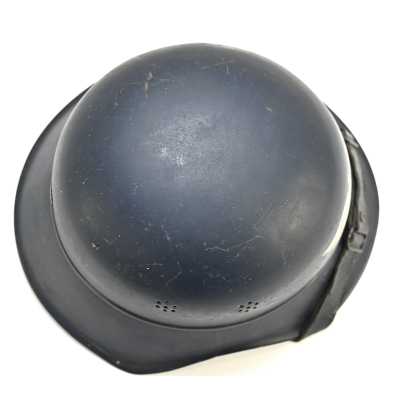 The helmet shows overall normal signs of wear. All of its original blue color present and the decal is intact. It's complete with the black leather chin strap and the liner is also present. The liner shows some signs of wear. The draw string is present. The helmet is marked 'RL2-38/28' , size marked '58'. and marked 'Hochstpreis Rm.8'.