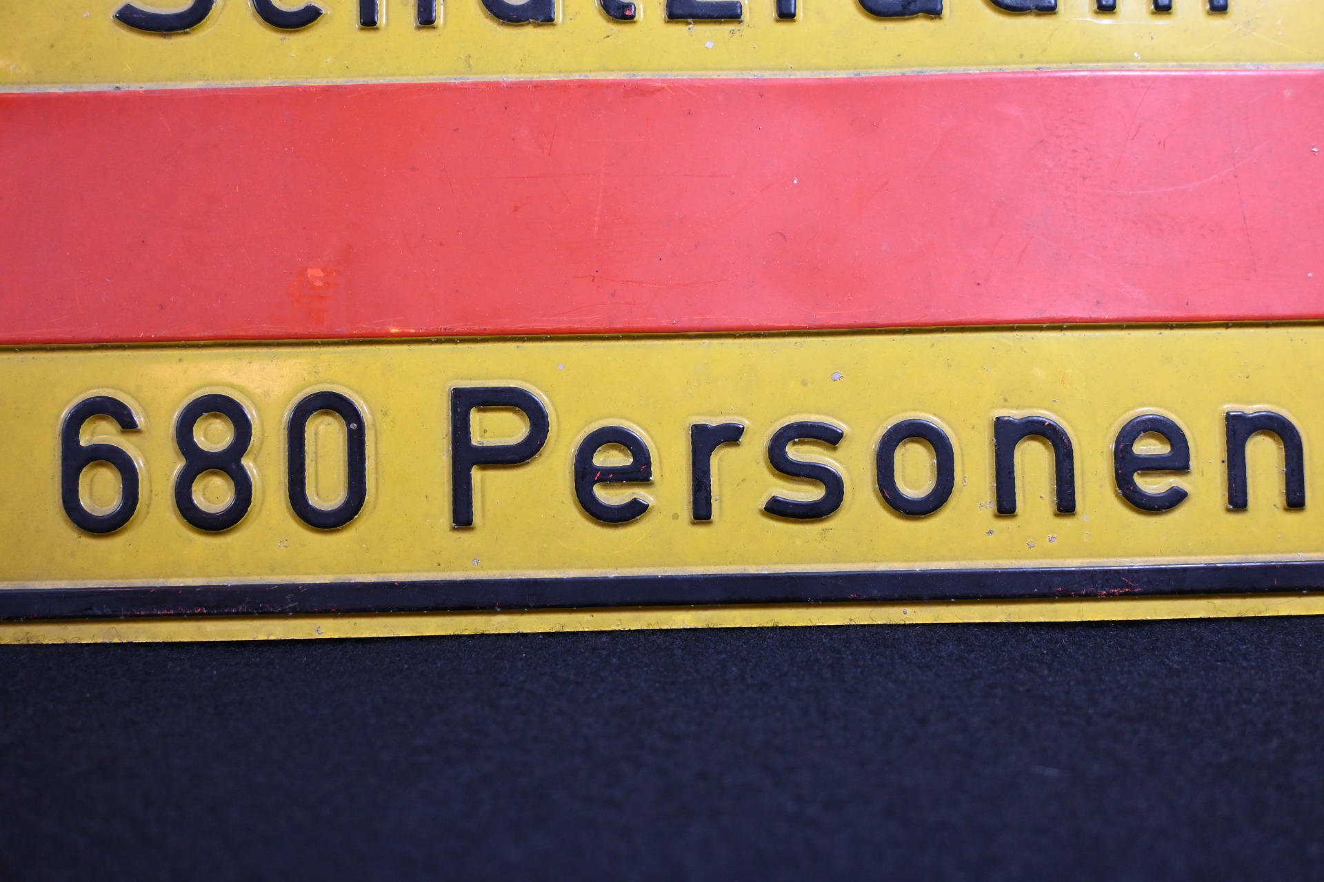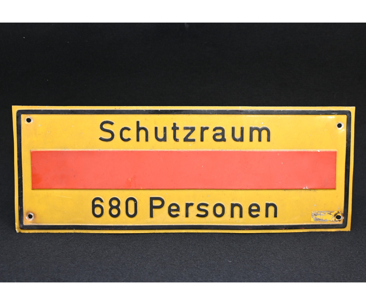 The sign shows overall signs of wear. Has a lovely overall patina. It has not been cleaned. A sign like this would have hung abov the entrance of a airraid bunker with a capacity for 680 persons. It measures approx. 40cms*15cms.