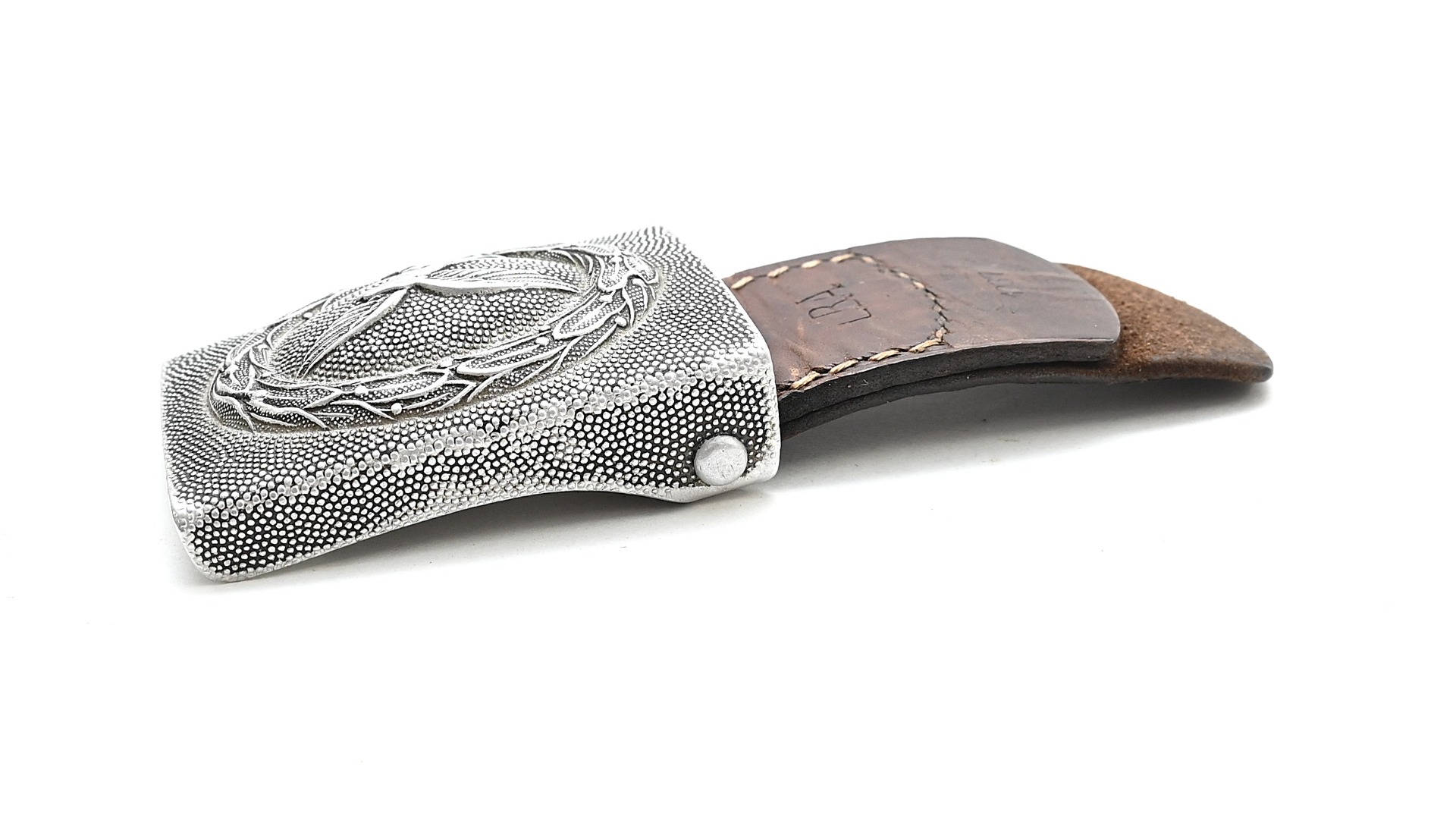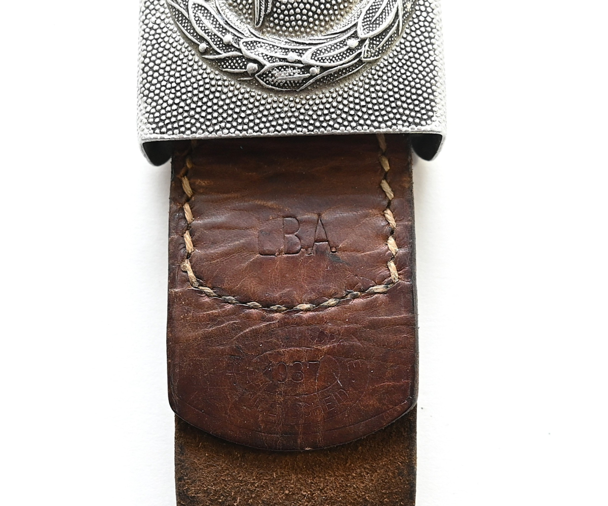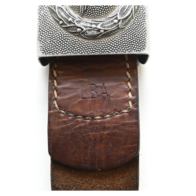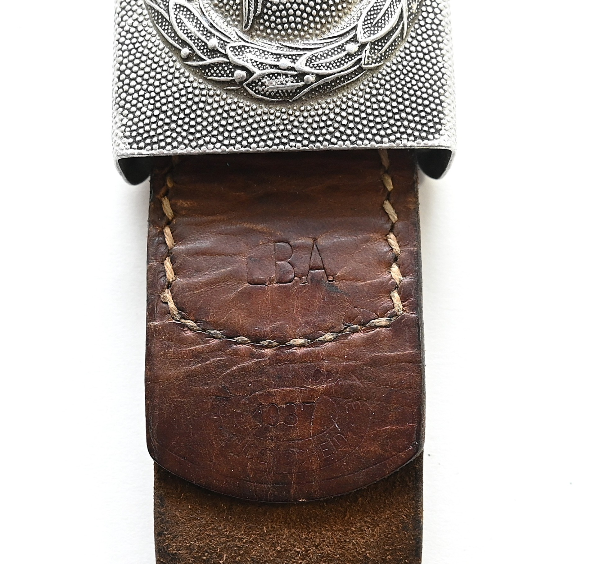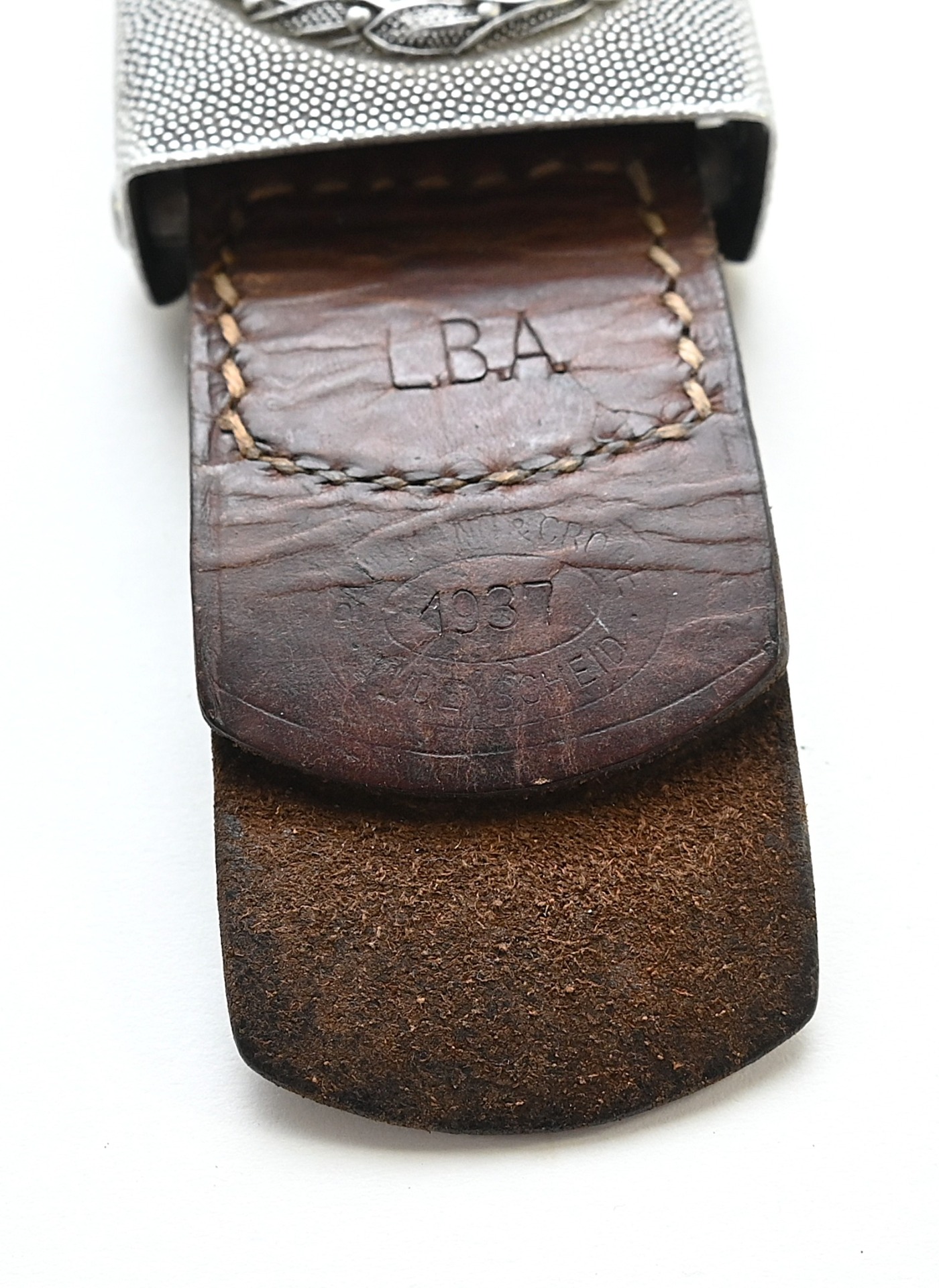 The buckle shows overall normal signs of wear. It's nicely marked with the company logo. It comes with its supple leather tab and is also marked by the maker 'Paulmann & Crone' from Lüdenscheid and dated 1937. The tab is also marked with 'LBA' which stands for Luftwaffe Bekleidungsamt.