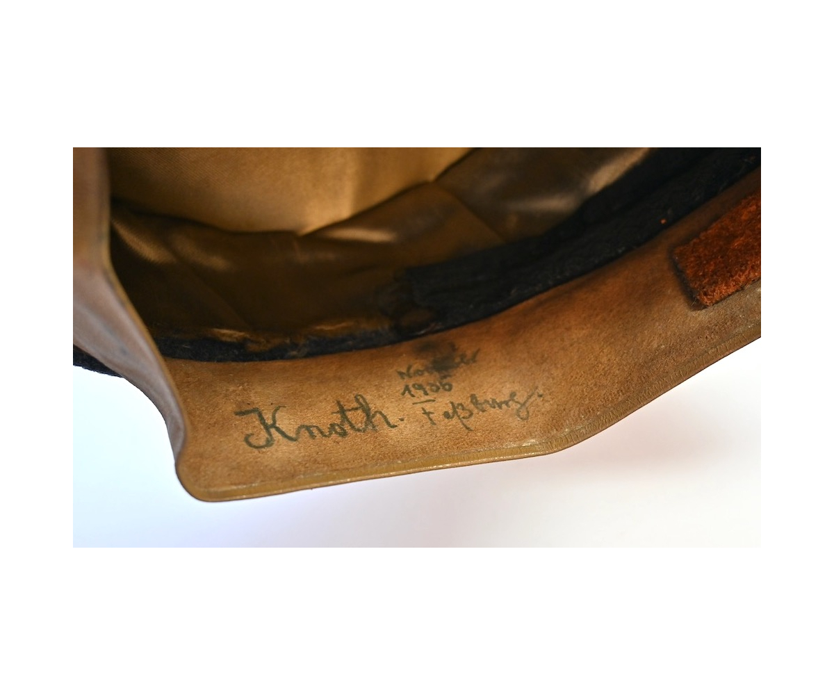 The inside shows signs of wear. Both the sweatband and leather visor are present. Behind the sweatband on the visor side is an extra piece of fabric, which was probably used for a small repair. The leather sweatband is marked/named on the inside.