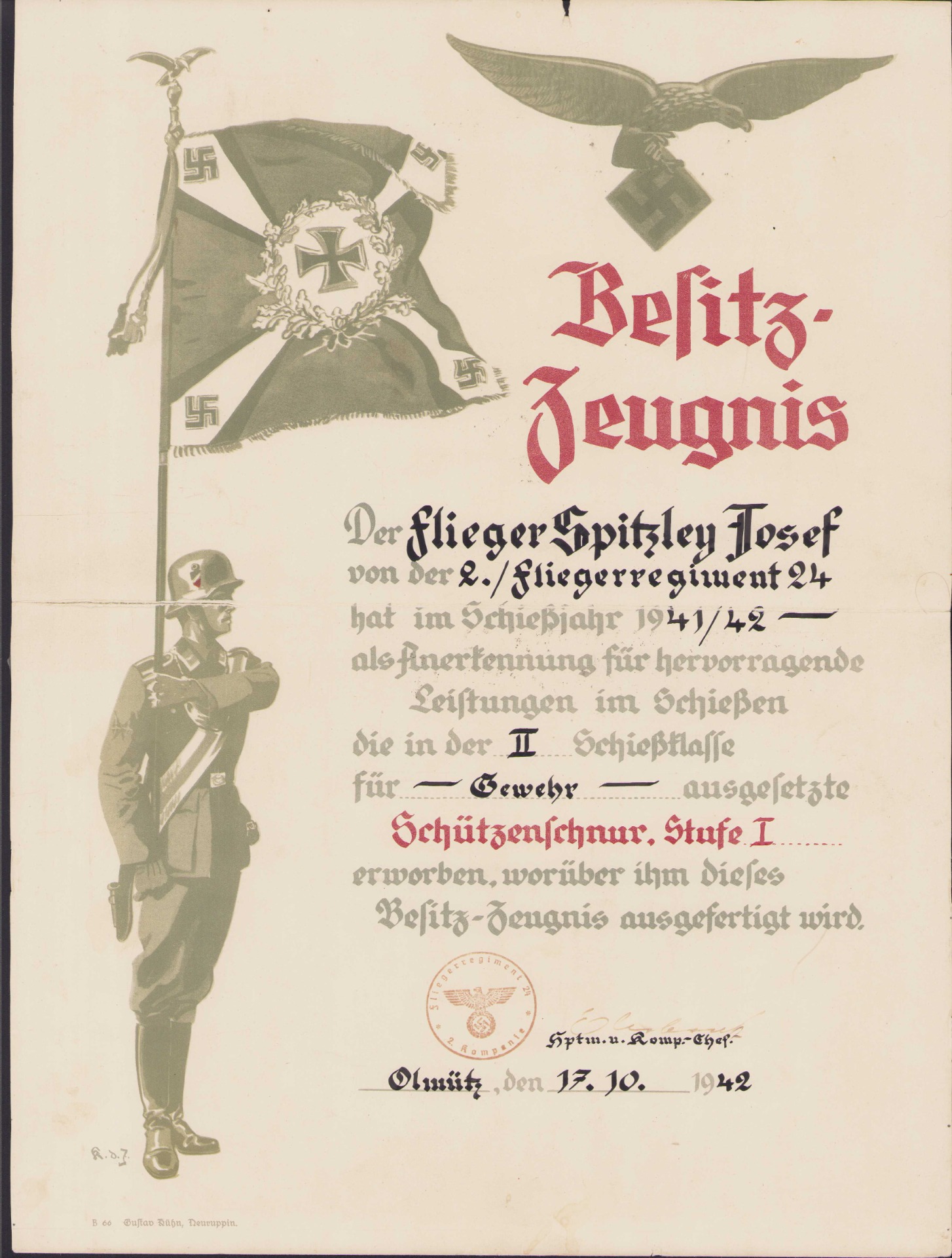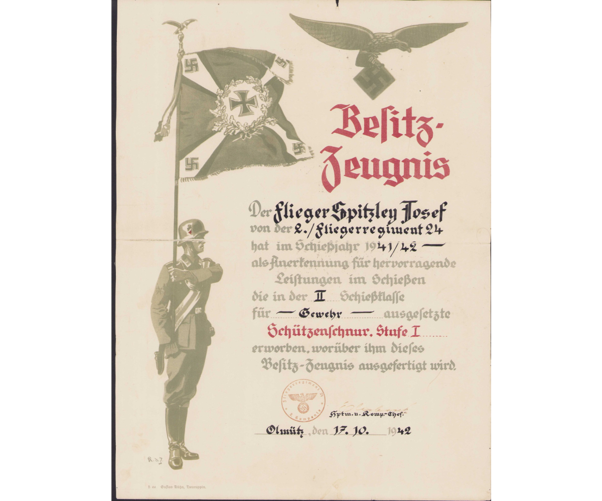 The document shows overall signs of wear. Folded in the middle and a old repair on the (left) back. The shooting lanyard was earned by Flieger Josef Spitzley who served in the 2.Kompanie Flieger Regiment 42. It's datd 17 October 1942.