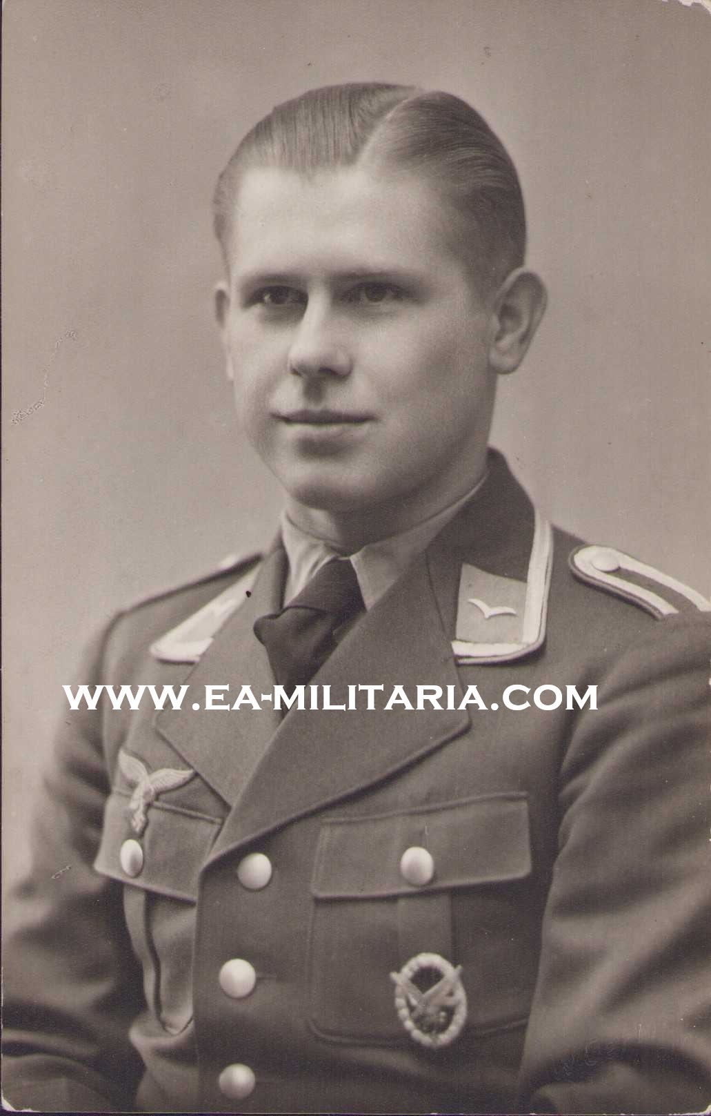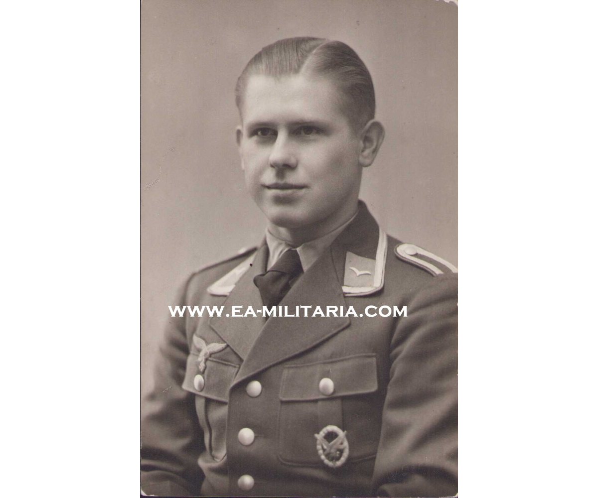 The photo shows overall normal signs of storage wear. The soldier is wearing his Viertaschenrock. The medal on his left chest is a Air Gunner Badge or 'Fliegerschutzenabzeichen mit Blitzbündel'.