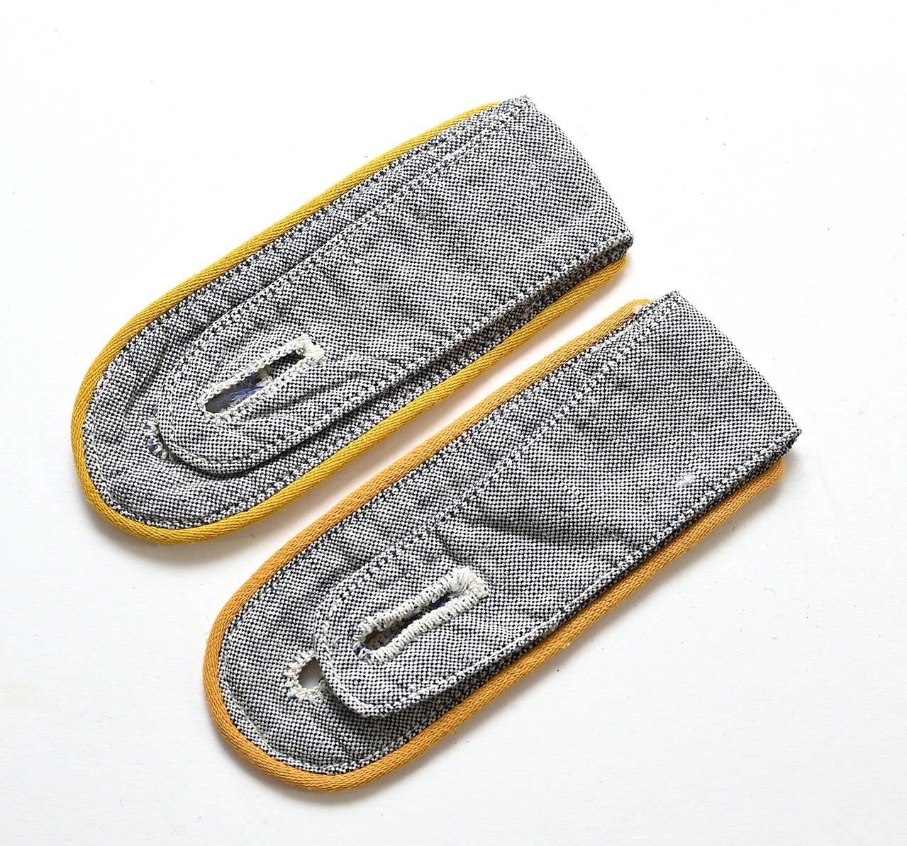 The set shows overall normal signs of wear. No damages whatsoever. There is a bit of discolor in the yellow piping, however they came with a lot of other stuff from the same household. The length of the straps is approx. 10cms.