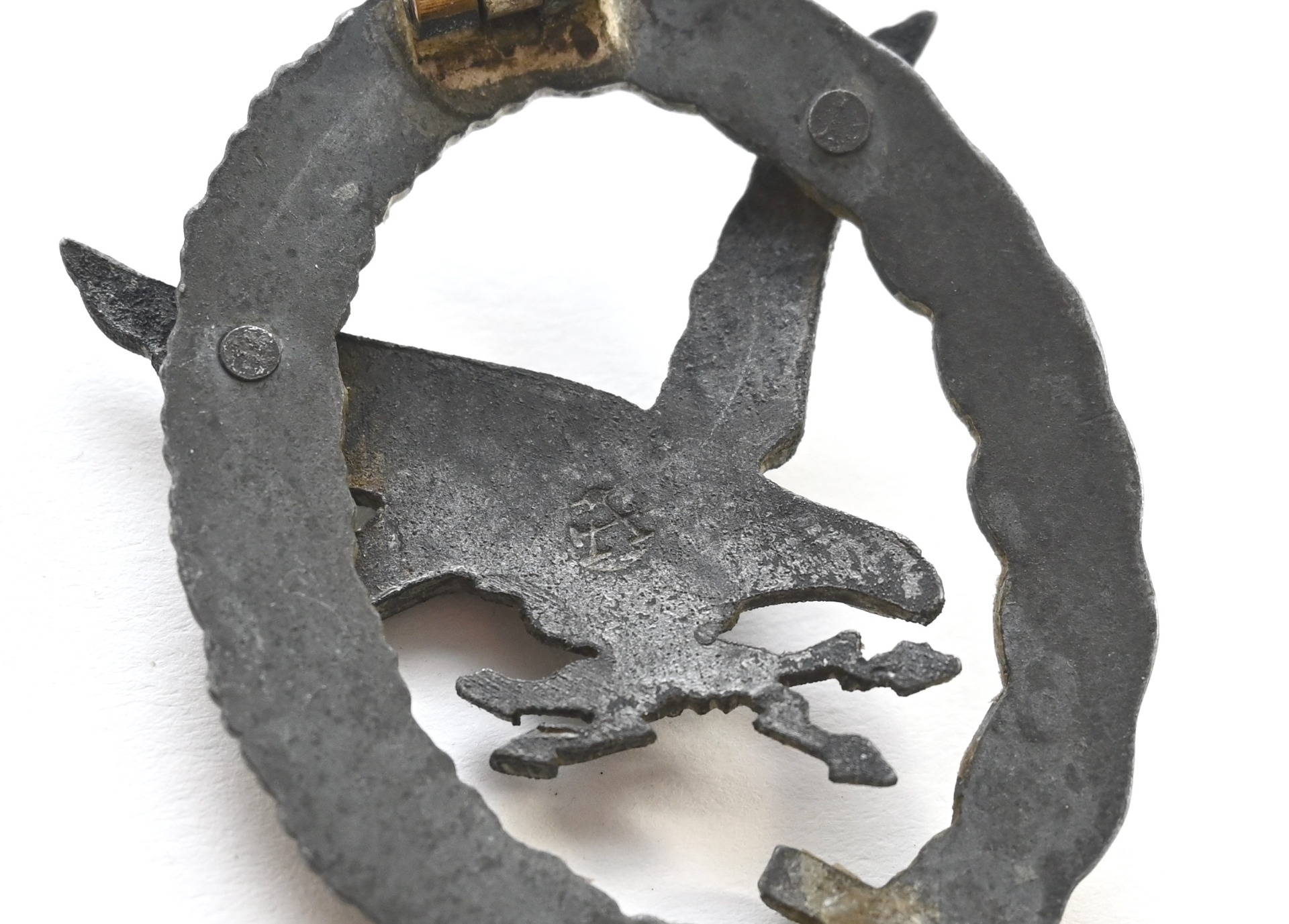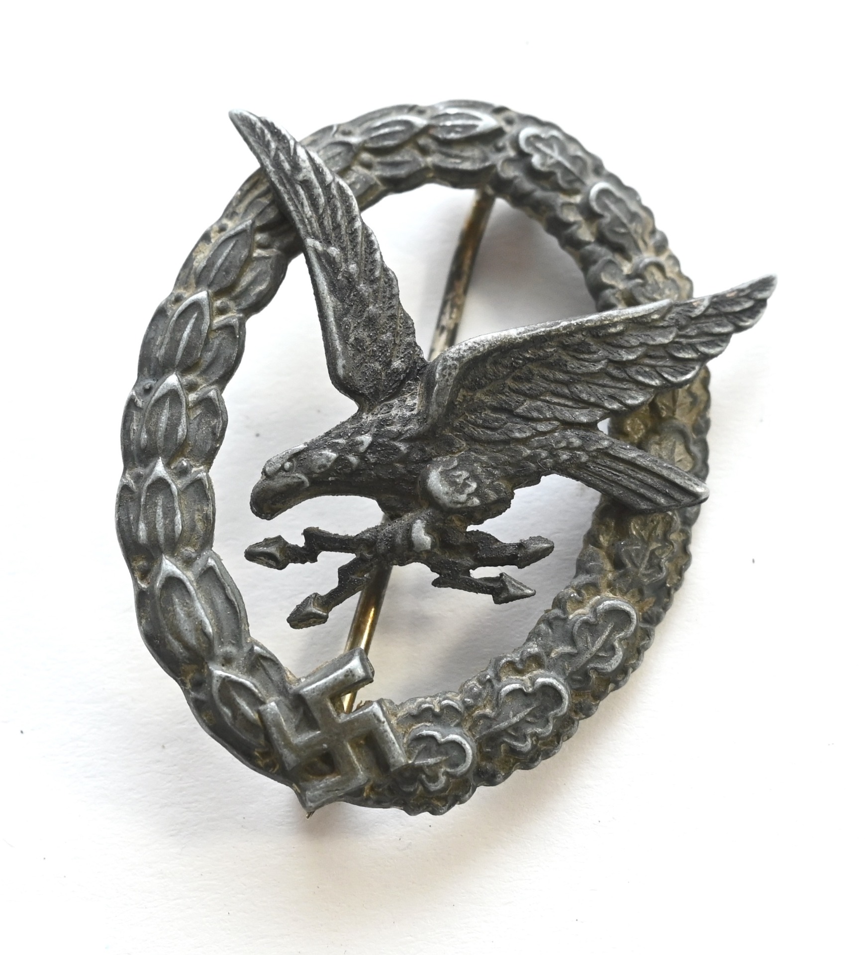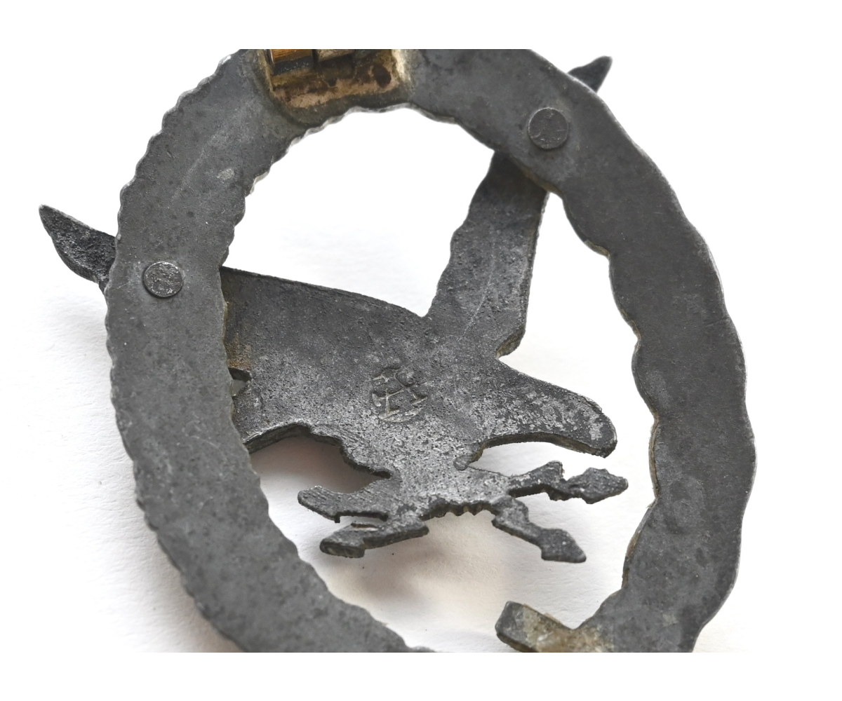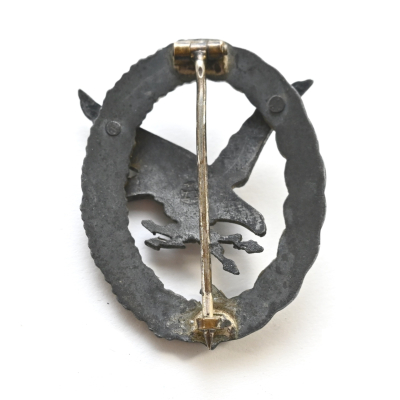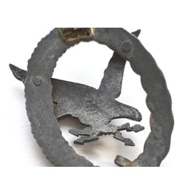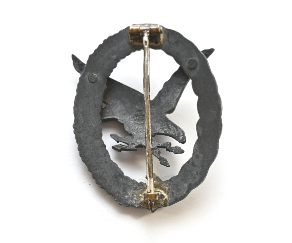 The badge shows signs of wear. It's complete with working pin and catch. It's nicely marked on the back by 'Assmann & Söhne' from 'Lüdenscheid'. The badge could be earned by air gunners, mechanics (flight engineers) or aircrew meteorologists after they had completed two months of training or participated in at least five operational flights. If someone was injured/wounded during an operational flight, the badge could be awarded earlier.