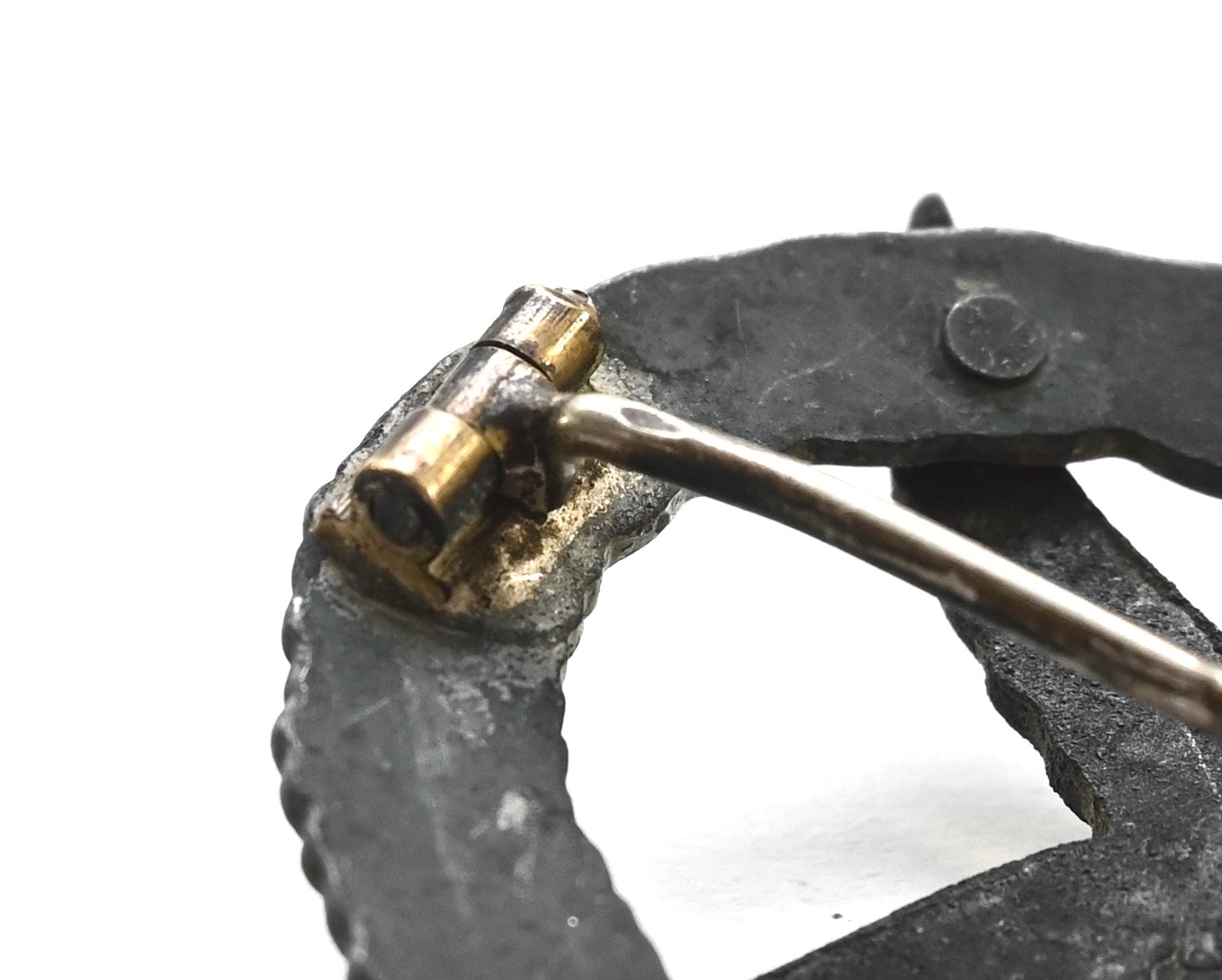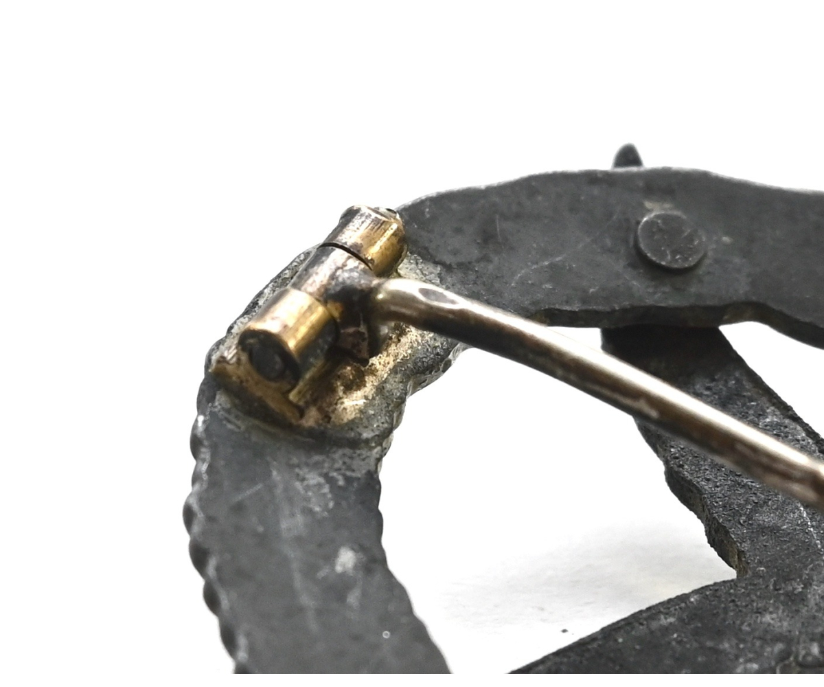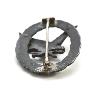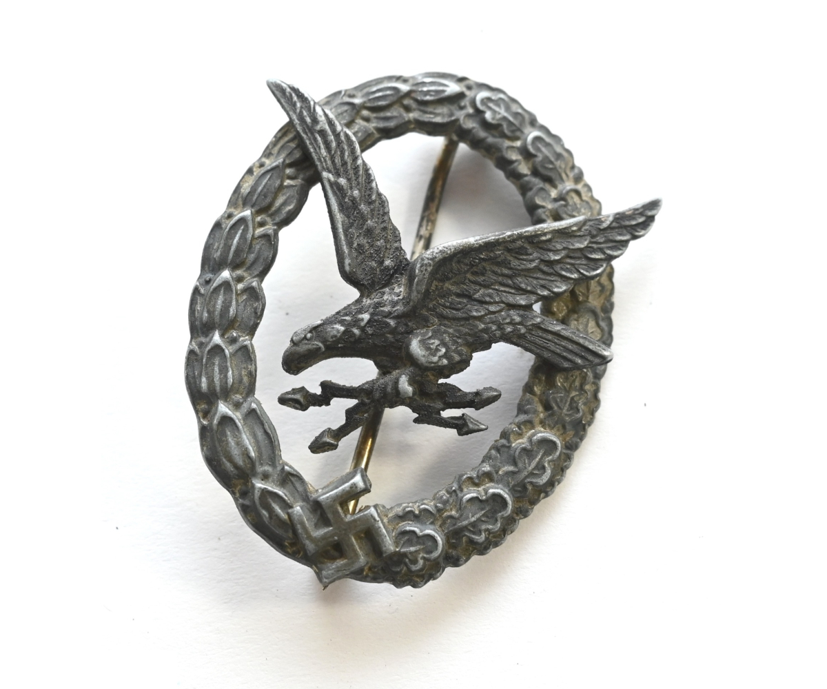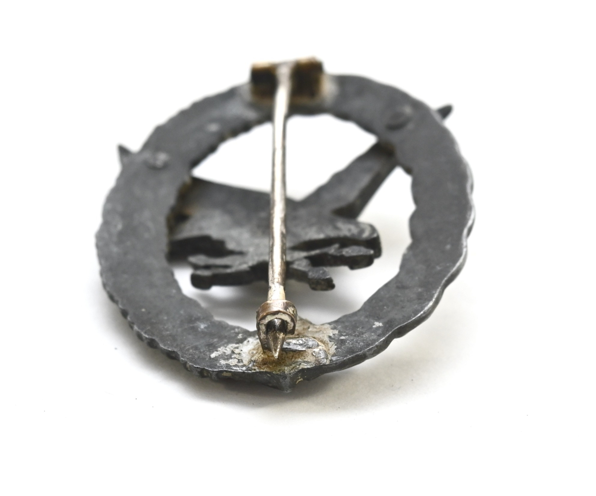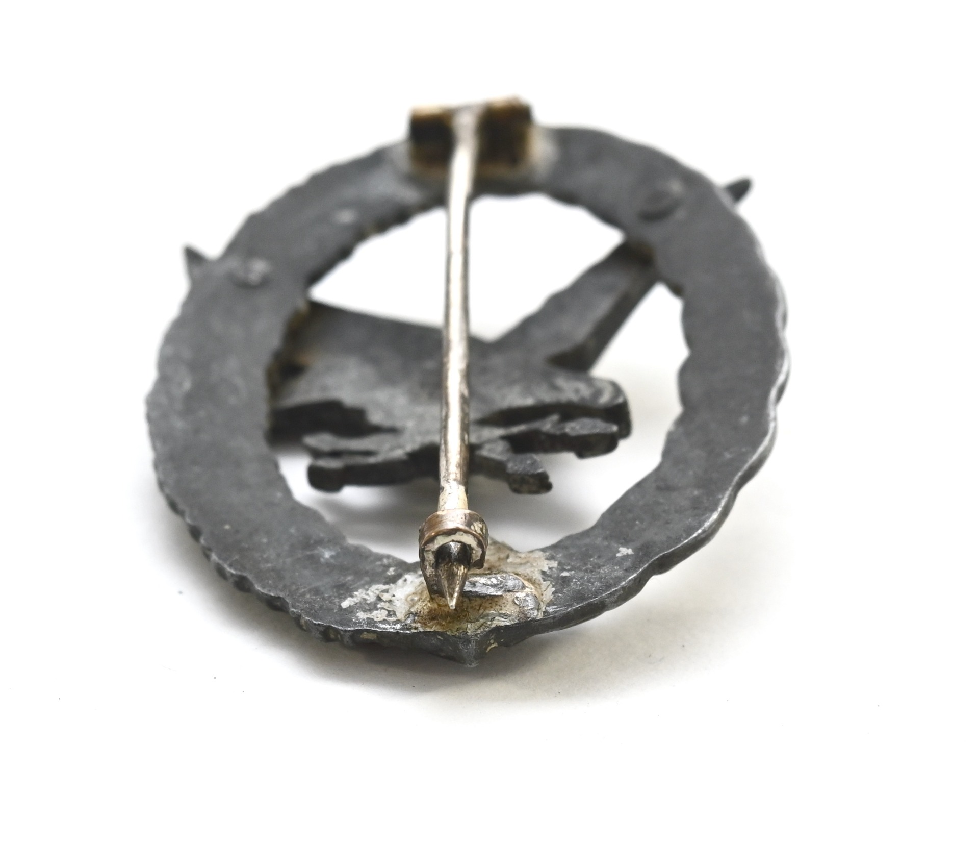 The badge shows signs of wear. It's complete with working pin and catch. It's nicely marked on the back by 'Assmann & Söhne' from 'Lüdenscheid'. The badge could be earned by air gunners, mechanics (flight engineers) or aircrew meteorologists after they had completed two months of training or participated in at least five operational flights. If someone was injured/wounded during an operational flight, the badge could be awarded earlier.