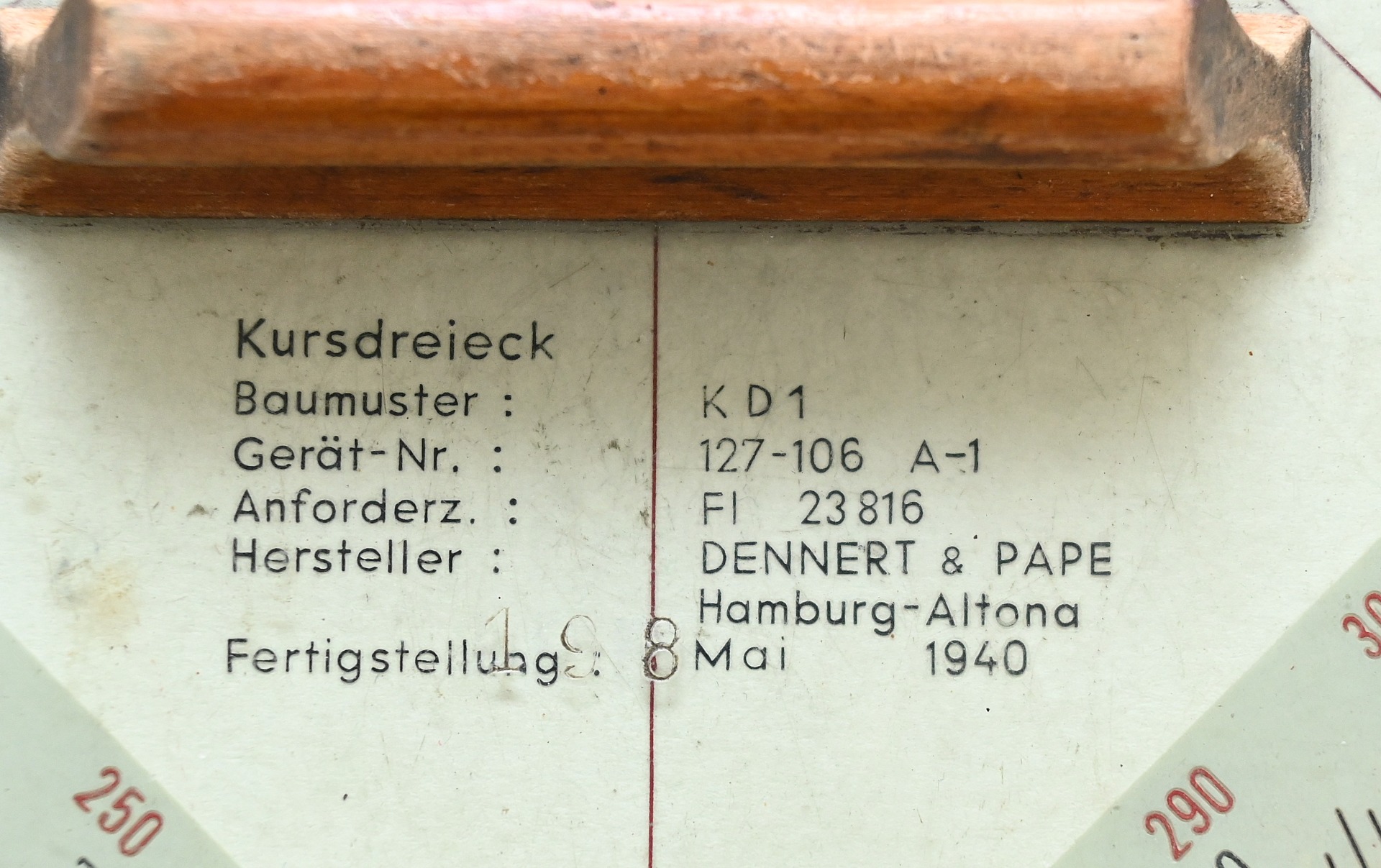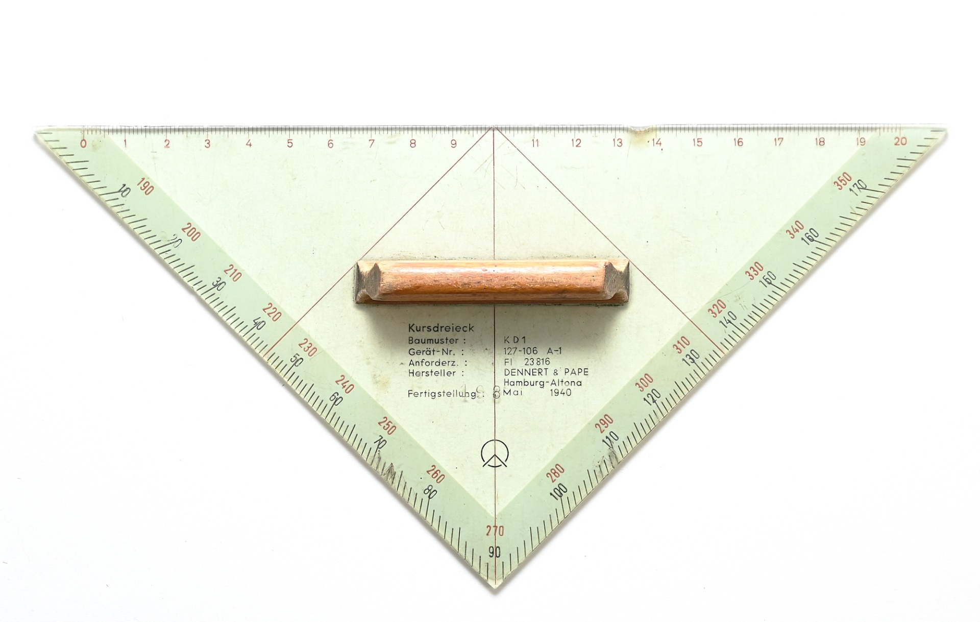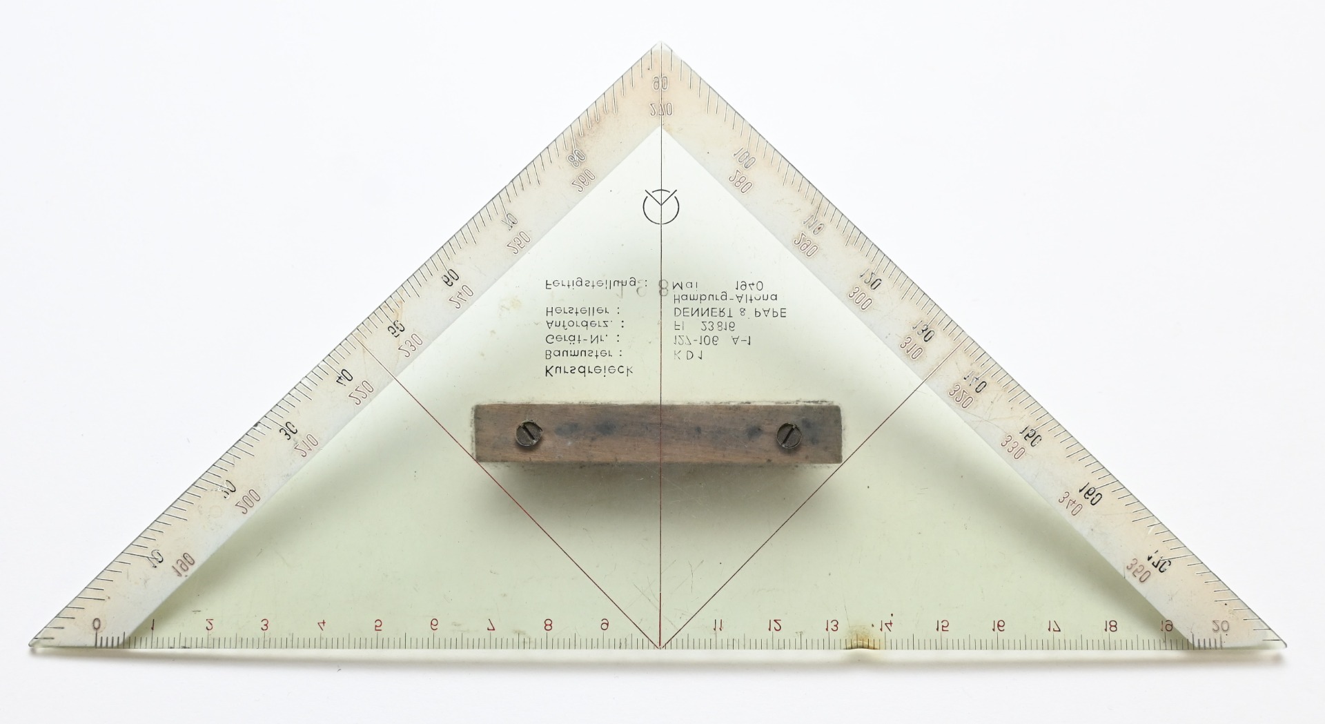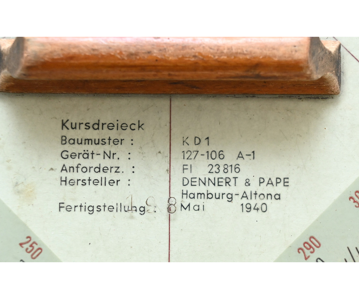The ruler shows overall normal signs of wear. Complete with wooden grip. It's nicely marked by the maker 'Dennert & Pape' from Hamburg and dated 1940.