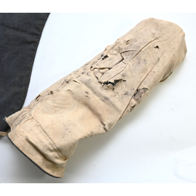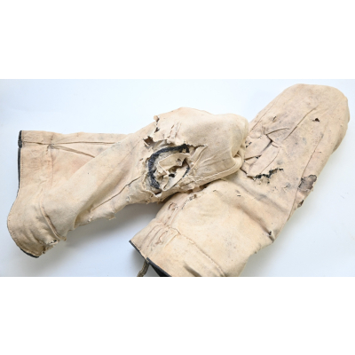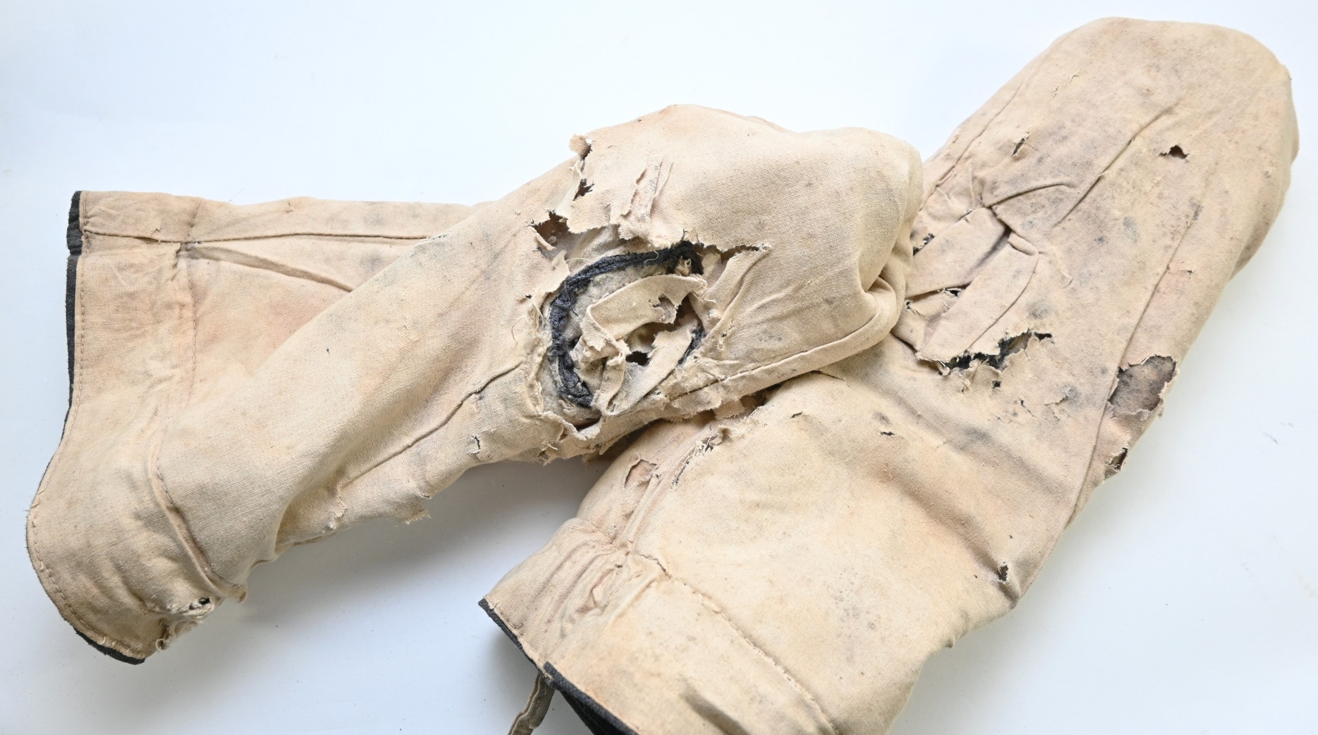 The gloves or mittens show overall signs of wear. The blue side is the best with only 1 small damage. The white side of both piece have been the home of some mice.
