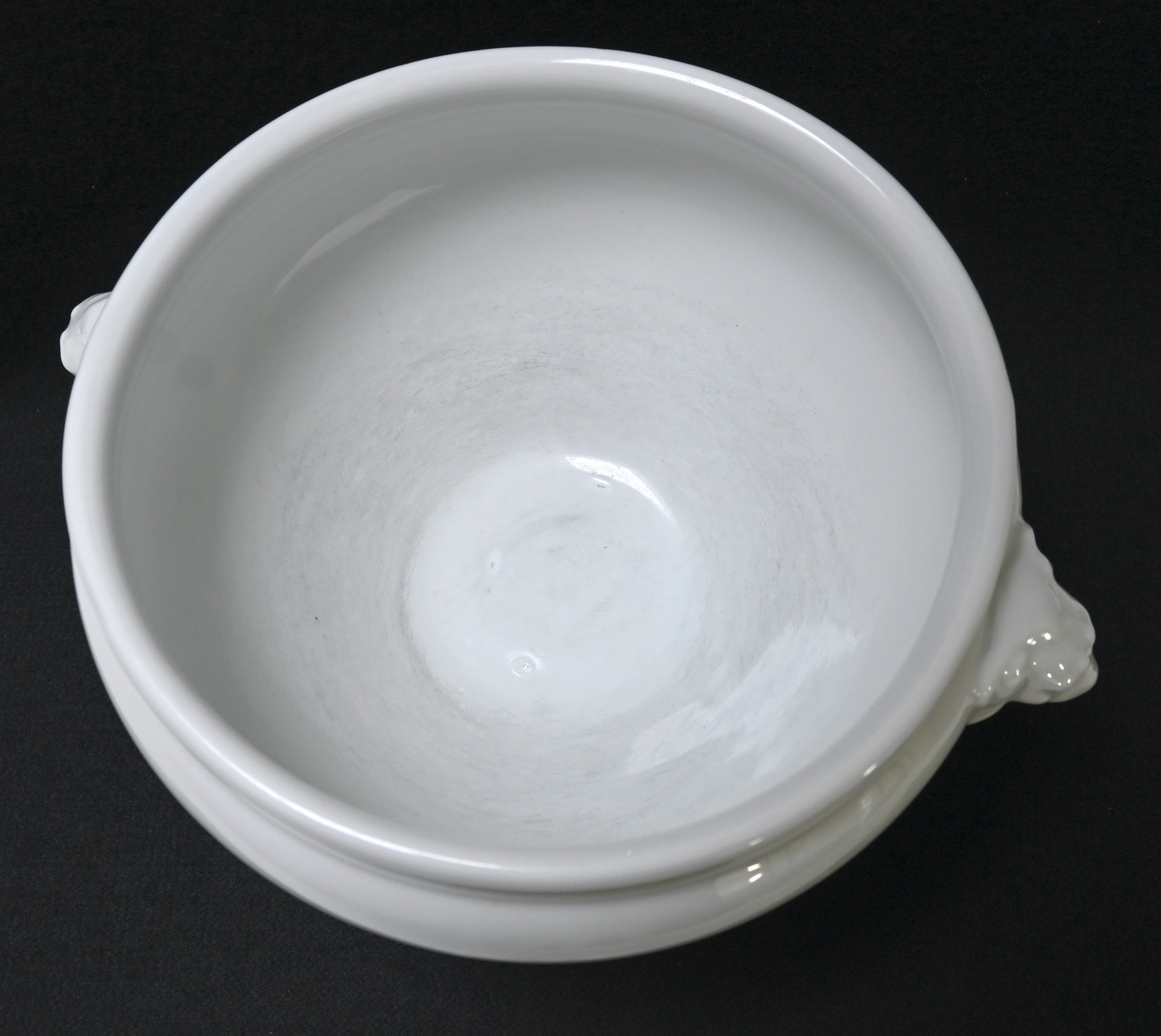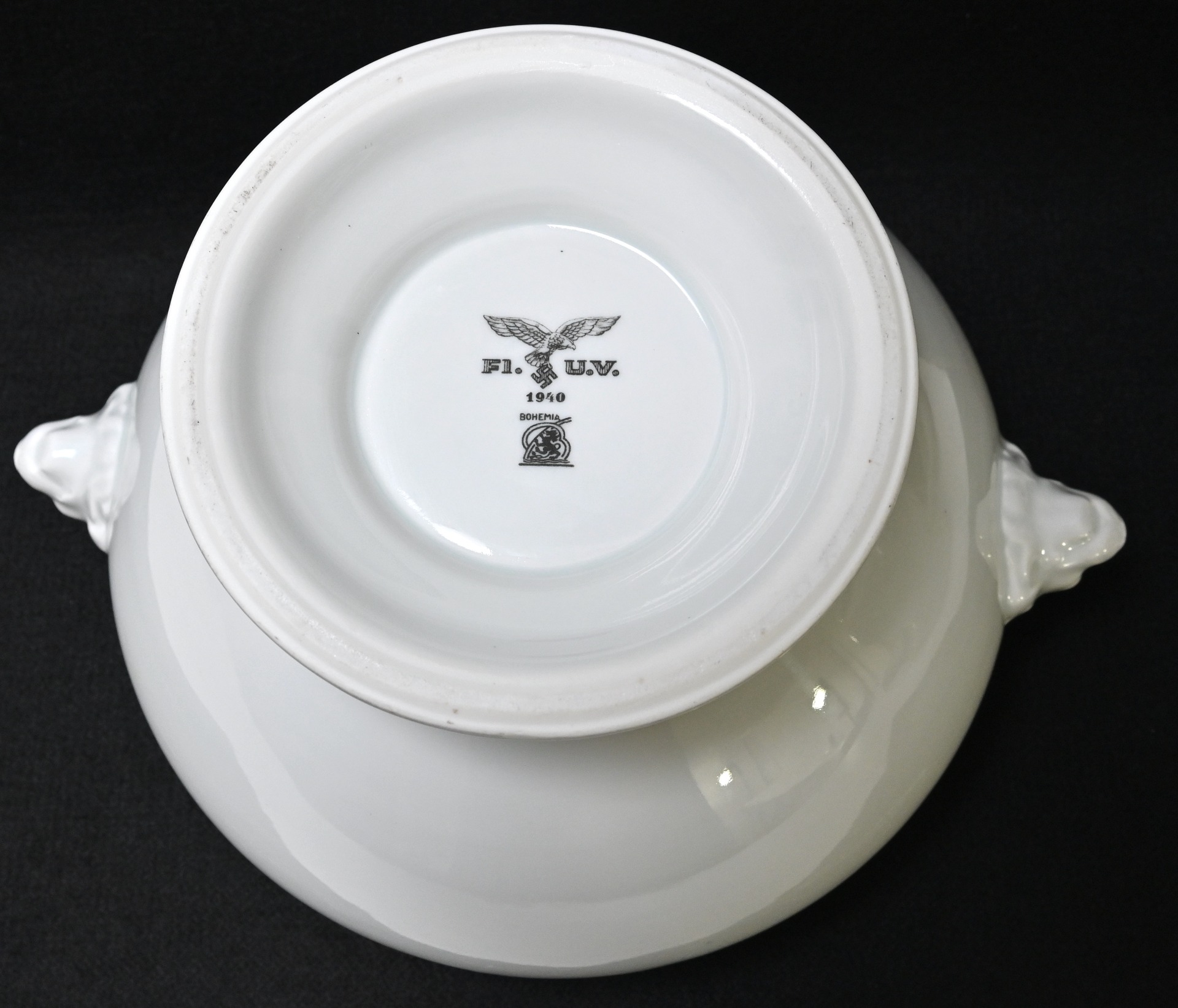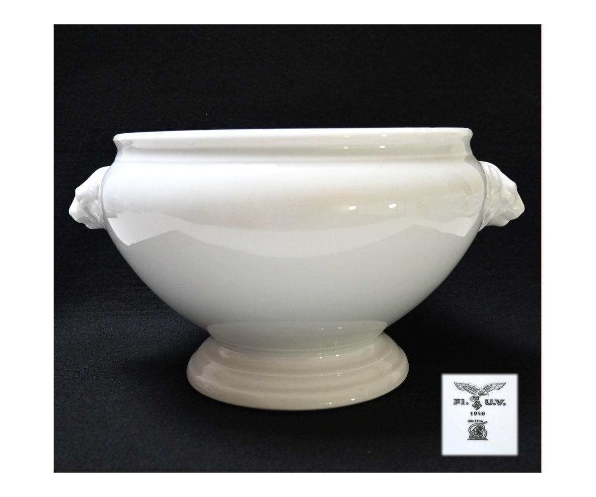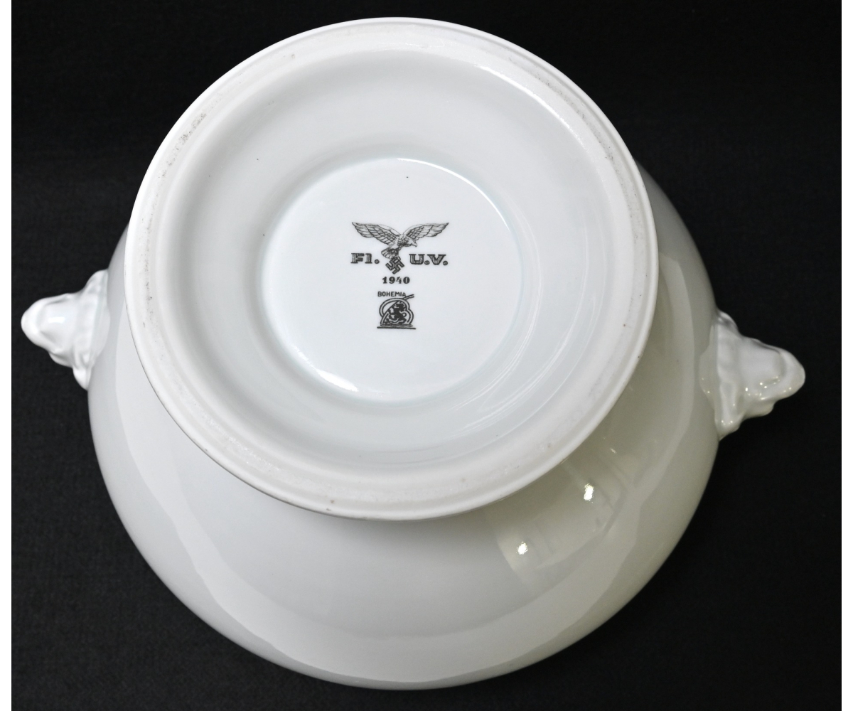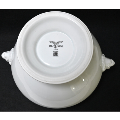 The Tureen is in used but good condition. It shows normal signs of usage/scratches. Nicely marked on the bottom with the Luftwaffe eagle, the maker and year of production '1940'. It's approx. 17cm high and the diameter is approx. 23,5cm.