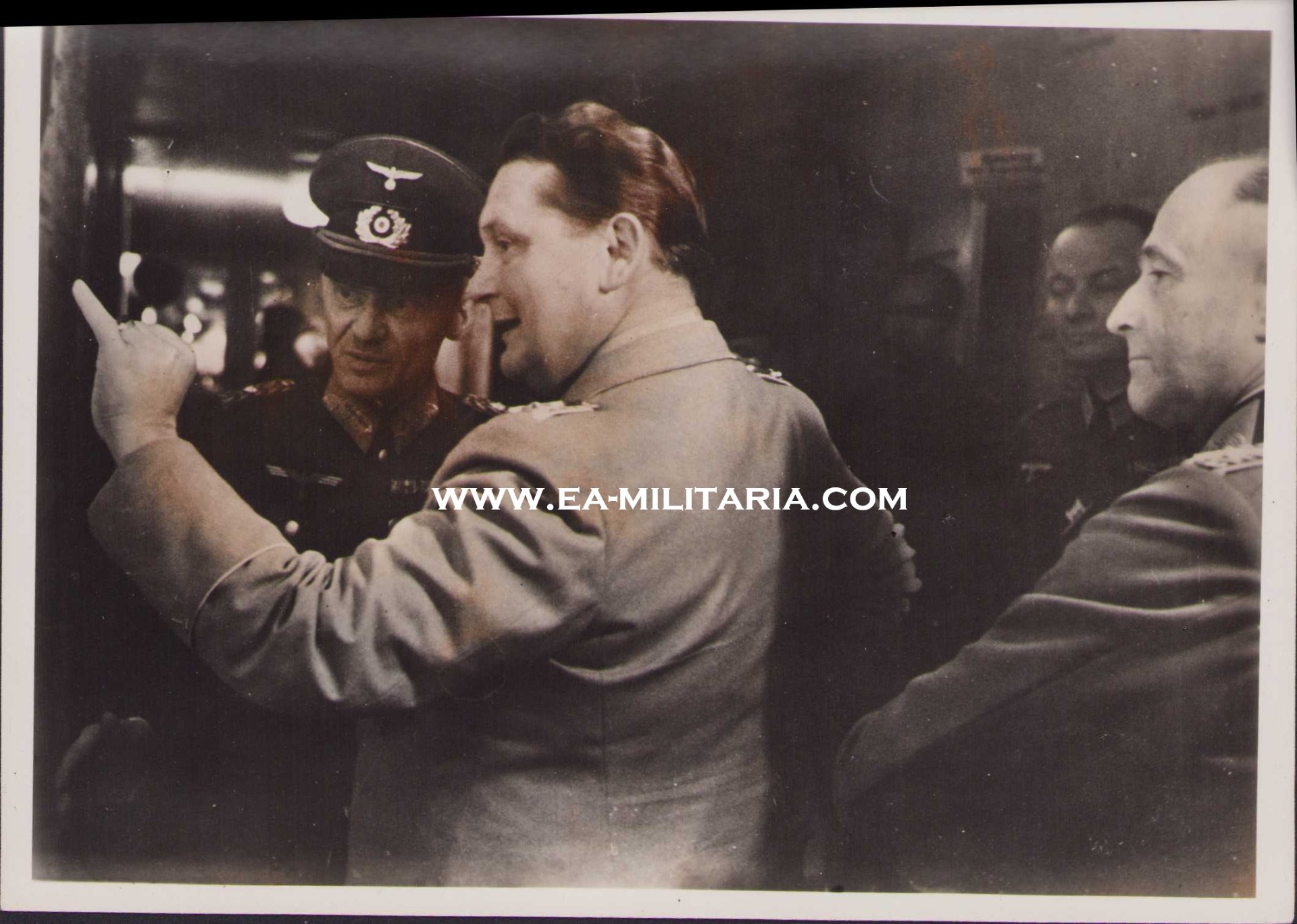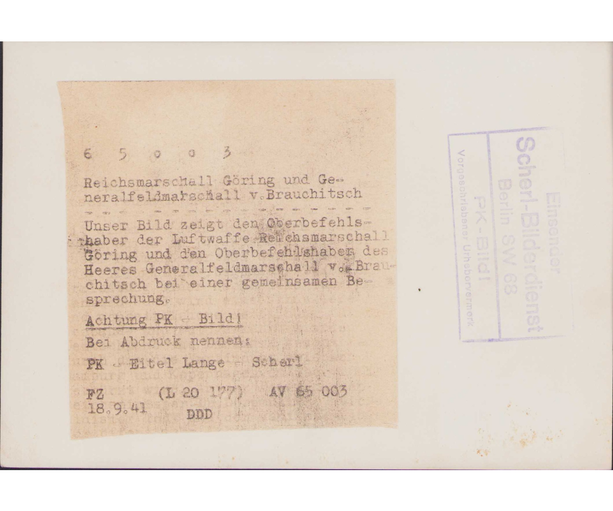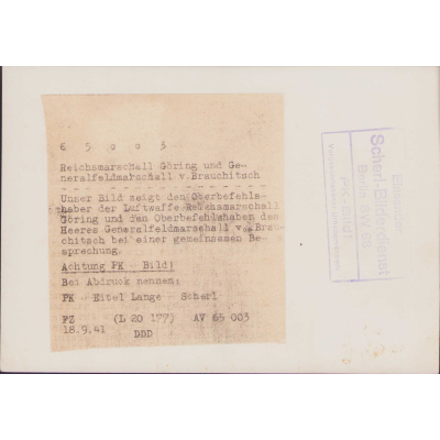 The photograph shows overall normal signs of storage wear. It's complete with paper caption on the back. It shows Luftwaffe Richsmarschall Göring, General Walther von Brauchitsch and other officers during a meeting.