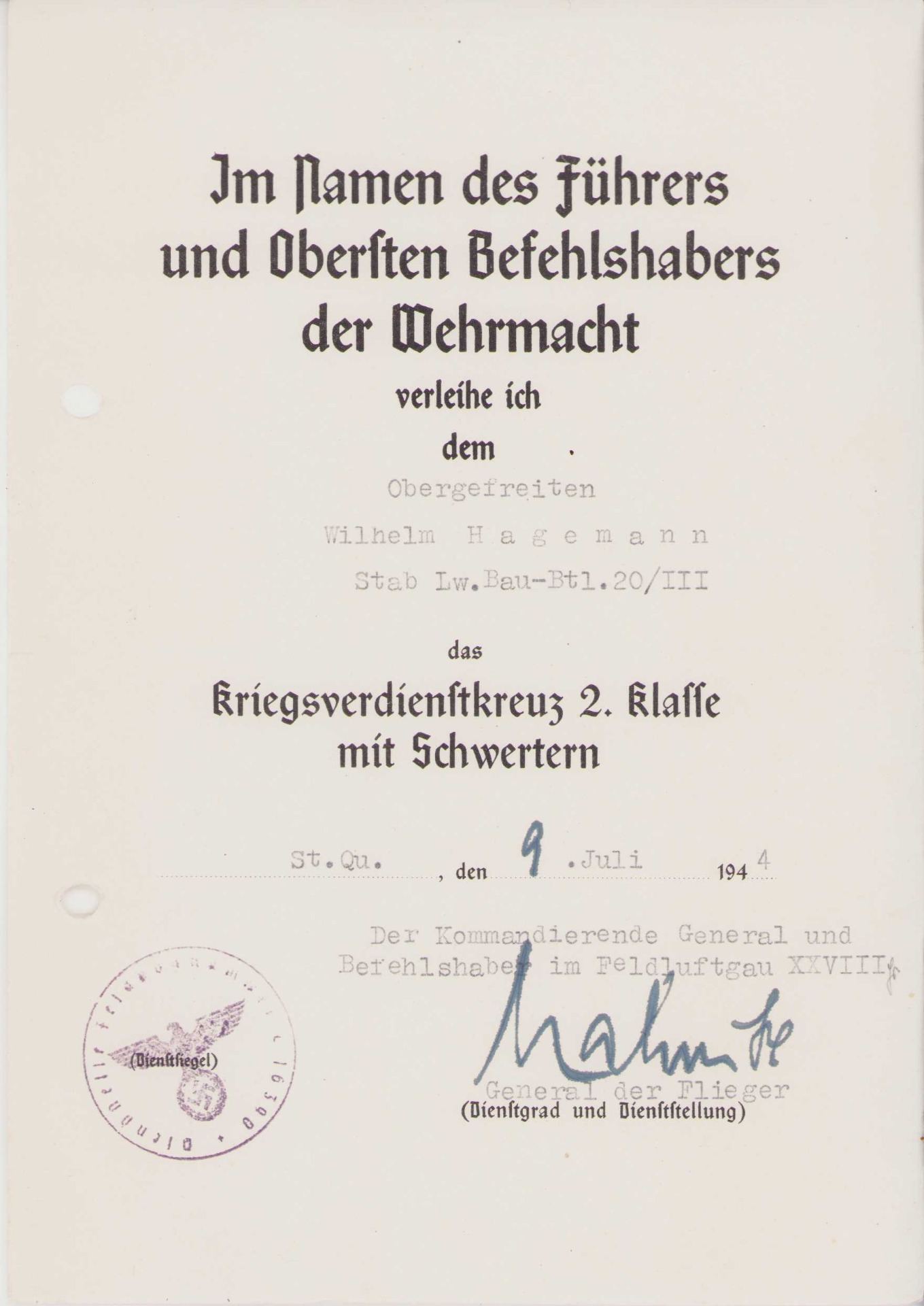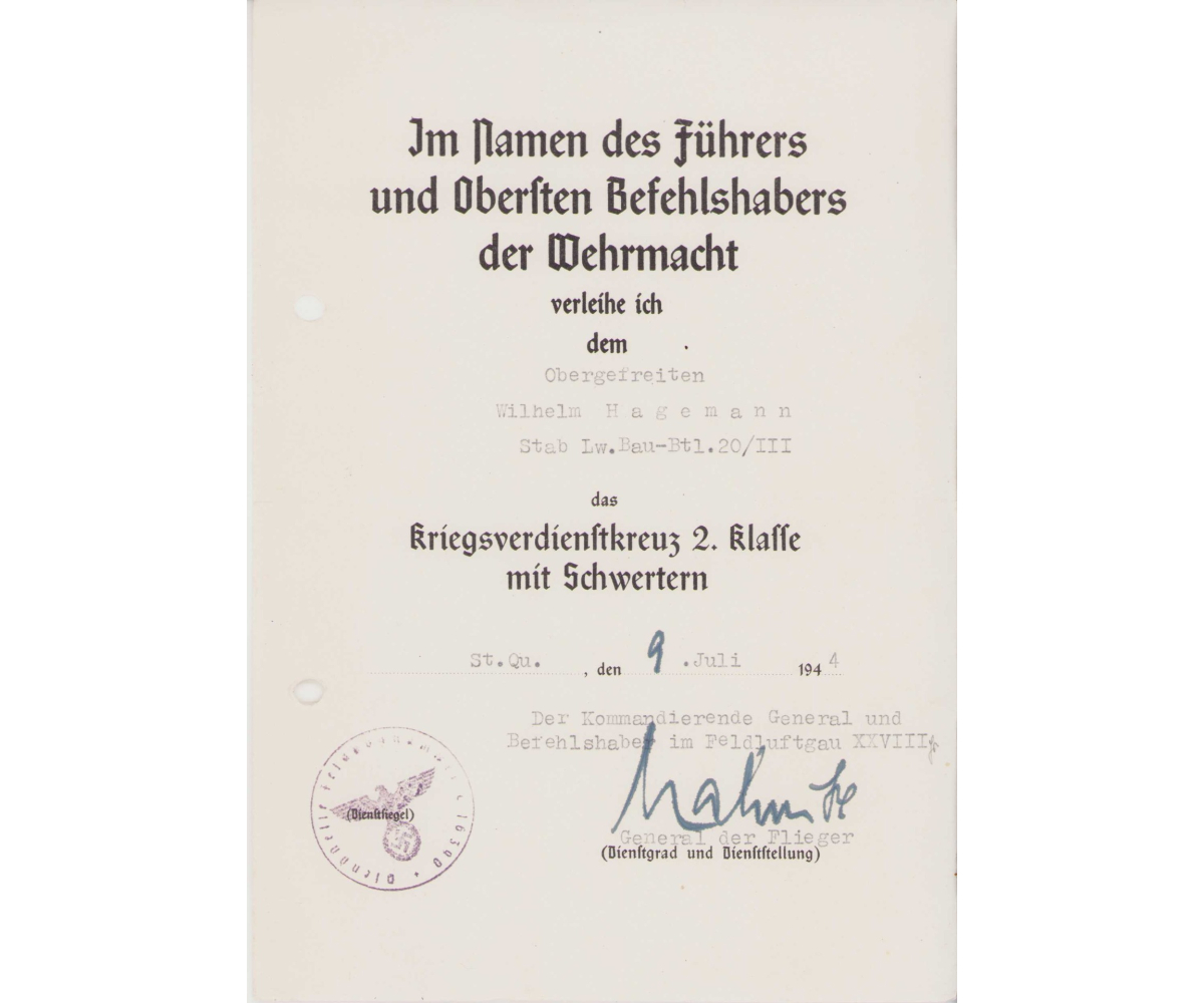The document is signed by General der Flieger Alfred Mahnke, wearer of the Deutsches Kreuz in Gold (July 1943) and he was the commander of Feldluftgau-Kommando XXVIII which was stationed in Milan, Italy.