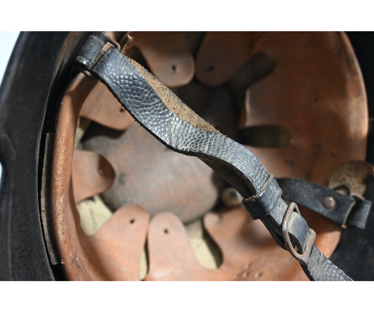 The helmet is in good condition. Most of its orginial colour is stil present. Its complete with both decals, which are also for the most part intact. The helmet comes with it's aluminium comb, original produced (named!) liner (drawstring is missing) and chin strap. Both are supple and in very good condition. The liner is size marked '57'. The helmet is maker marked by the 'Thale' factory in the neck.