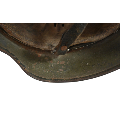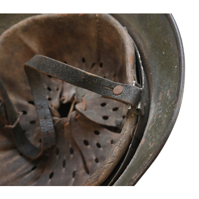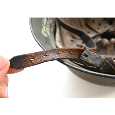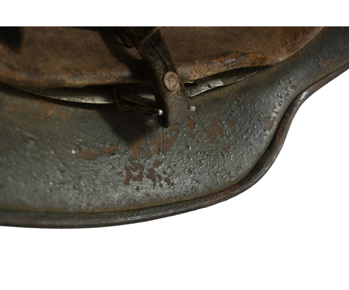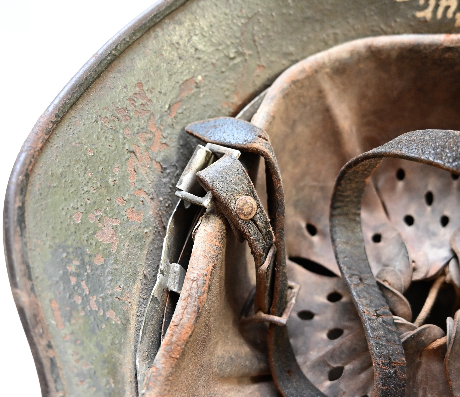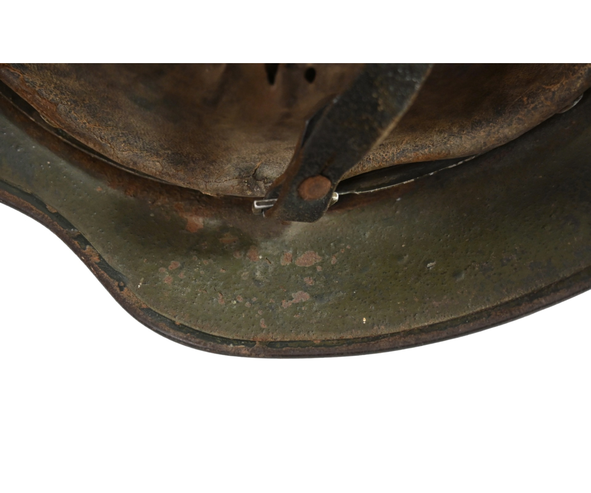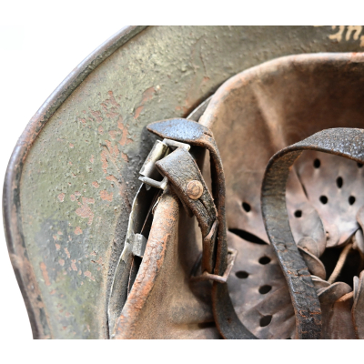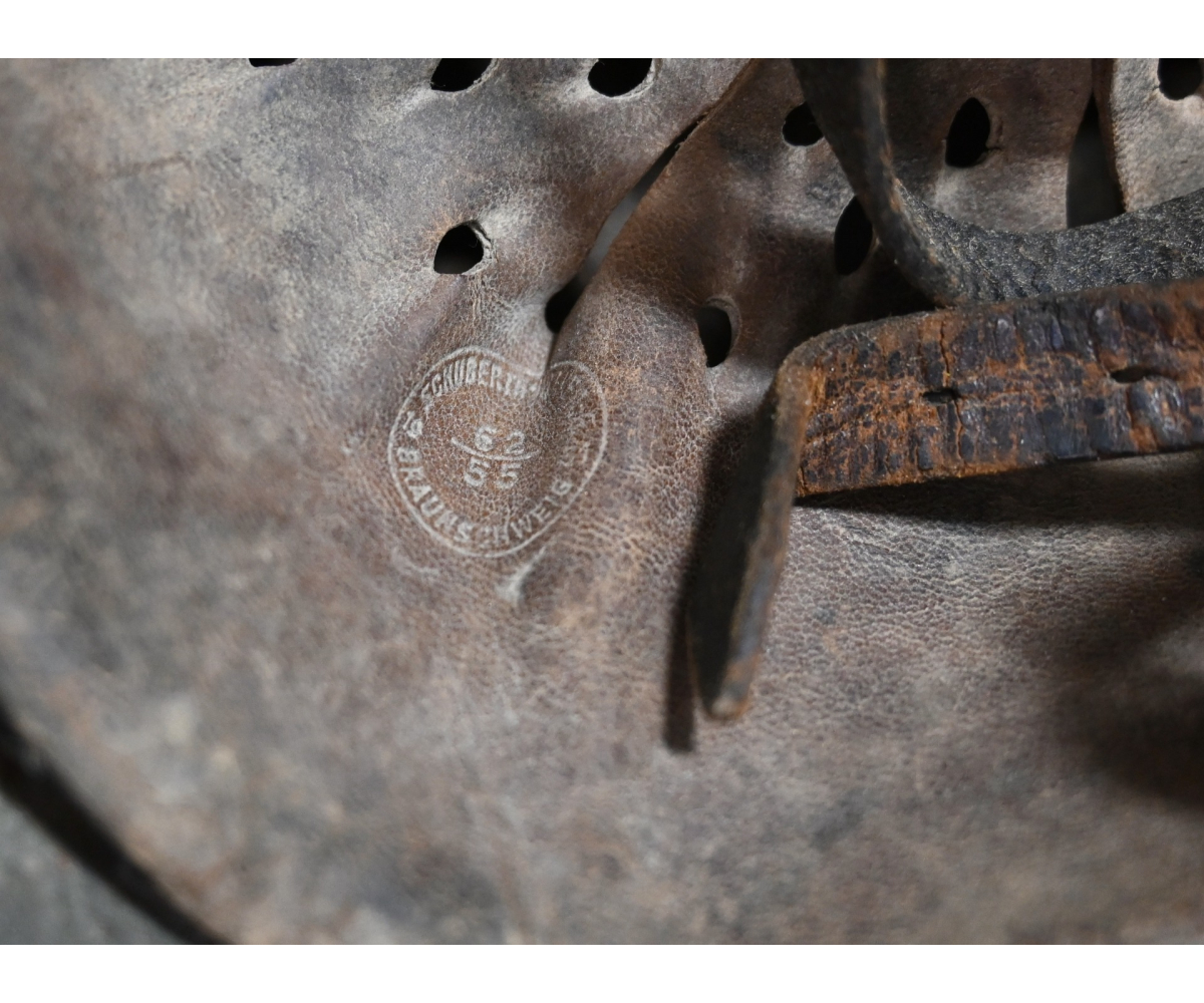 This helmet has a lovely used battle worn patina. The shell still contains al lot of it's period applied two-tone camouflage. It comes with a very very! rare '1931' dated liner, which is original to the helmet. The liner is marked 'D.R.P' ('Deutsches Reichspatent') and maker marked by 'Schuberth-Werk K.-G.' from 'Braunschweig' . The liner shows some overall heavy wear but it’s solid and the leather is semi-supple (slightly stiff in some places). The linerband has undergone a minor repair at some point. The helmet has size '62' (liner size '55'). The chinstrap is also present and in in the same condition as the liner. The leather shows signs of wear/surface cracks, but is supple and still pretty solid. The tip is marked, but hard to read due to wear.