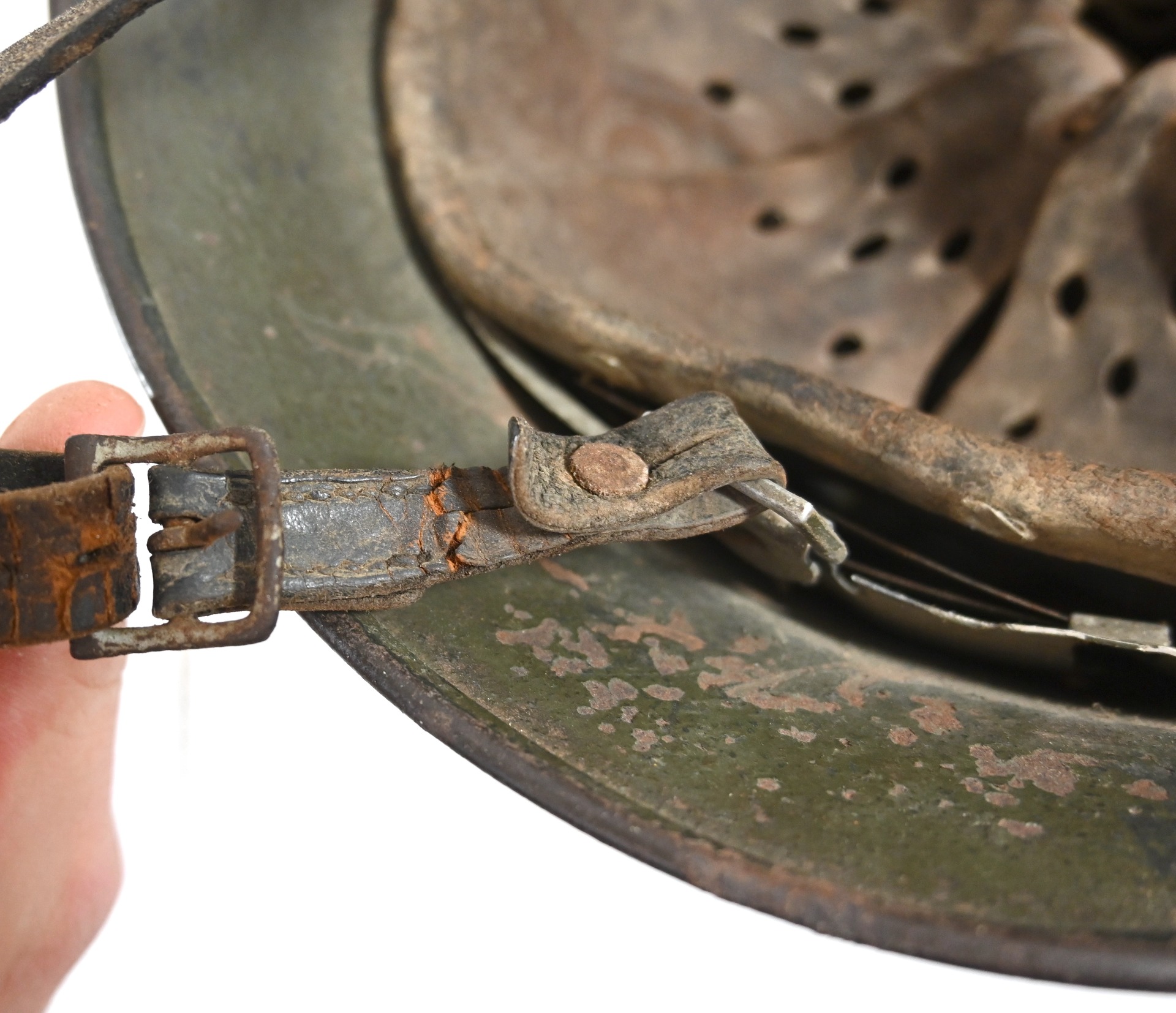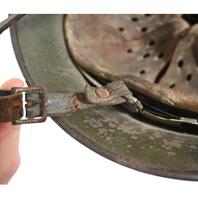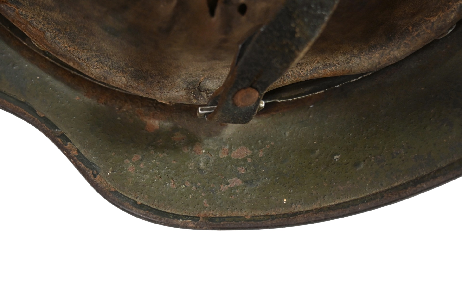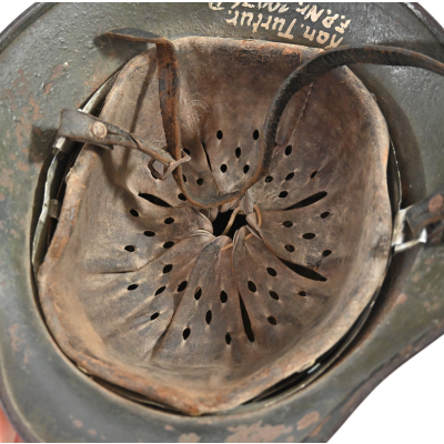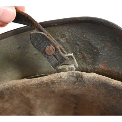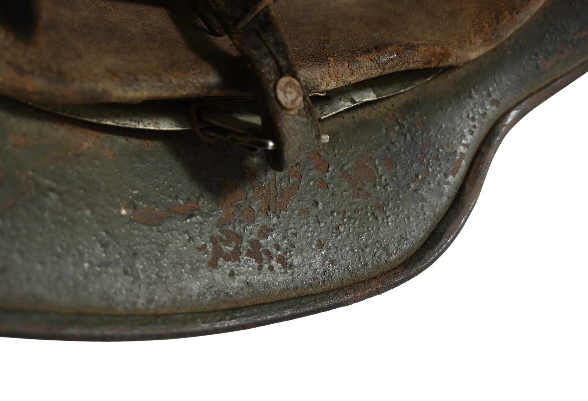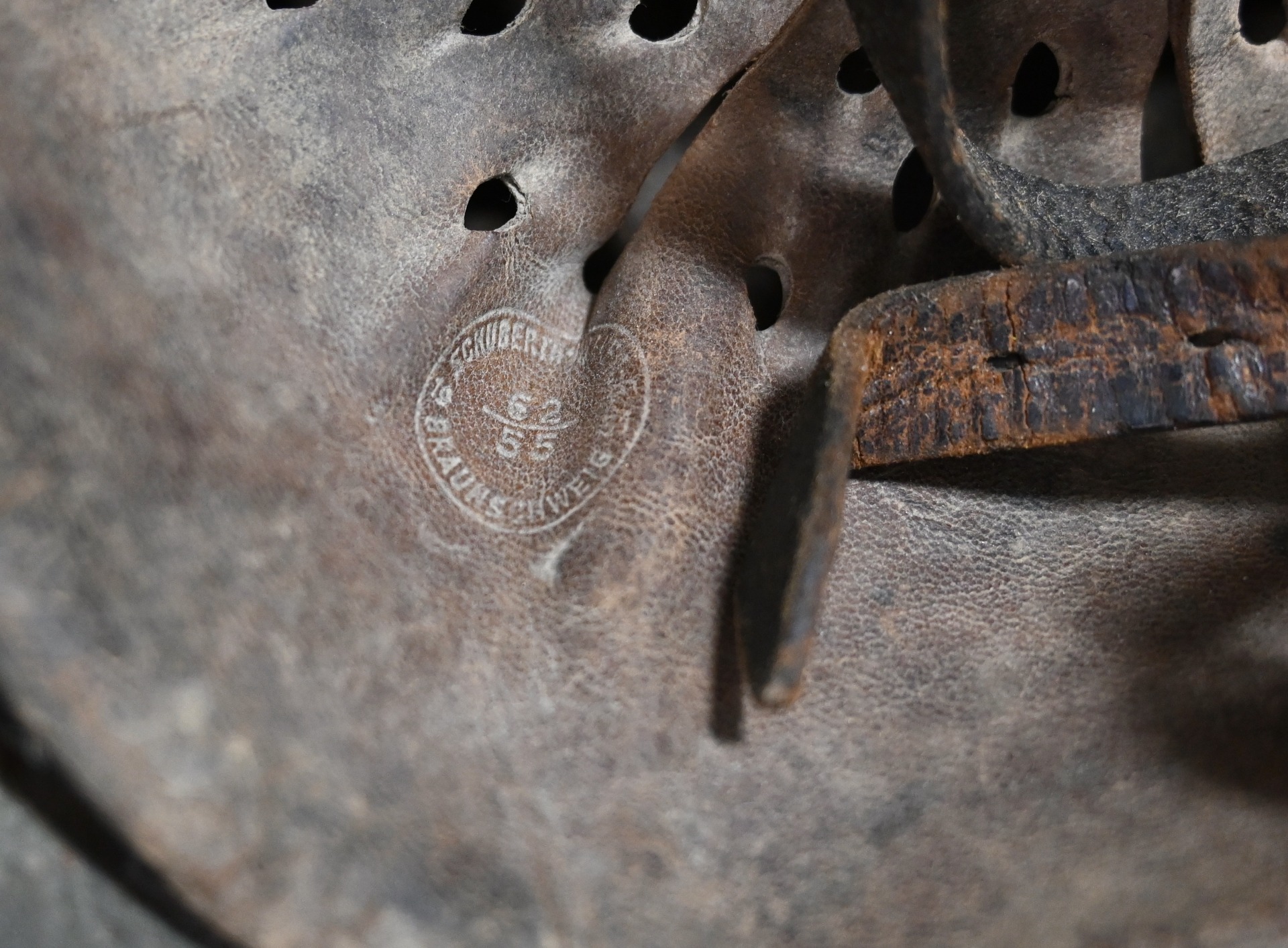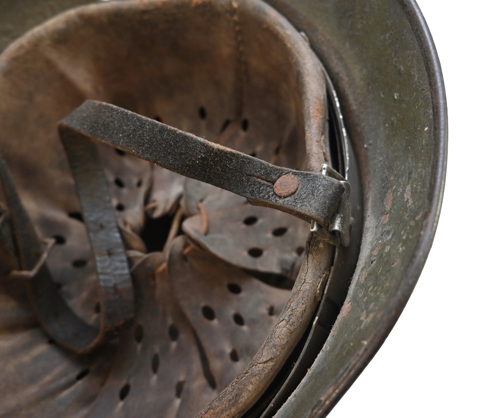 This helmet has a lovely used battle worn patina. The shell still contains al lot of it's period applied two-tone camouflage. It comes with a very very! rare '1931' dated liner, which is original to the helmet. The liner is marked 'D.R.P' ('Deutsches Reichspatent') and maker marked by 'Schuberth-Werk K.-G.' from 'Braunschweig' . The liner shows some overall heavy wear but it’s solid and the leather is semi-supple (slightly stiff in some places). The linerband has undergone a minor repair at some point. The helmet has size '62' (liner size '55'). The chinstrap is also present and in in the same condition as the liner. The leather shows signs of wear/surface cracks, but is supple and still pretty solid. The tip is marked, but hard to read due to wear.