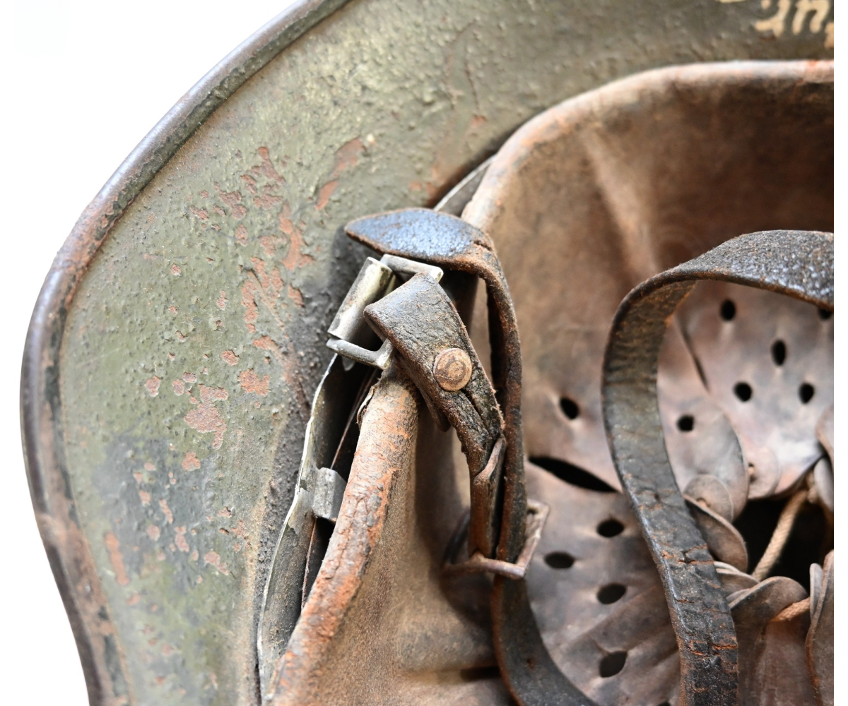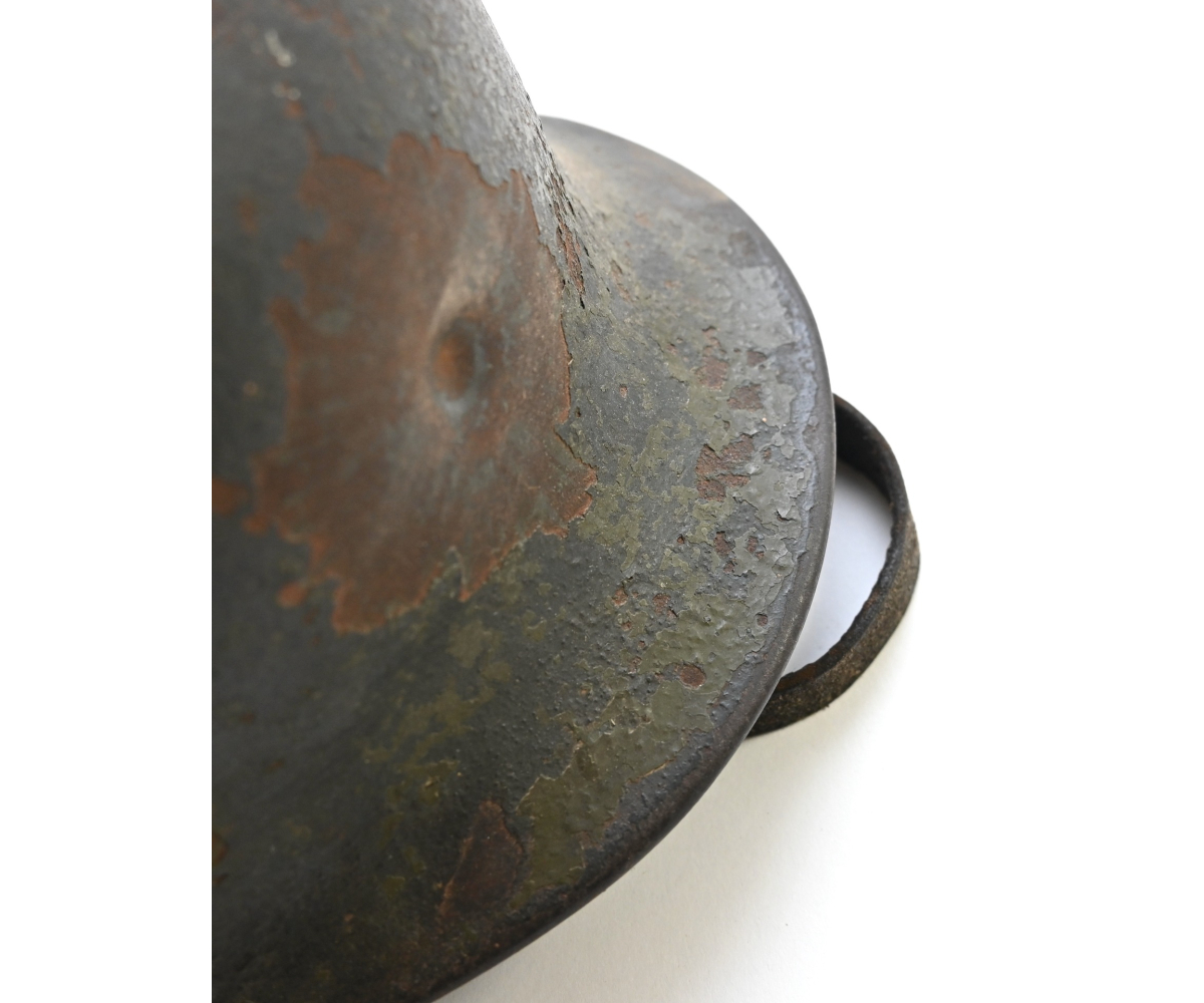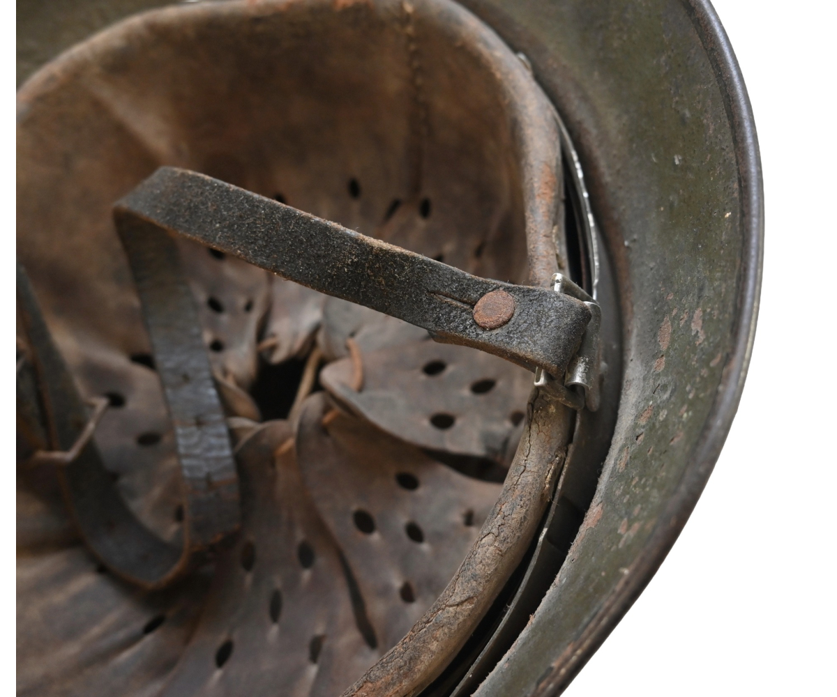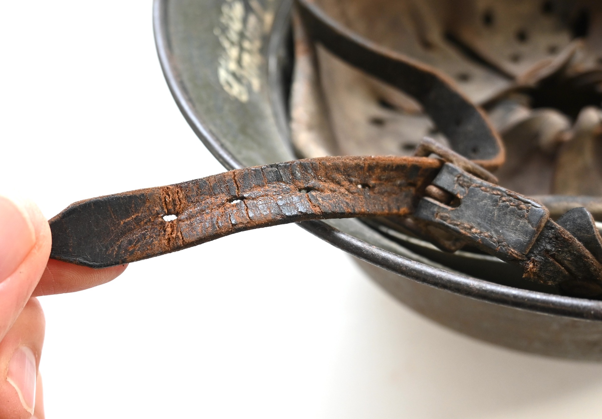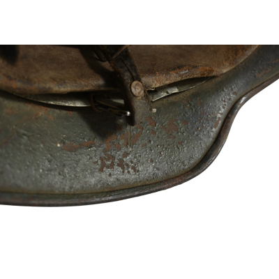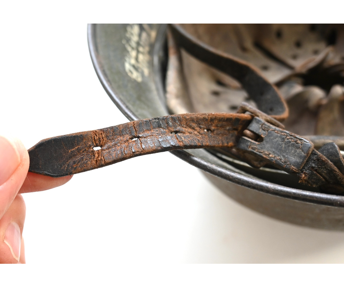 This helmet has a lovely used battle worn patina. The shell still contains al lot of it's period applied two-tone camouflage. It comes with a very very! rare '1931' dated liner, which is original to the helmet. The liner is marked 'D.R.P' ('Deutsches Reichspatent') and maker marked by 'Schuberth-Werk K.-G.' from 'Braunschweig' . The liner shows some overall heavy wear but it’s solid and the leather is semi-supple (slightly stiff in some places). The linerband has undergone a minor repair at some point. The helmet has size '62' (liner size '55'). The chinstrap is also present and in in the same condition as the liner. The leather shows signs of wear/surface cracks, but is supple and still pretty solid. The tip is marked, but hard to read due to wear.