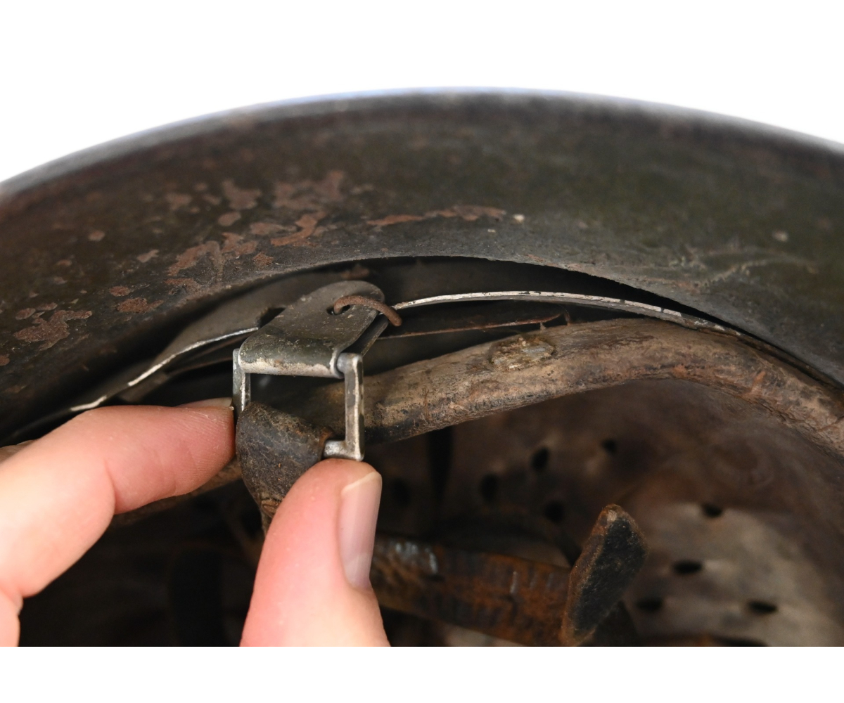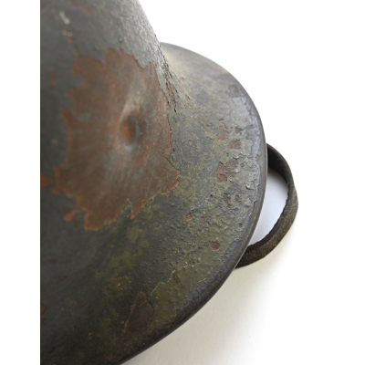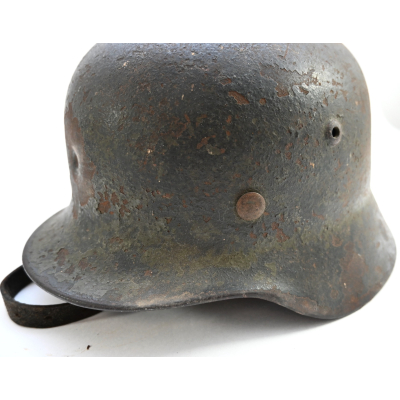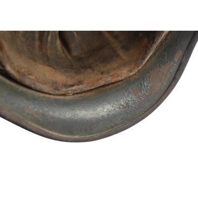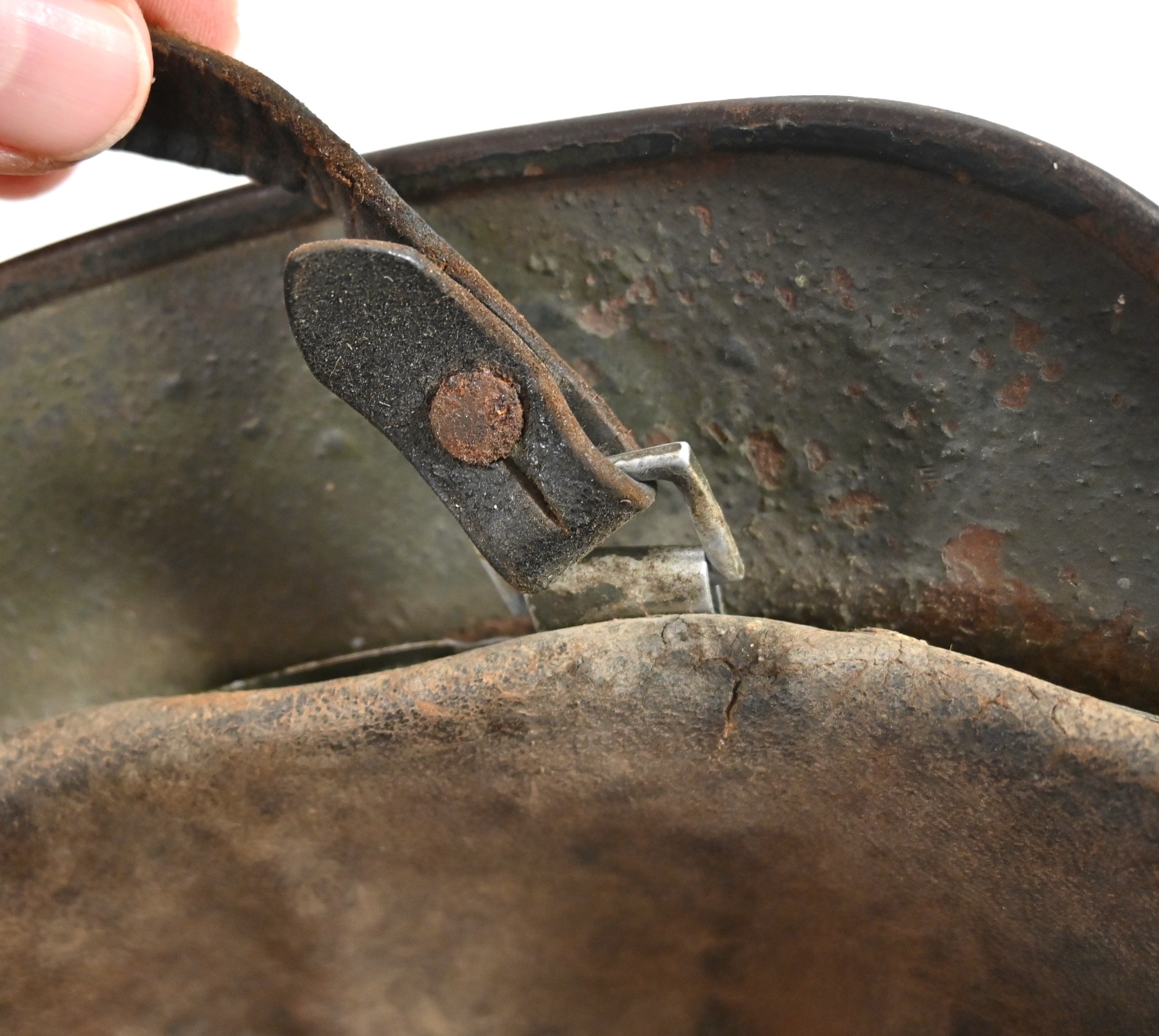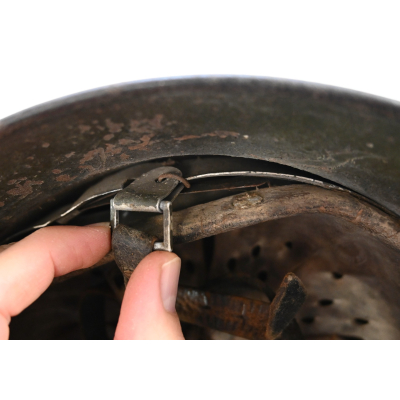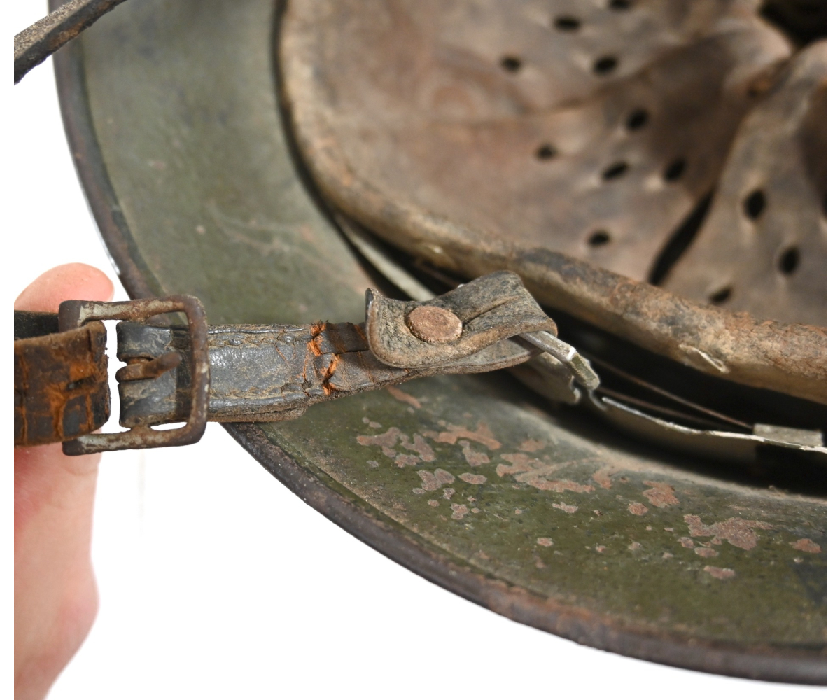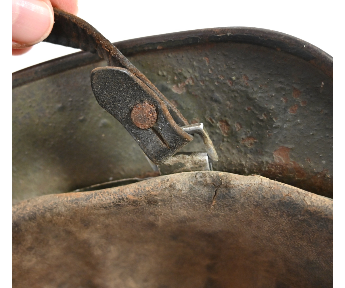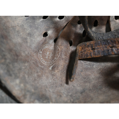 This helmet has a lovely used battle worn patina. The shell still contains al lot of it's period applied two-tone camouflage. It comes with a very very! rare '1931' dated liner, which is original to the helmet. The liner is marked 'D.R.P' ('Deutsches Reichspatent') and maker marked by 'Schuberth-Werk K.-G.' from 'Braunschweig' . The liner shows some overall heavy wear but it’s solid and the leather is semi-supple (slightly stiff in some places). The linerband has undergone a minor repair at some point. The helmet has size '62' (liner size '55'). The chinstrap is also present and in in the same condition as the liner. The leather shows signs of wear/surface cracks, but is supple and still pretty solid. The tip is marked, but hard to read due to wear.