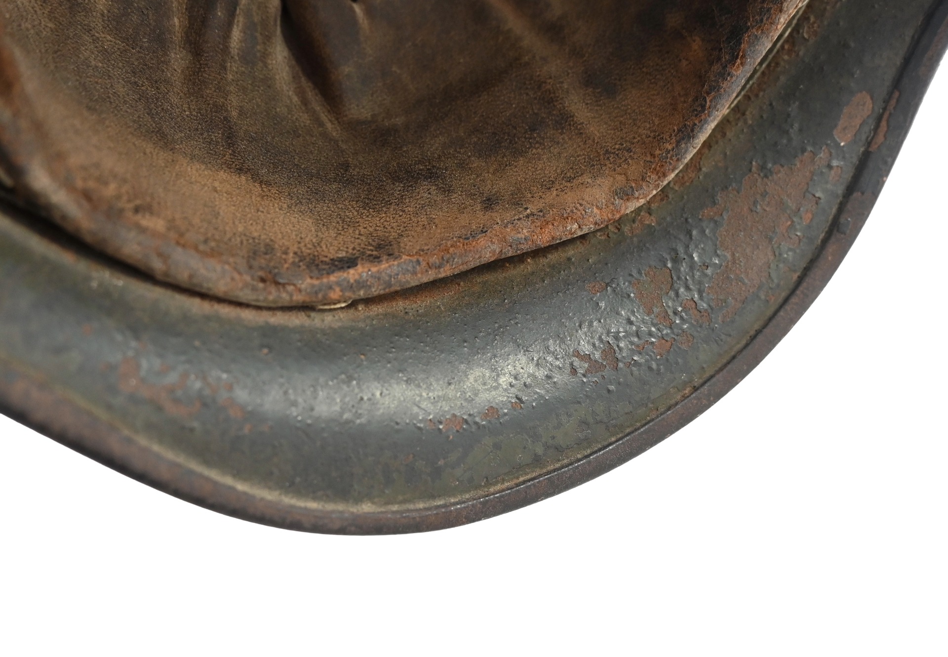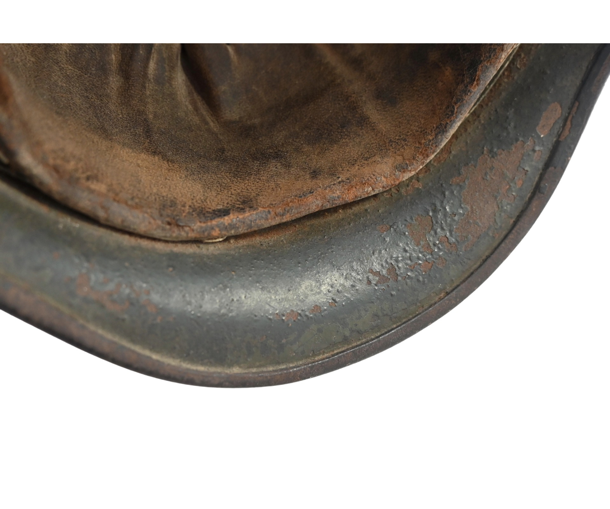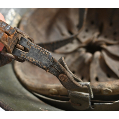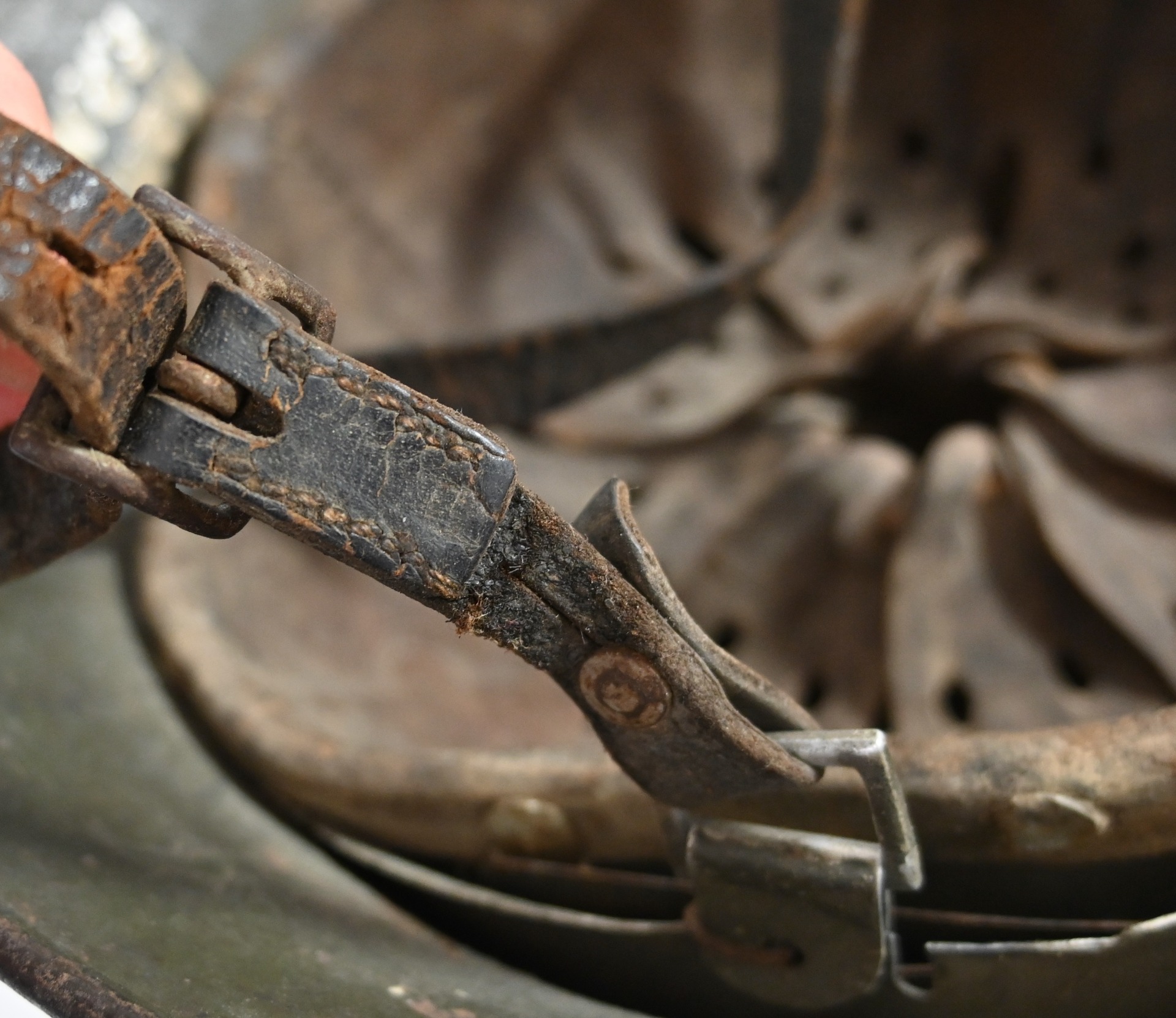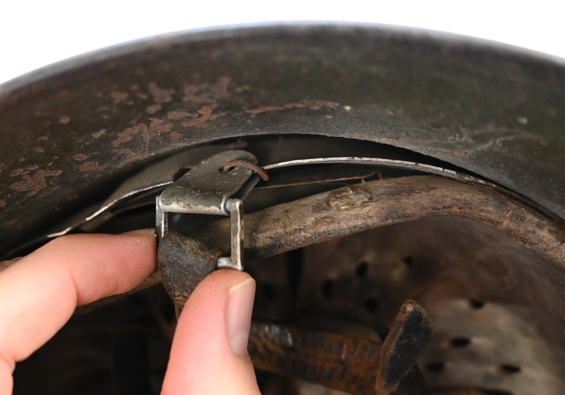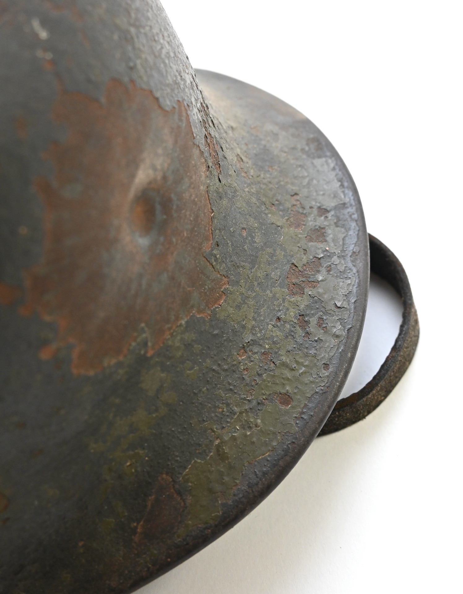 This helmet has a lovely used battle worn patina. The shell still contains al lot of it's period applied two-tone camouflage. It comes with a very very! rare '1931' dated liner, which is original to the helmet. The liner is marked 'D.R.P' ('Deutsches Reichspatent') and maker marked by 'Schuberth-Werk K.-G.' from 'Braunschweig' . The liner shows some overall heavy wear but it’s solid and the leather is semi-supple (slightly stiff in some places). The linerband has undergone a minor repair at some point. The helmet has size '62' (liner size '55'). The chinstrap is also present and in in the same condition as the liner. The leather shows signs of wear/surface cracks, but is supple and still pretty solid. The tip is marked, but hard to read due to wear.