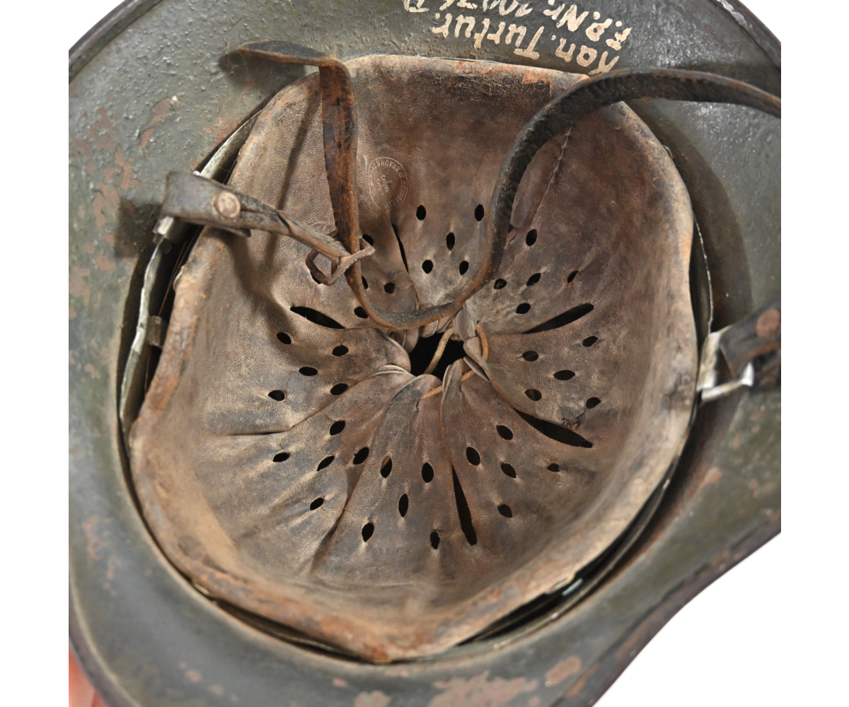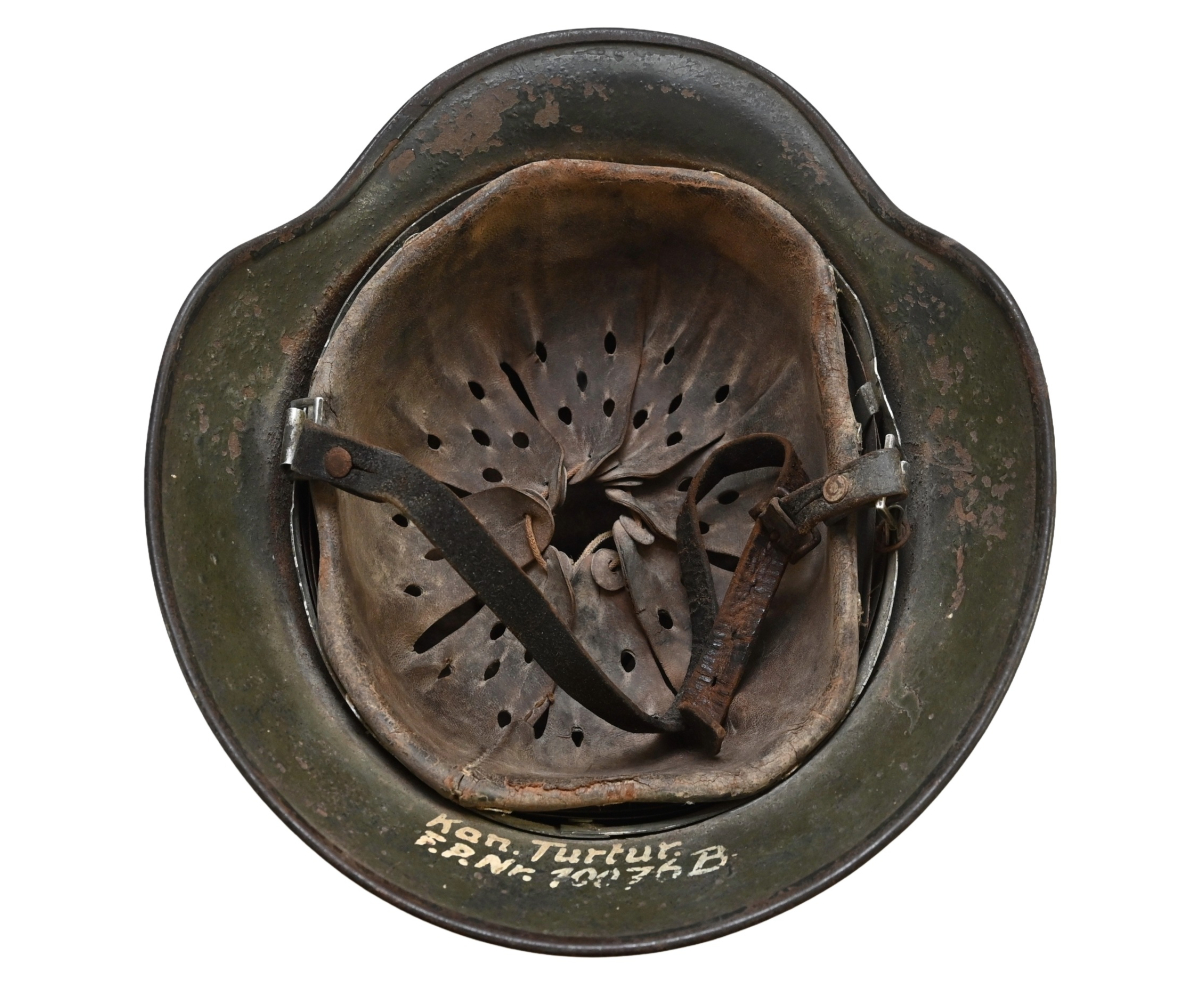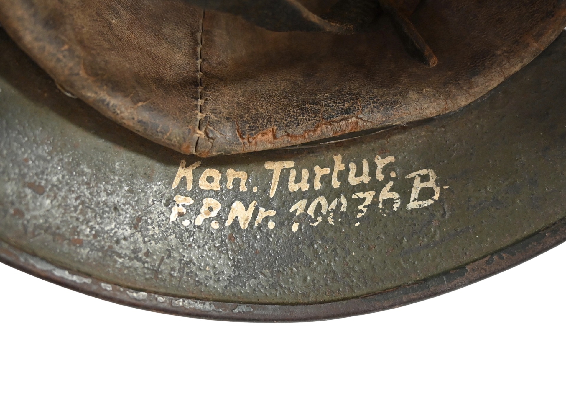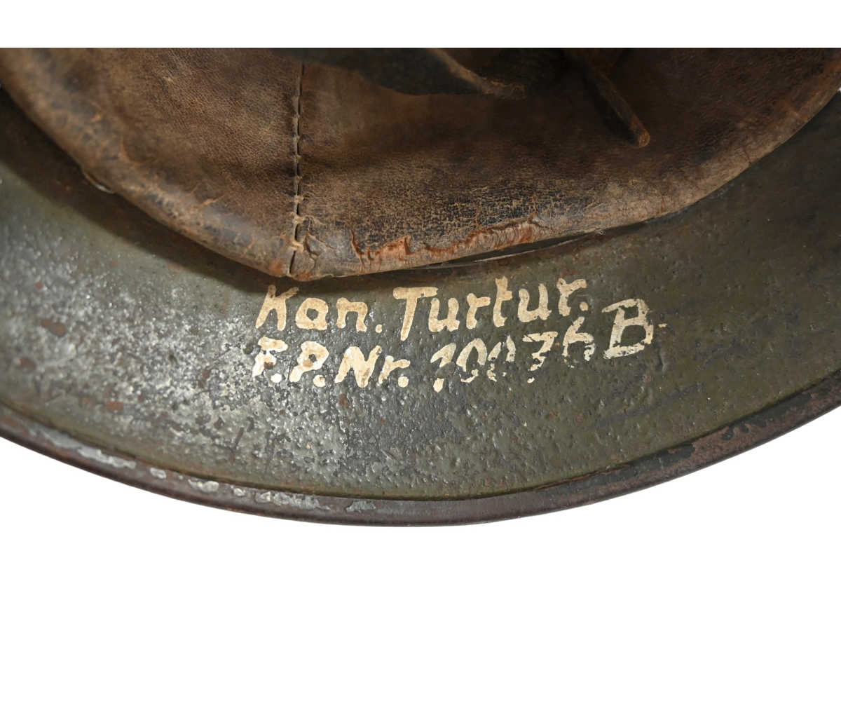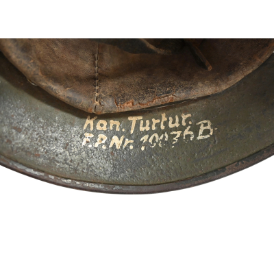 The helmet is named to Kanonier 'Turtur' who had 'Feldpostnr. 10076B'. It is difficult to say when these markings were applied. The feldpostnr. tells that kanonier Turtur served within the 1.batterie schwere Stellungs-Werfer-Abteilung 103. This abteilung was formed in October 1943 and operated/was stationed on the western front. In early 1944 the abteilung was used to formed the III.Abteilung schwere Stellungs Werfer Abteilung 101 which operated in the area of Cherbourg and participated in the fighting against the Allied forces during the Normandy campaign. It was destroyed in June 1944. A part of this unit the Feldpostnummer now refers to the 7.batterie schwere Stellungs Werfer Abteilung 101.