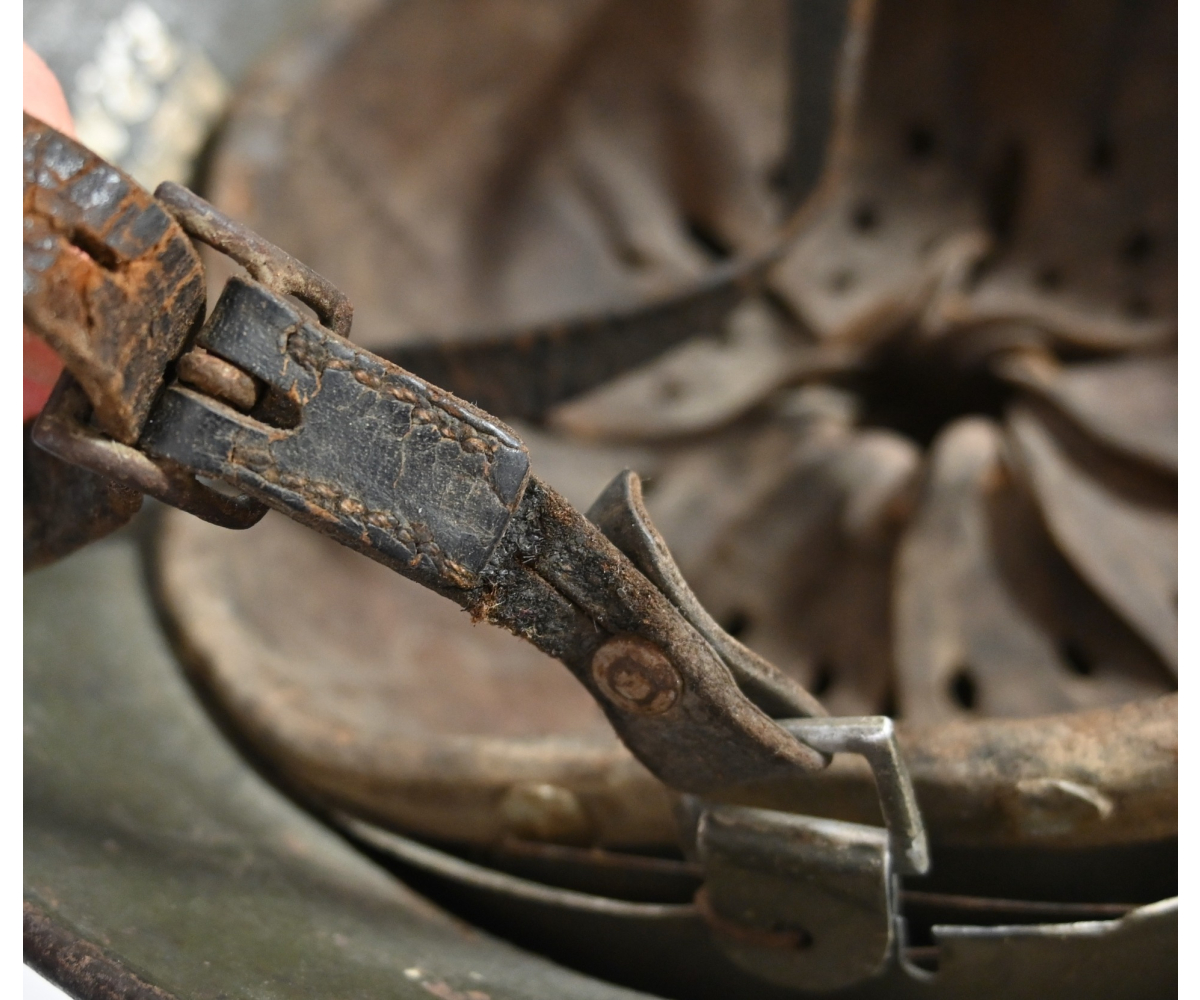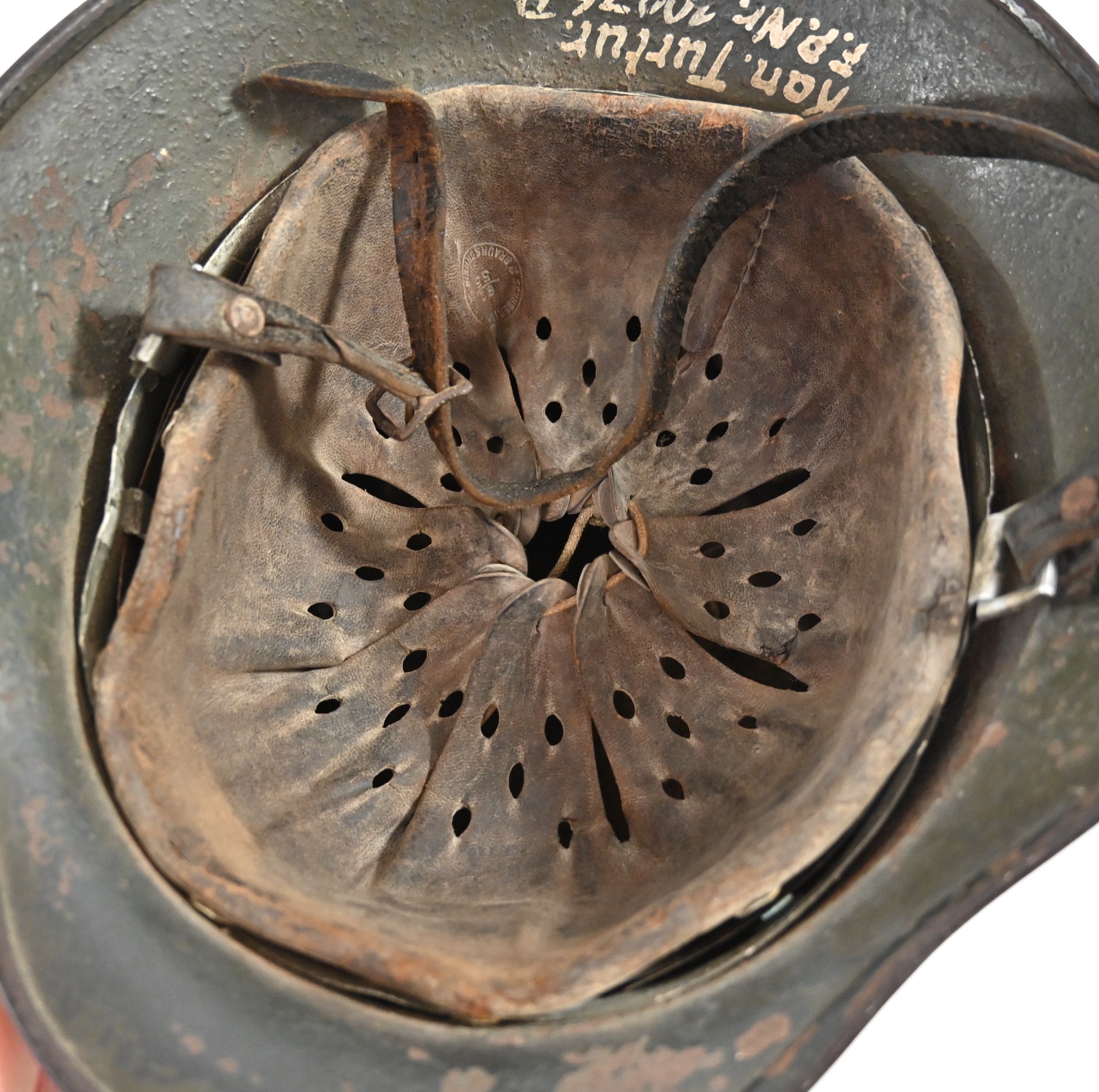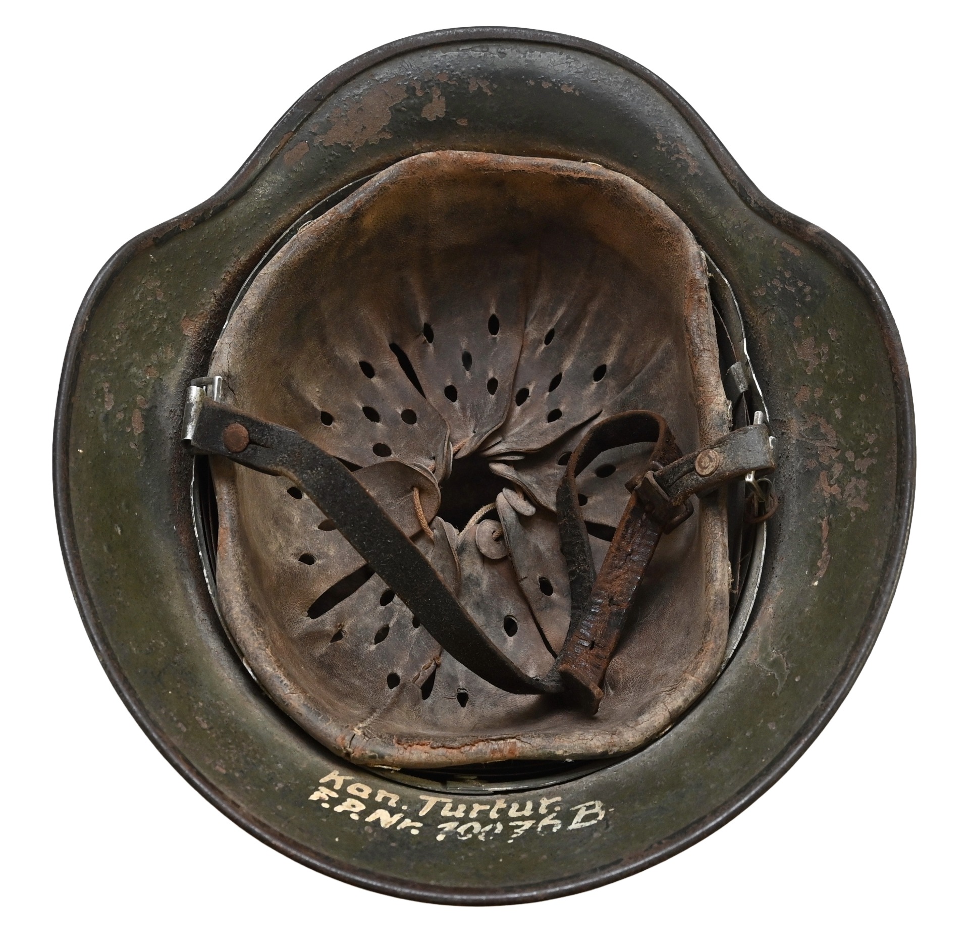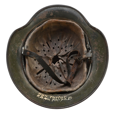 The helmet is named to Kanonier 'Turtur' who had 'Feldpostnr. 10076B'. It is difficult to say when these markings were applied. The feldpostnr. tells that kanonier Turtur served within the 1.batterie schwere Stellungs-Werfer-Abteilung 103. This abteilung was formed in October 1943 and operated/was stationed on the western front. In early 1944 the abteilung was used to formed the III.Abteilung schwere Stellungs Werfer Abteilung 101 which operated in the area of Cherbourg and participated in the fighting against the Allied forces during the Normandy campaign. It was destroyed in June 1944. A part of this unit the Feldpostnummer now refers to the 7.batterie schwere Stellungs Werfer Abteilung 101.
