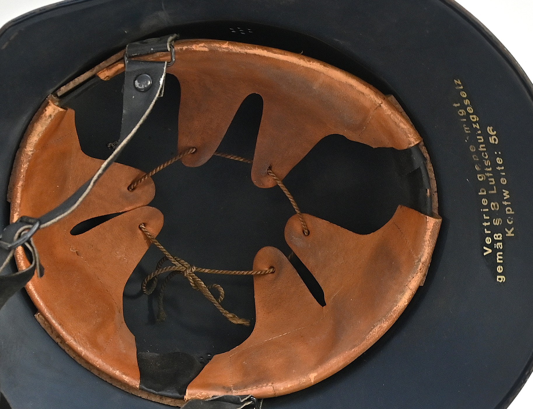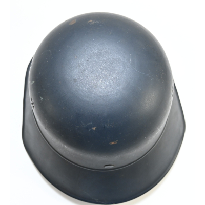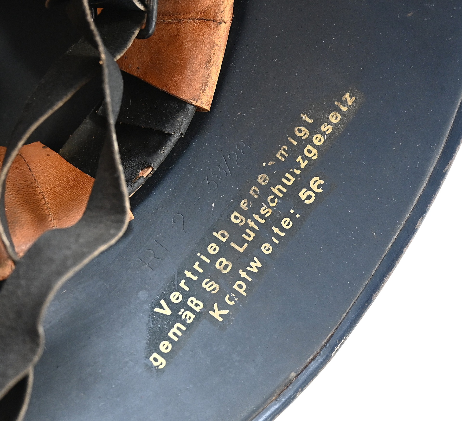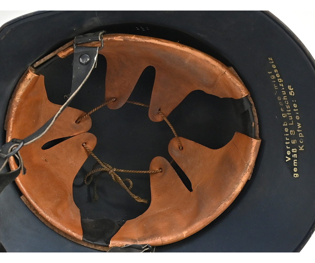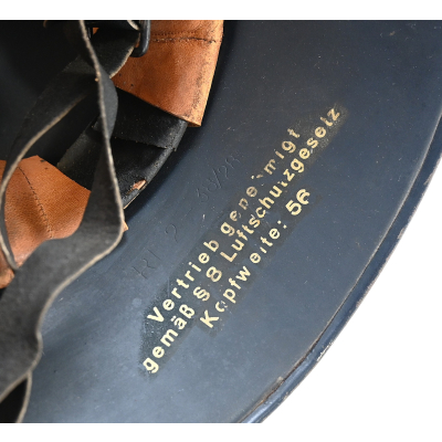 The helmet shows overall normal signs of wear. All of its original blue color is present and the decal is for 99% intact. The liner and chin strap are present. The helmet is nicely 'RL-2 38/28' marked. The size of the helmet is 56.