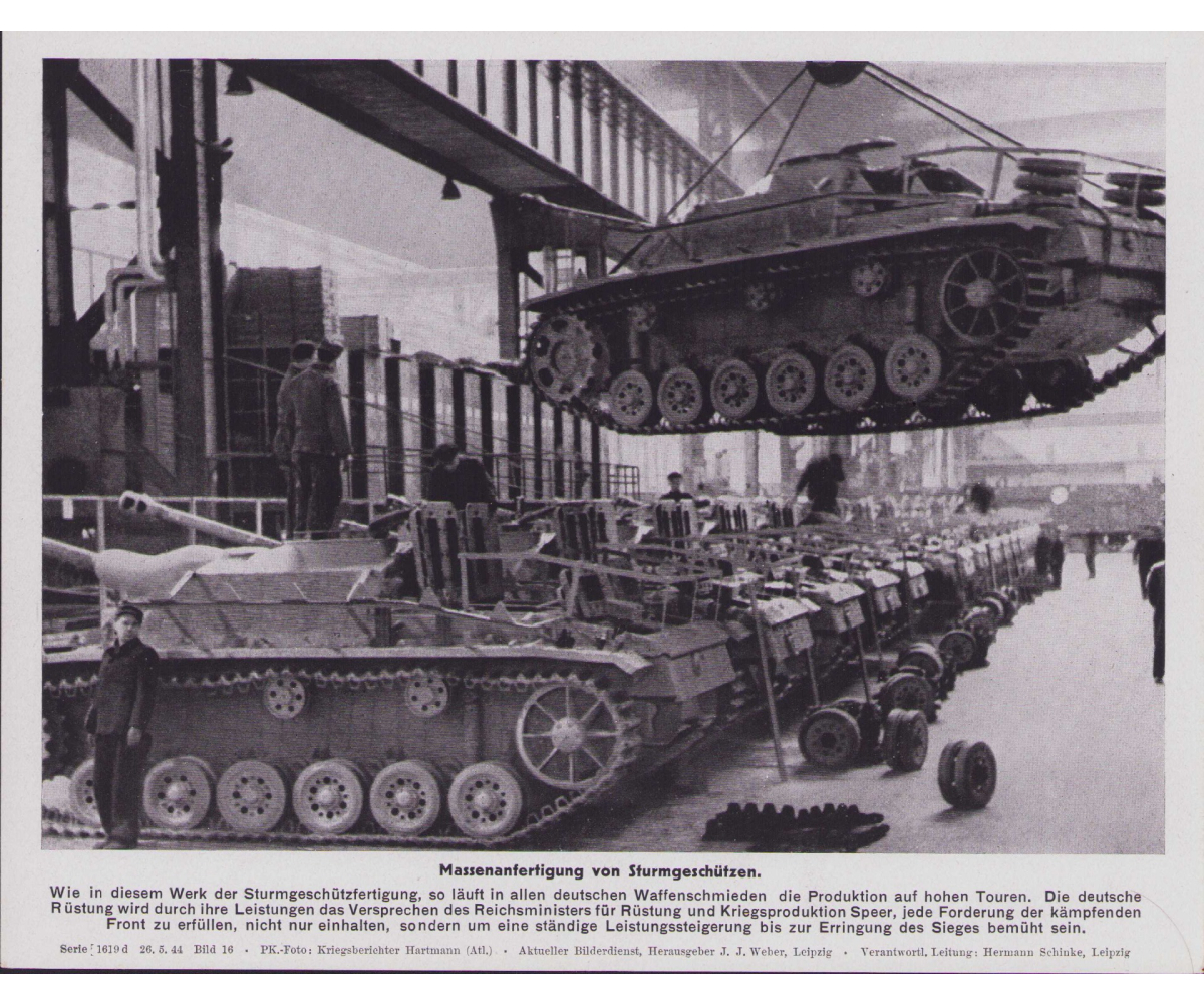 The photo shows overall normal signs of storage wear. Newly build StuGs in the factory.