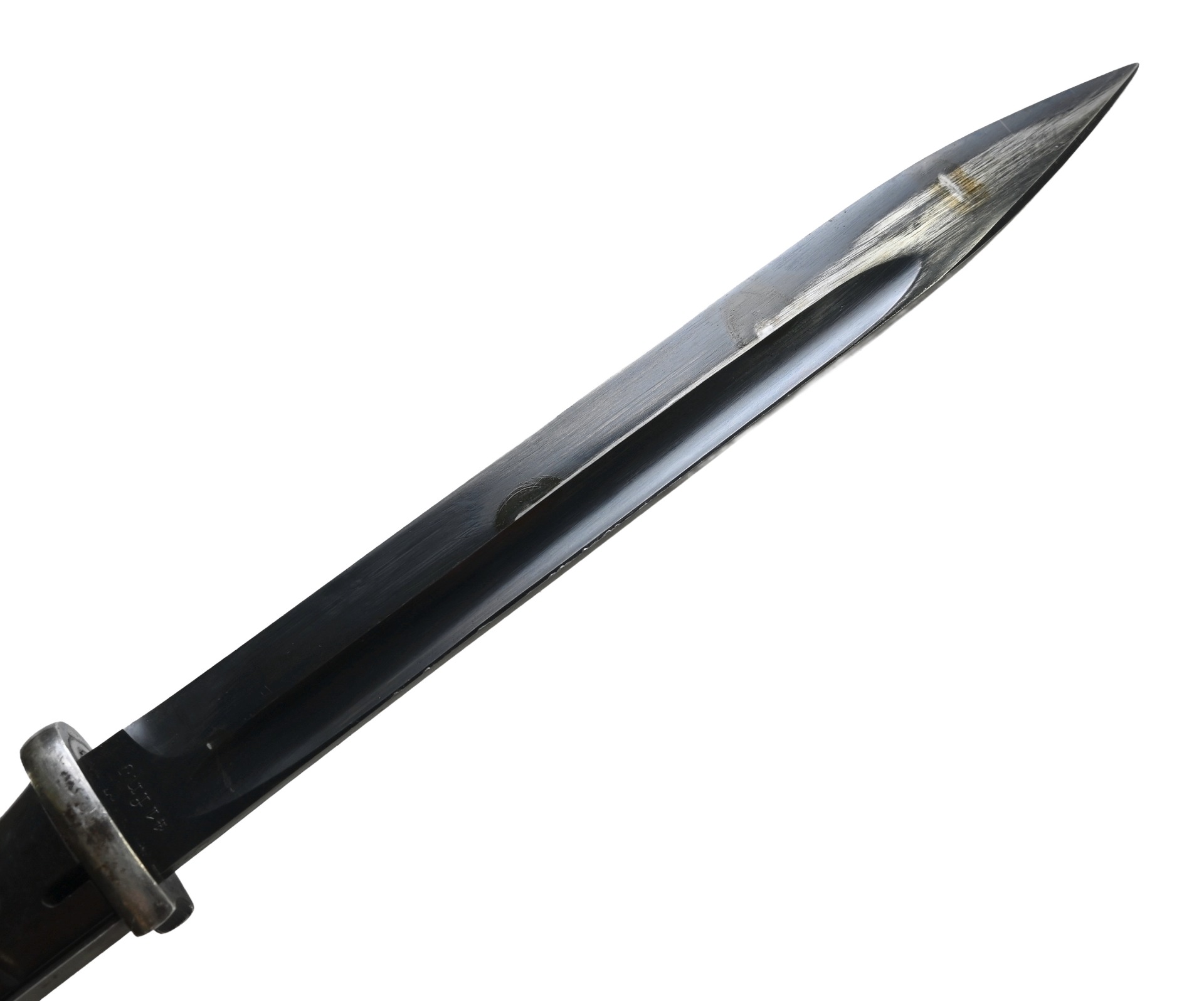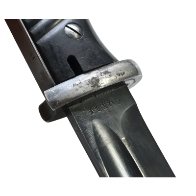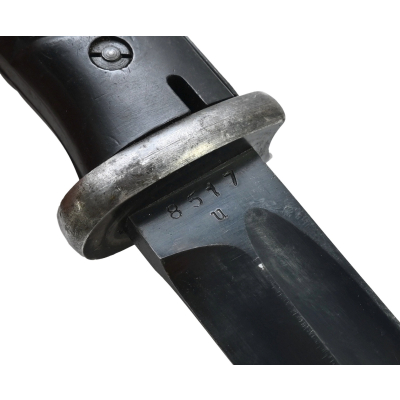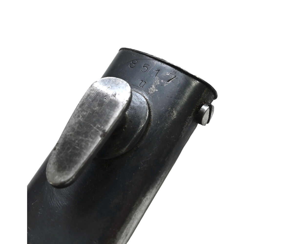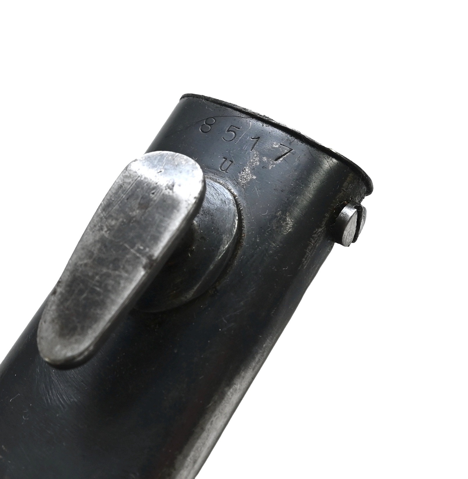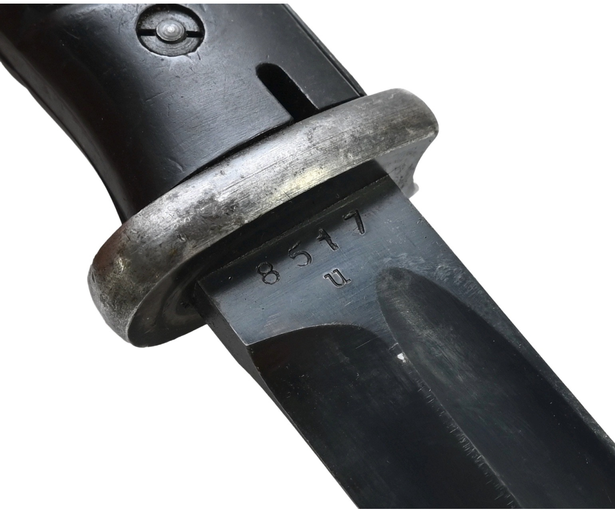 Both the bayonet as the scabbard are marked with the number ‘8517' and on the other side with the maker 'fnj' ('Alexander Coppel GmbH' from 'Solingen'). The set is made in '1941'. Both the blade as the bakelite grips are in good condition. The set has multiple 'WaA' stamps (see photos).