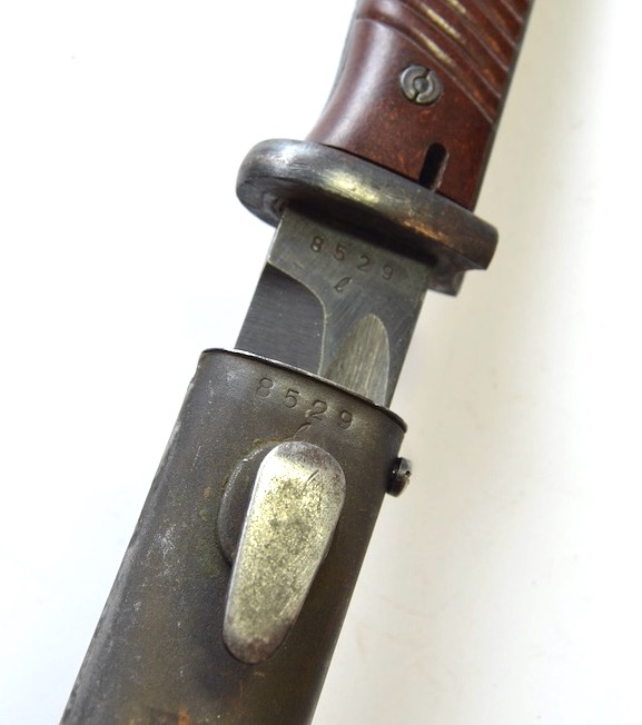 Both the bayonet as the scabbard are marked with the number ‘8529’ and on the other side with ‘cof44’ which means the producer is 'Carl Eickhorn' from 'Solingen' and it's made in '1944'. The scabbard, blade and beautifull brown bakelite grips are in used but very good condition. The blade isn't sharpened or reblued. The set has multiple 'WaA' stamps (see photos). Overall a beautiful set!