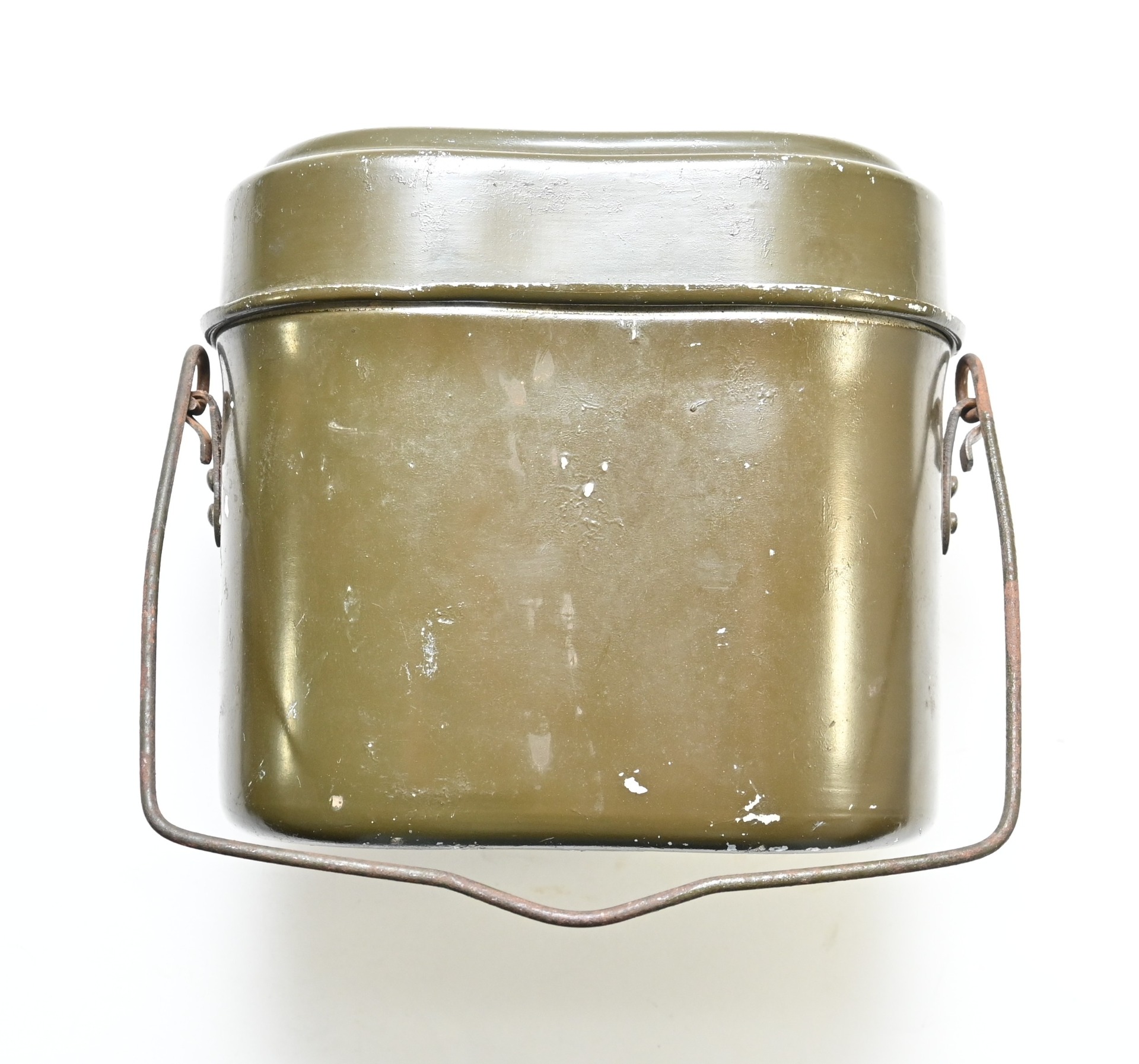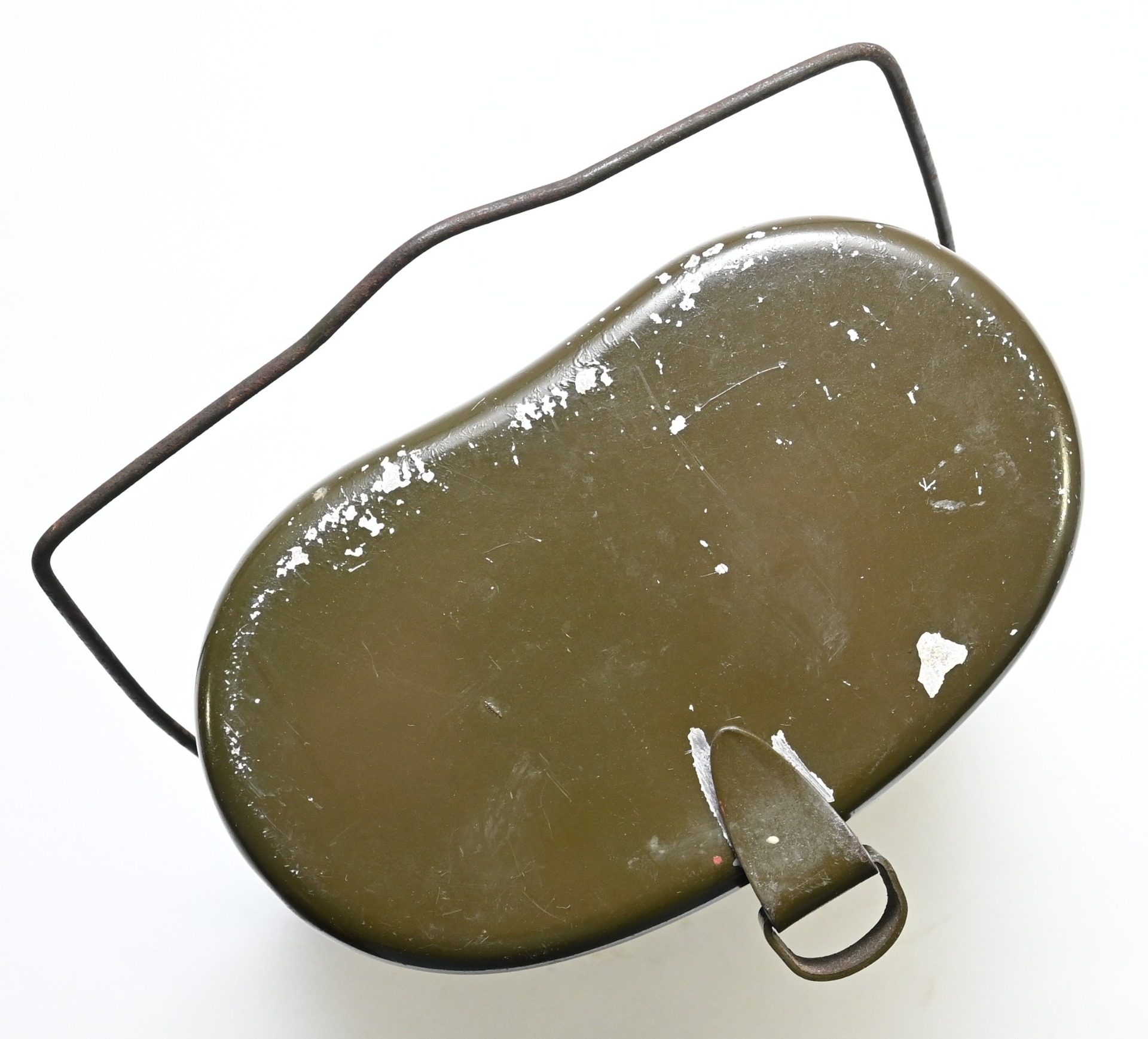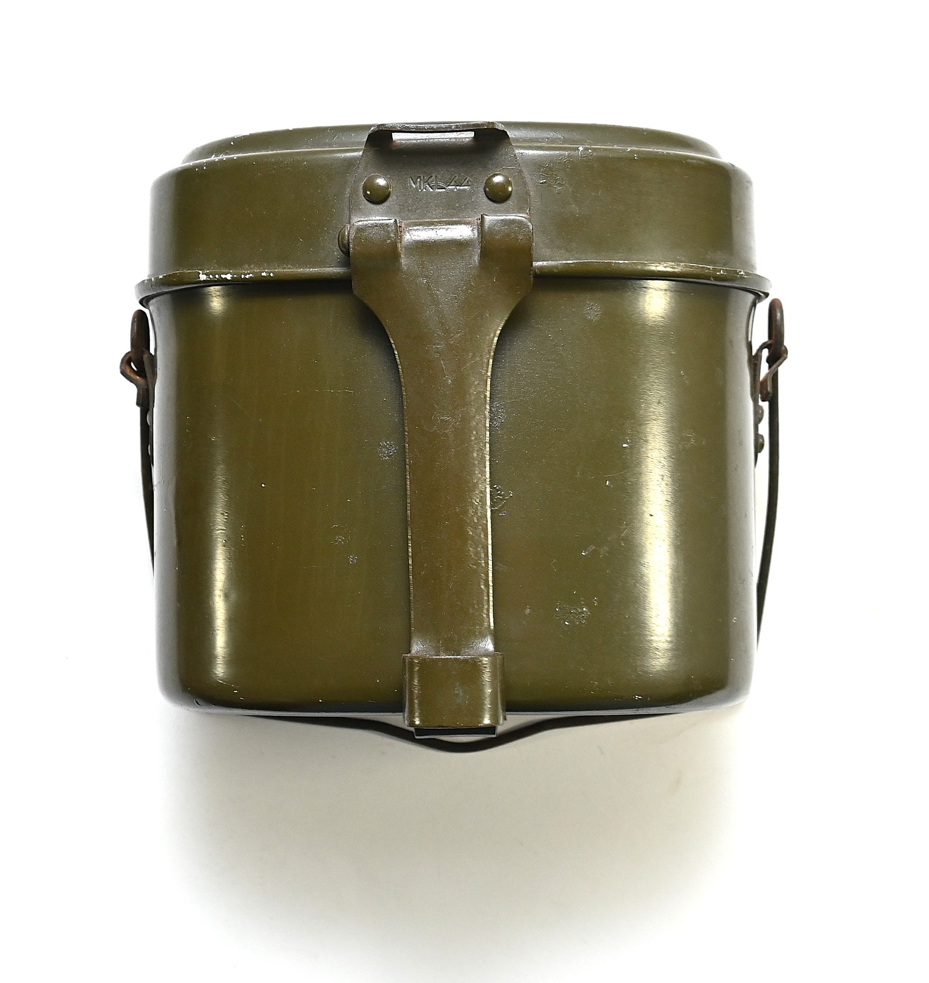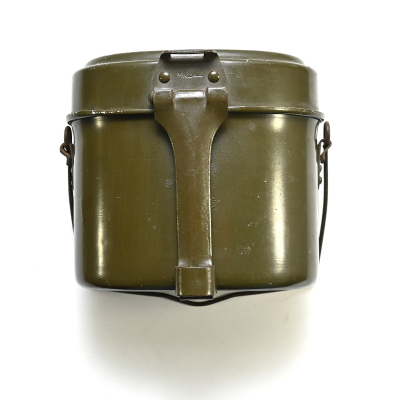 The mess kit or 'Kochgeschirr' shows overall normal signs of wear. Around 99% of its original green color is still present. Top and bottom are maker matching with 'MKL44' which indicats it was produced by Max Kamper from Lüdenscheid.