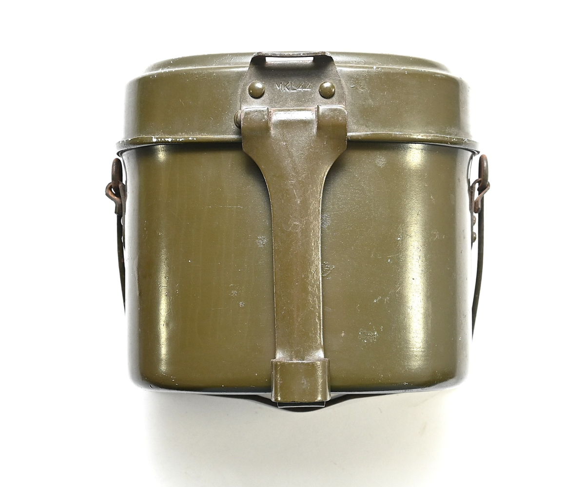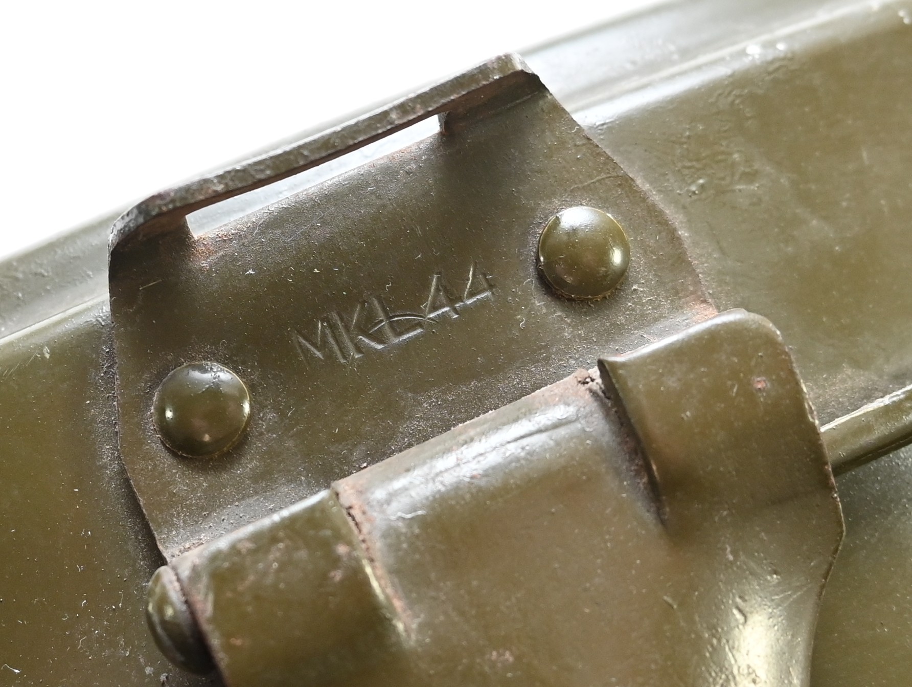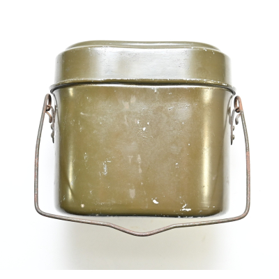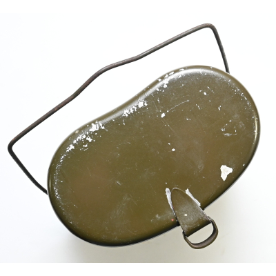 The mess kit or 'Kochgeschirr' shows overall normal signs of wear. Around 99% of its original green color is still present. Top and bottom are maker matching with 'MKL44' which indicats it was produced by Max Kamper from Lüdenscheid.