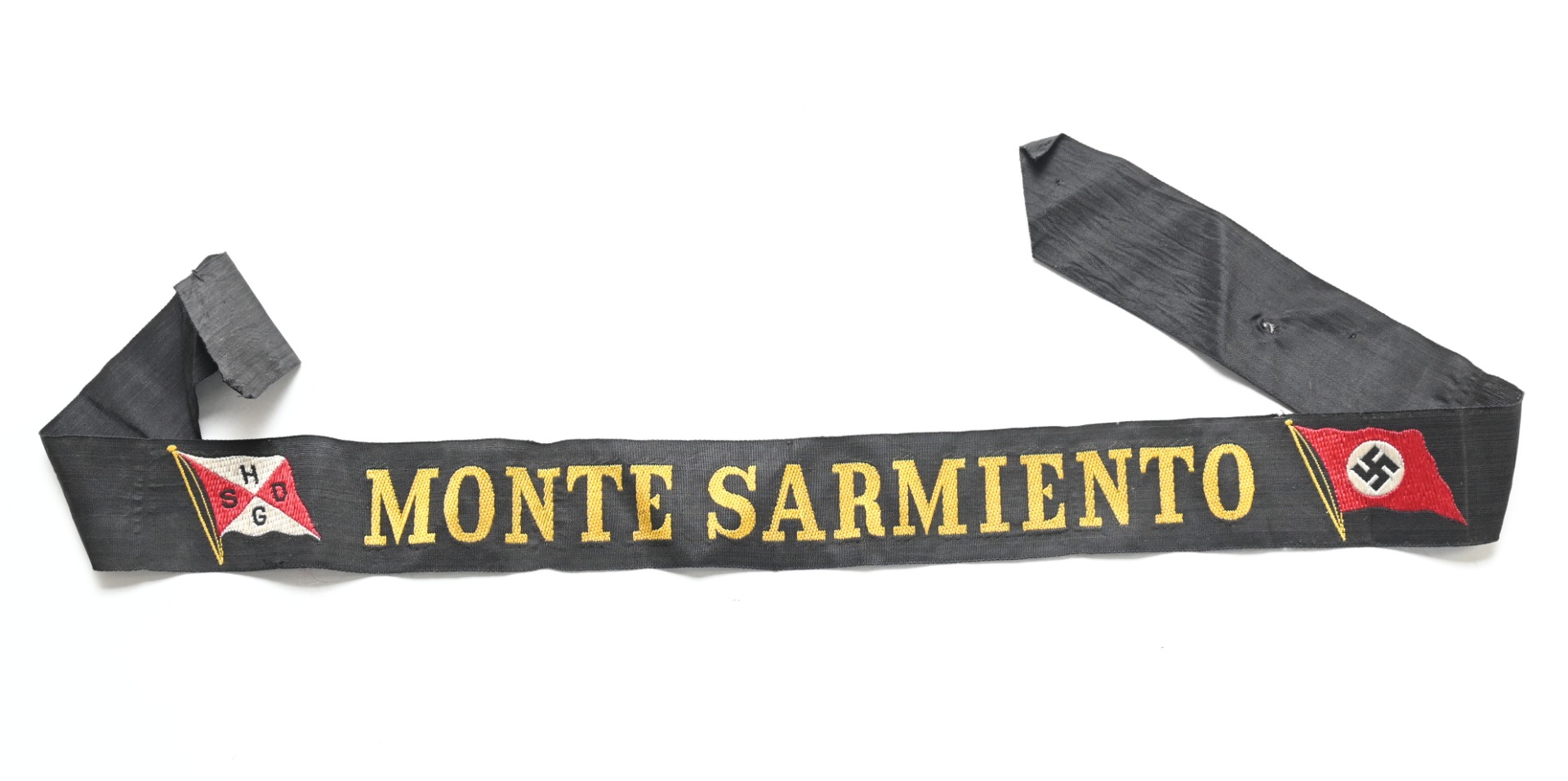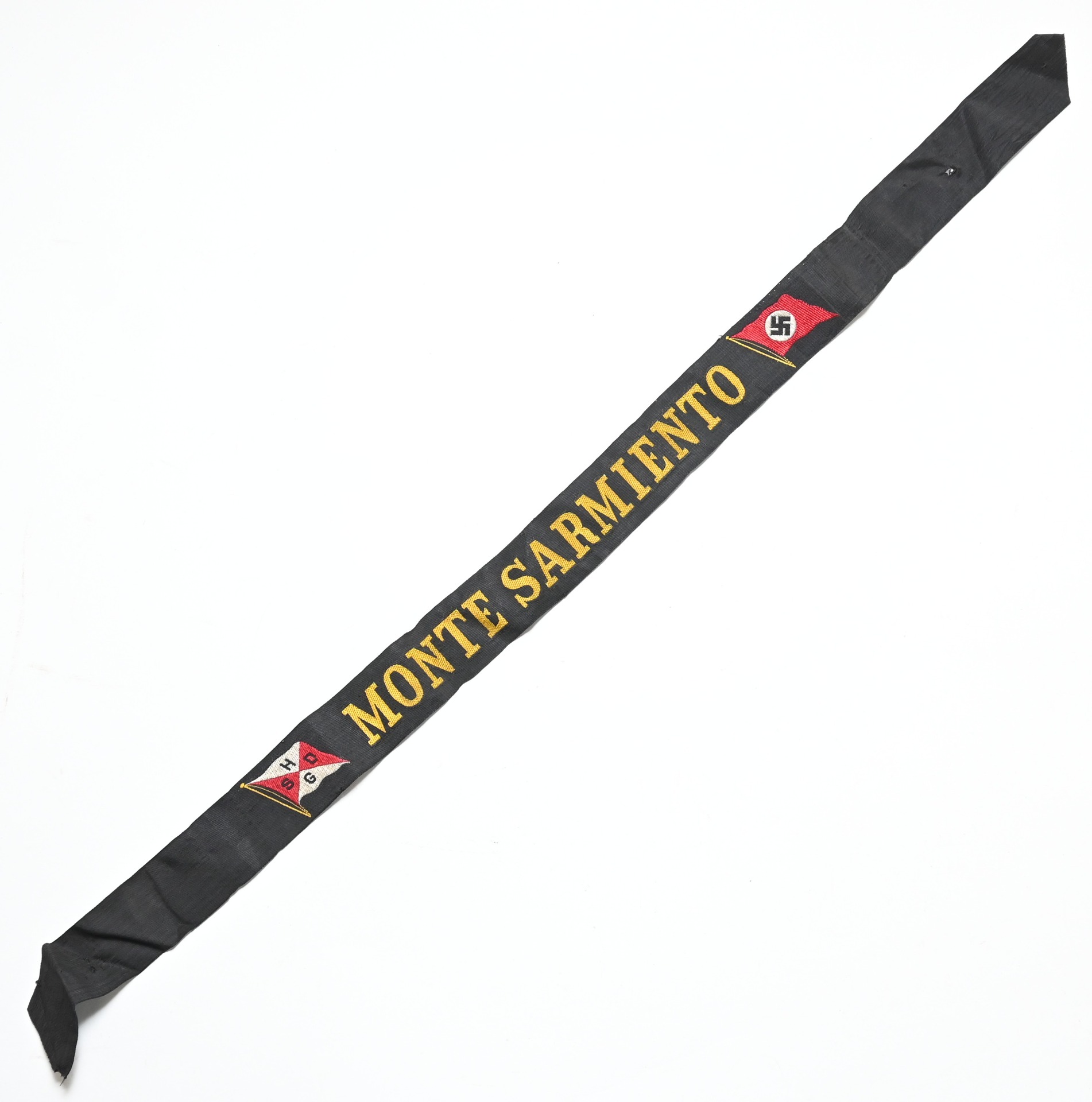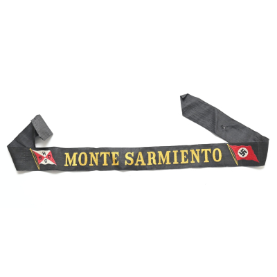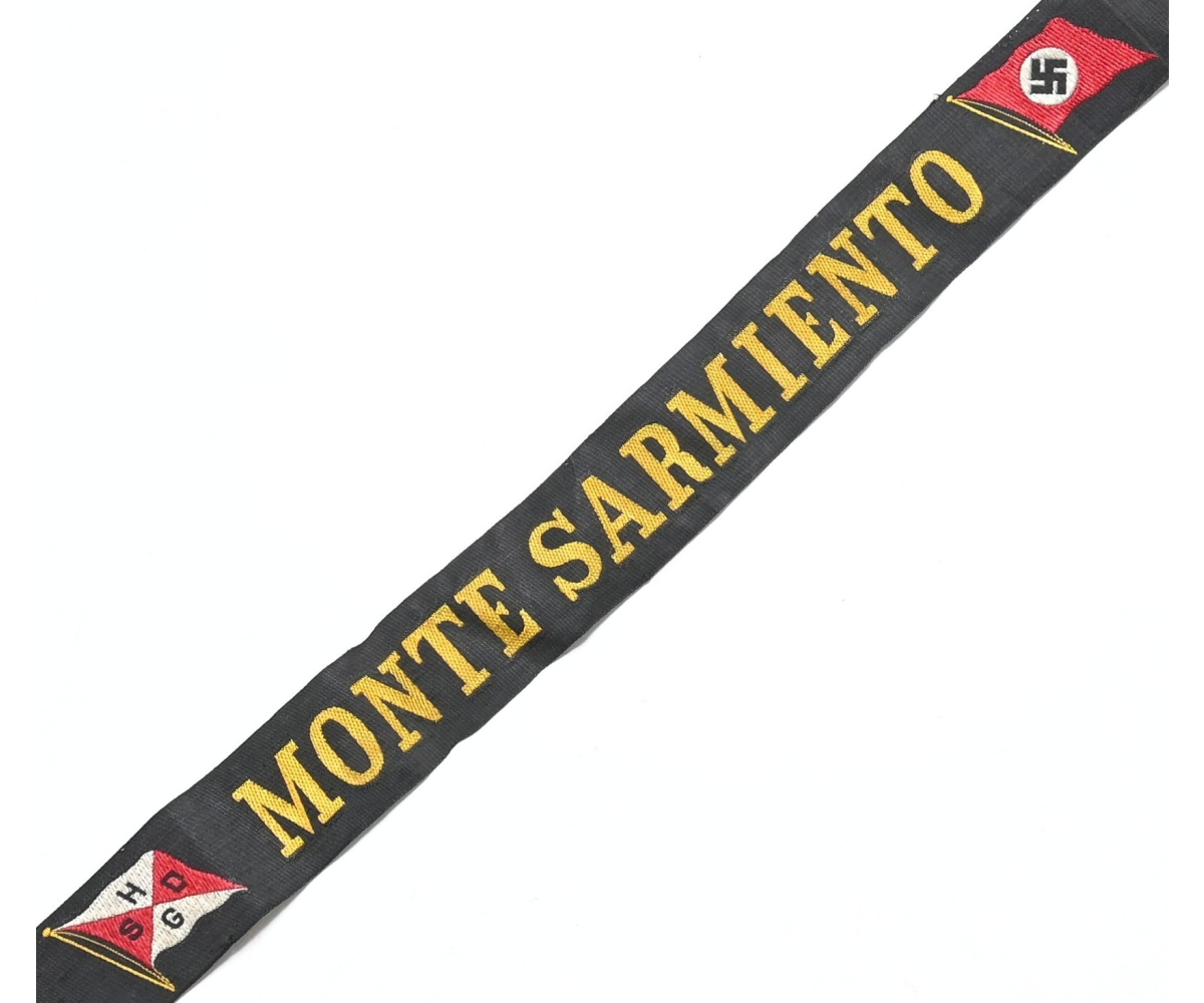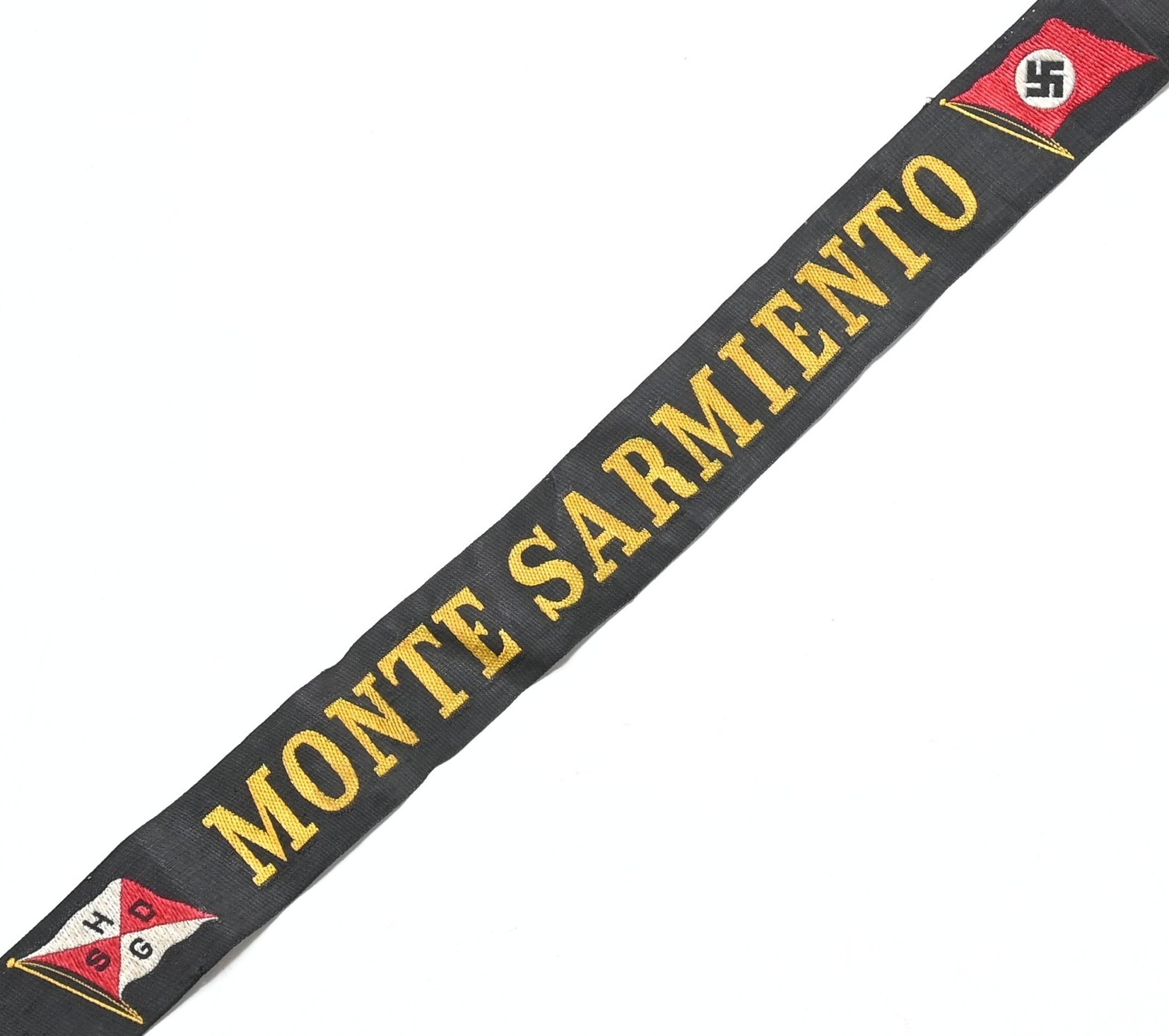The tally shows overall signs of wear. The merchant ship Monte Sarmiento was build in 1924. In 1939 it became a 'Wohnschiff' of the Kriegsmarine in Kiel. It was sunk in 1942 due to a hit by a bomb.