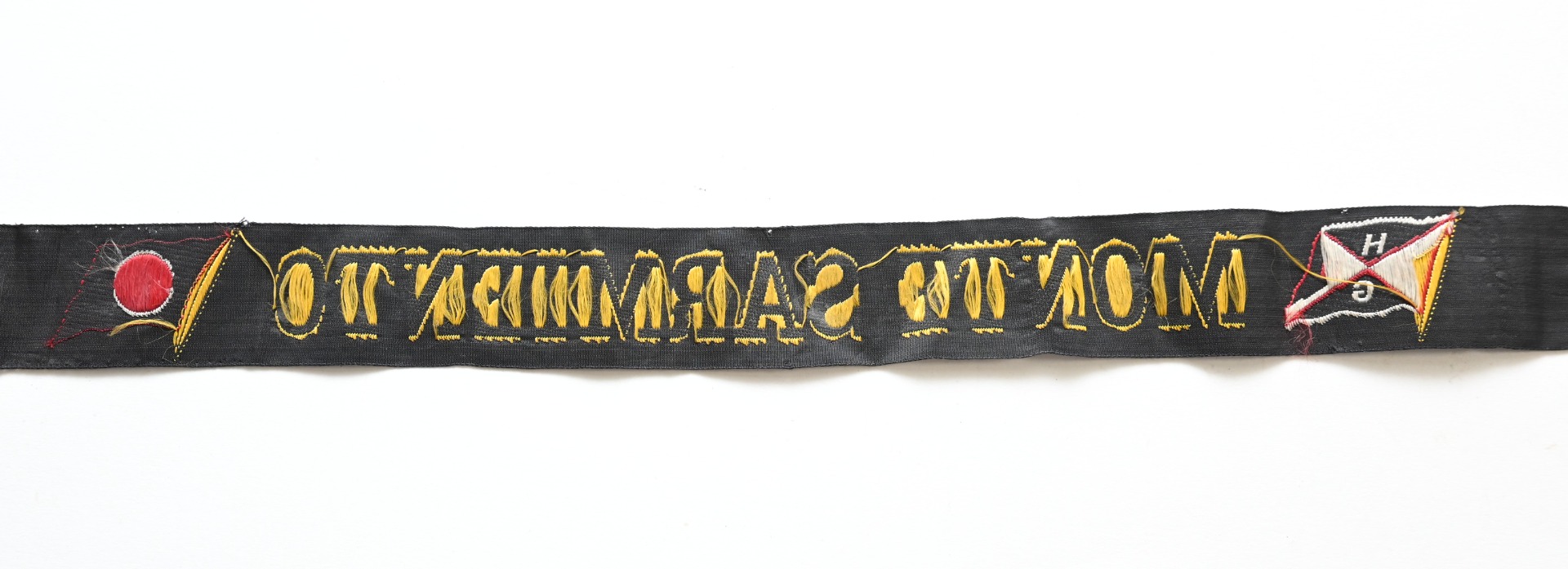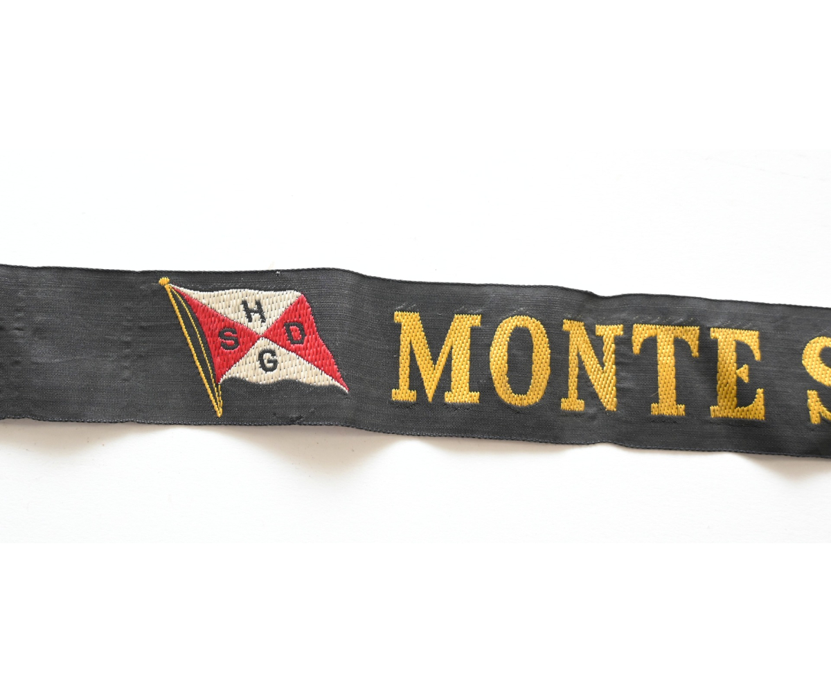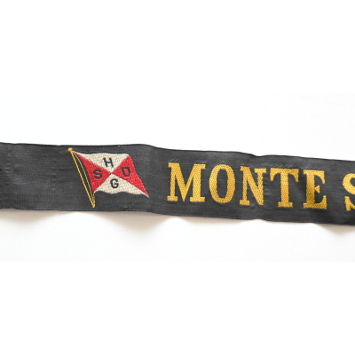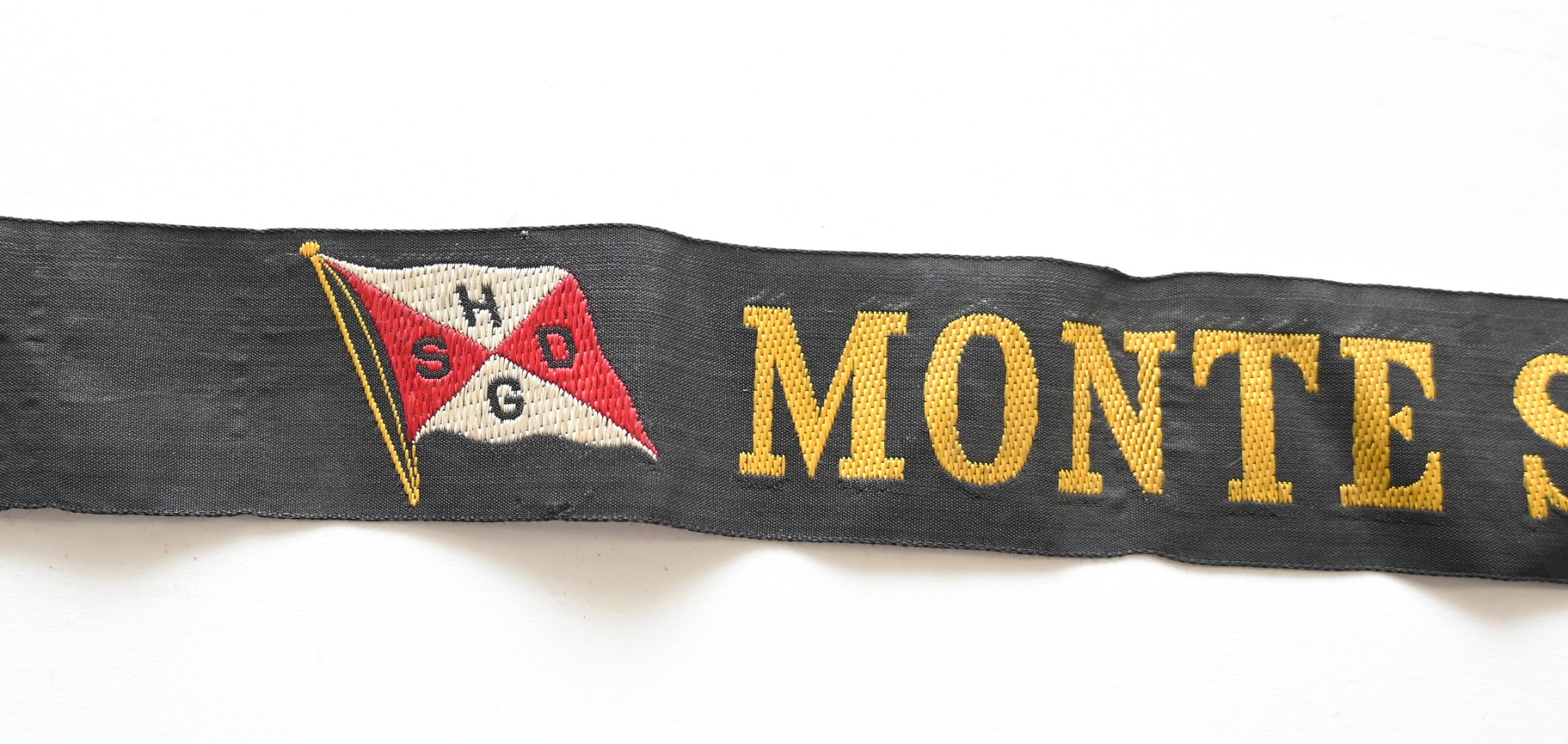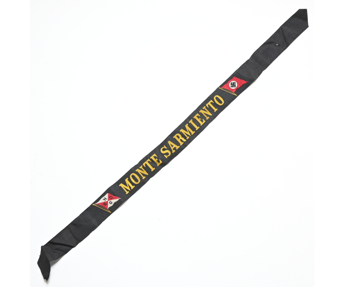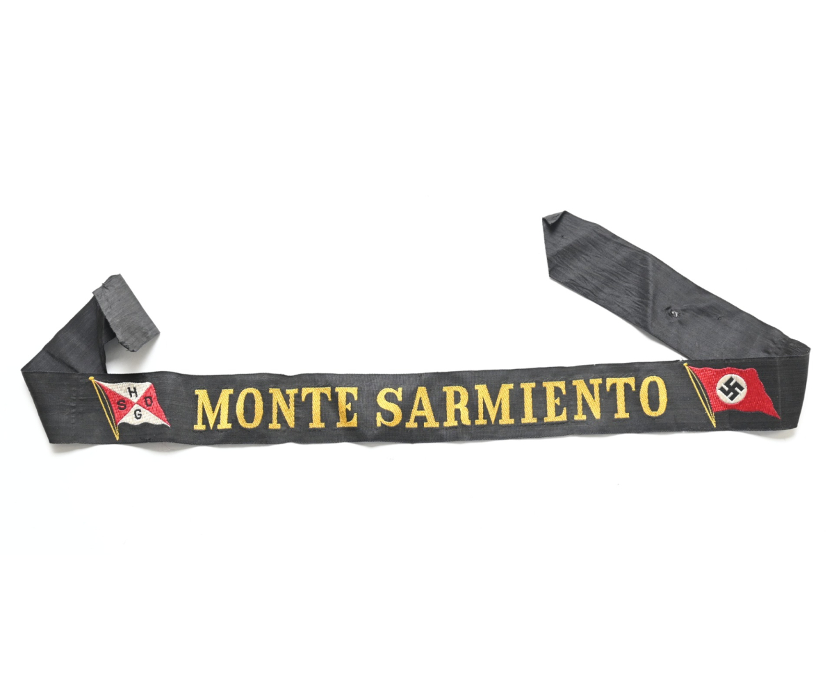 The tally shows overall signs of wear. The merchant ship Monte Sarmiento was build in 1924. In 1939 it became a 'Wohnschiff' of the Kriegsmarine in Kiel. It was sunk in 1942 due to a hit by a bomb.