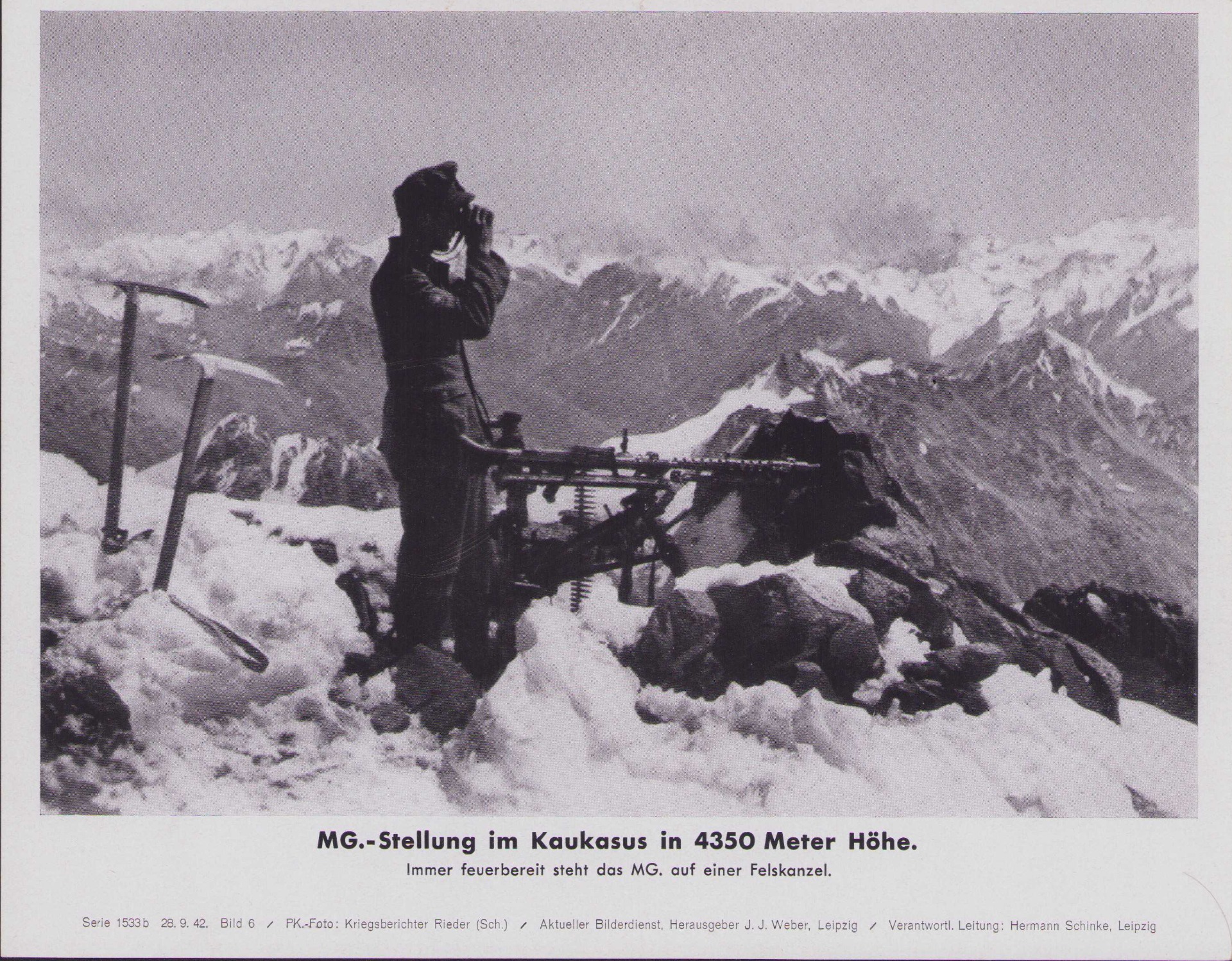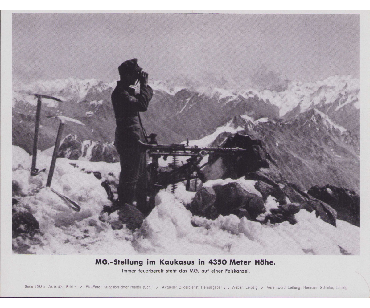 The photo shows overall normal signs of storage wear. It shows a Gebirgsjäger MG34 crew on top of a 4350m mountain.