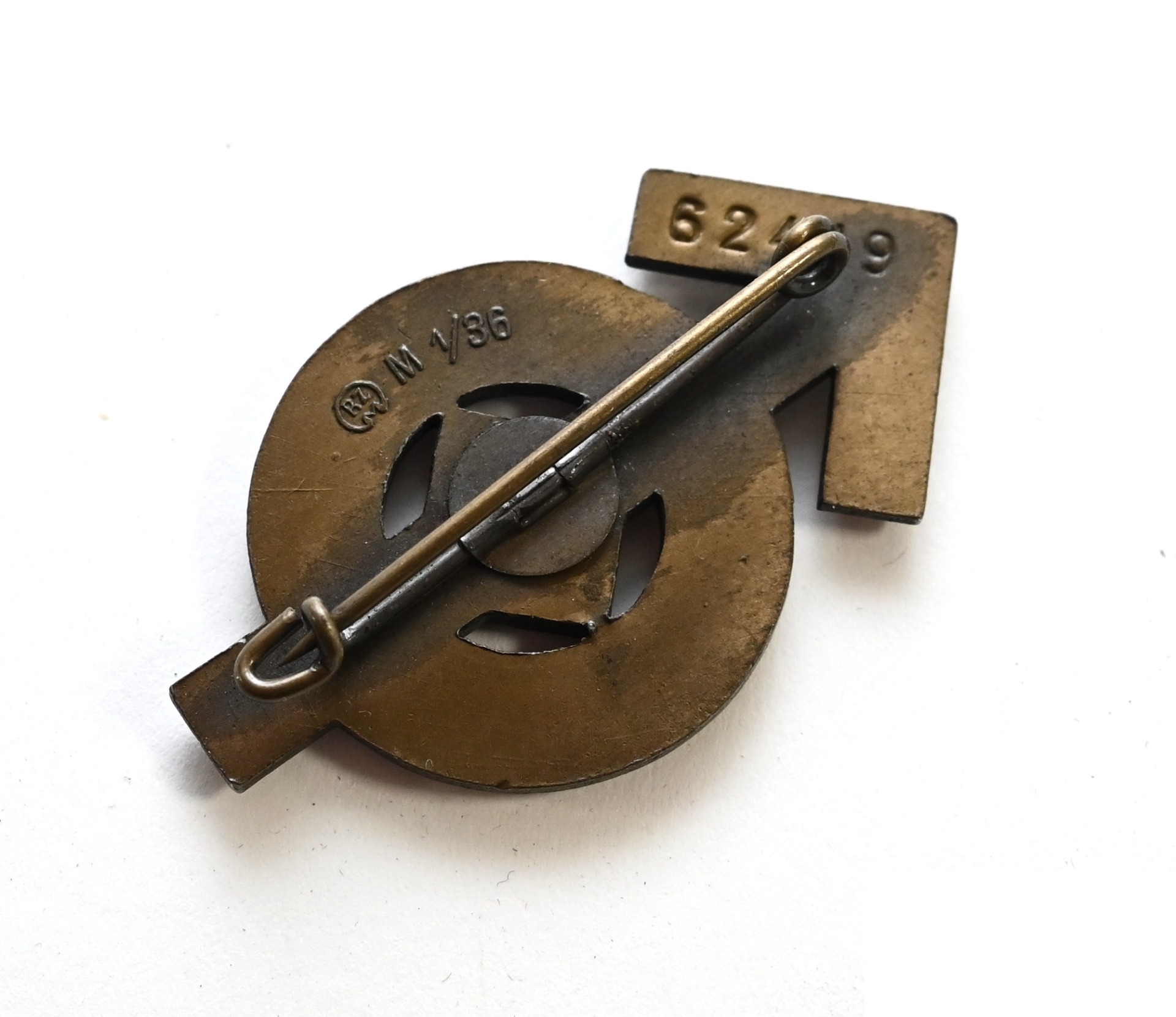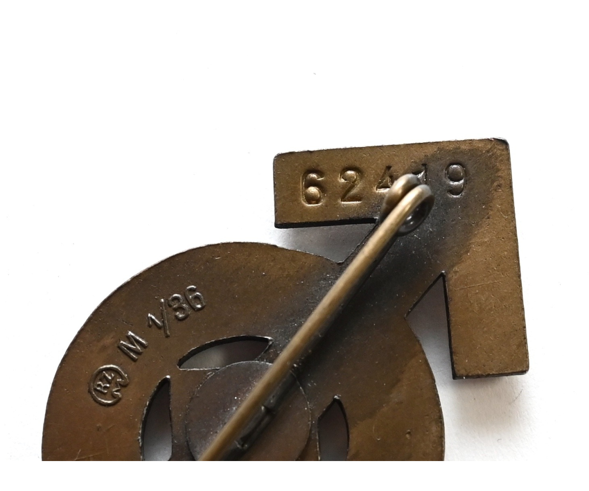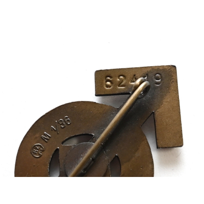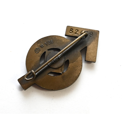 The abzeichen is in mint condition and still has all of it's bronze finish. It's complete with working pin on the back. Nicely marked with issue number: '62419'. Also maker marked with 'RZM M1/36' which means it was produced by 'Berg & Nolte AG', from 'Lüdenscheid'.