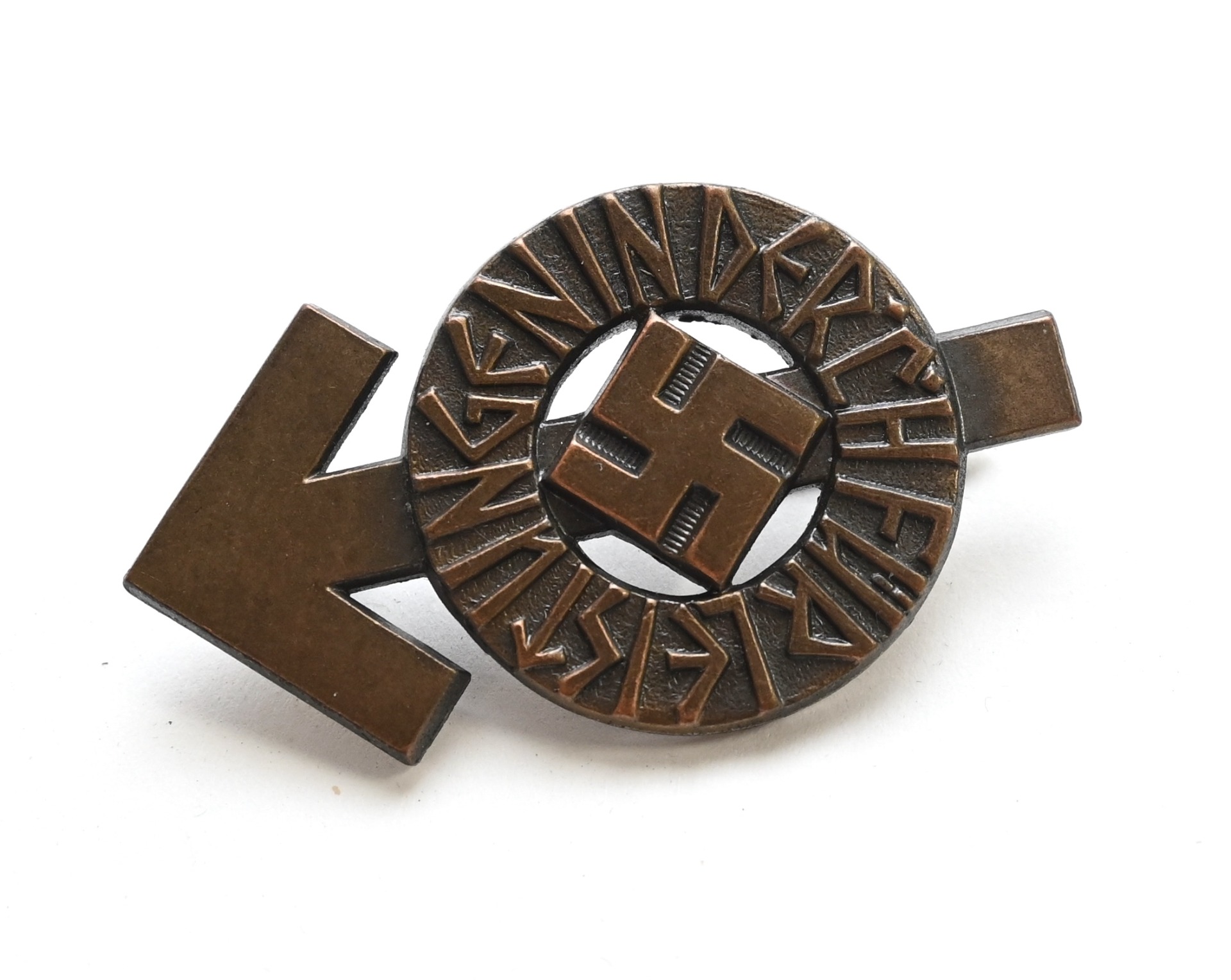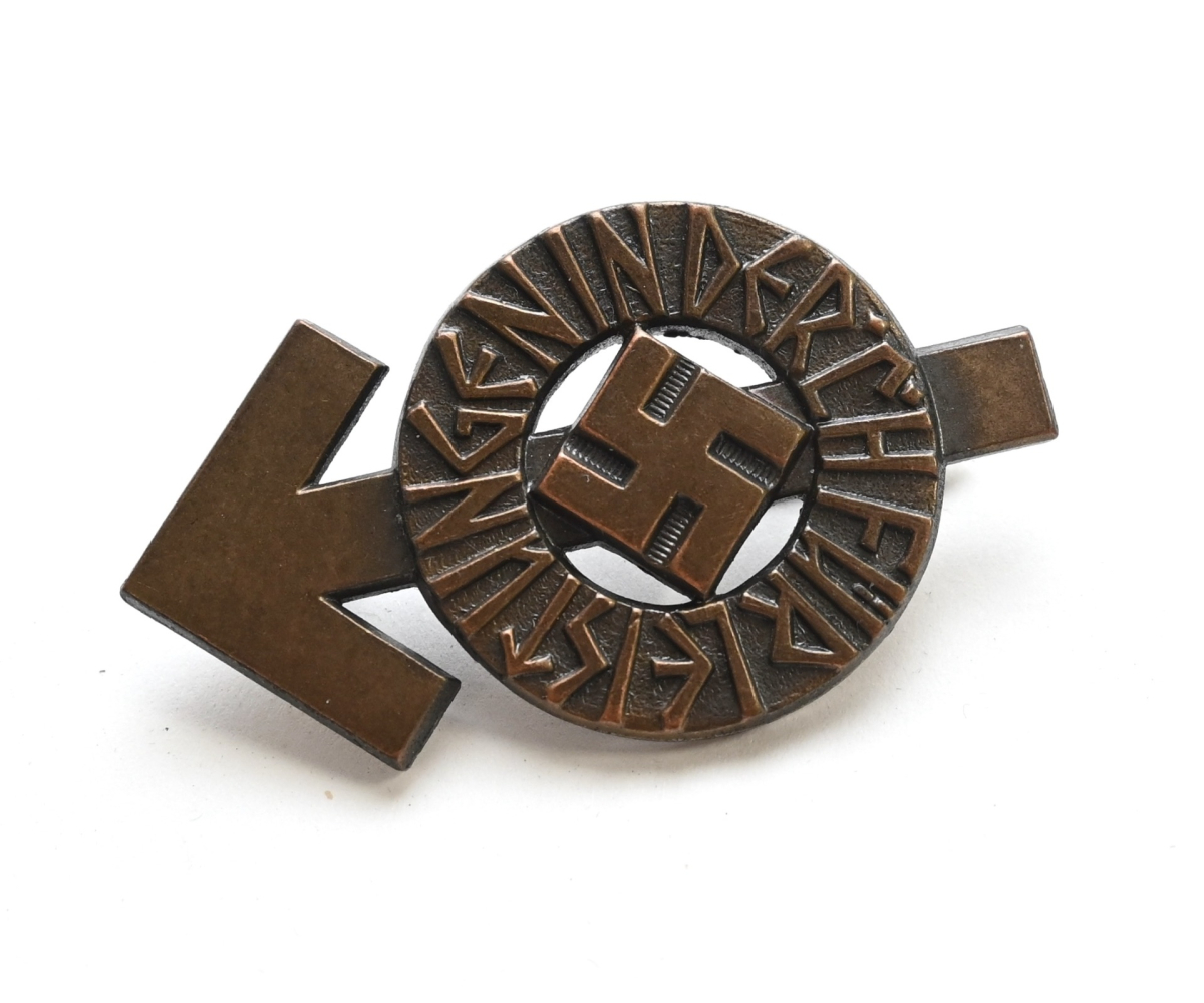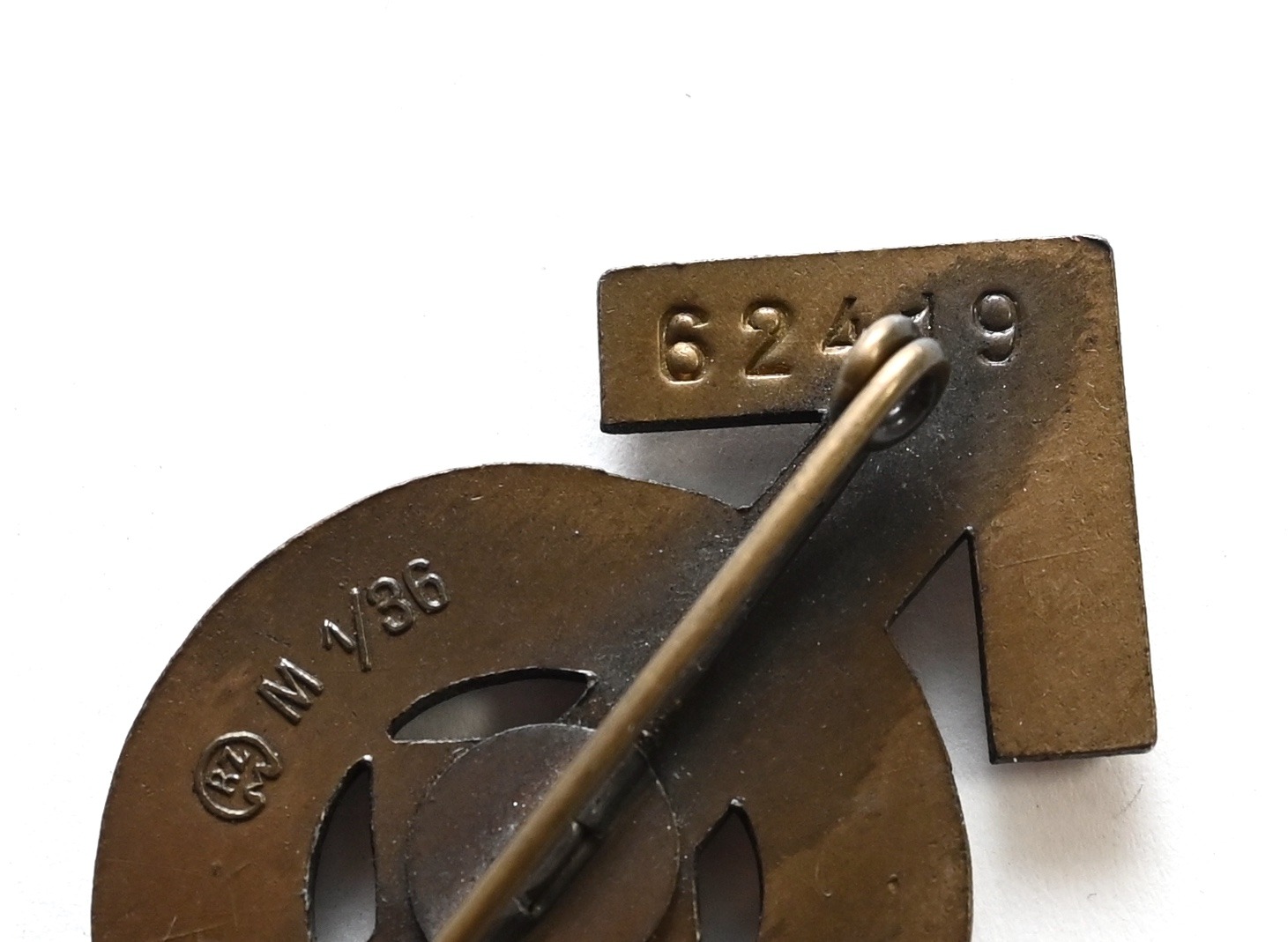 The abzeichen is in mint condition and still has all of it's bronze finish. It's complete with working pin on the back. Nicely marked with issue number: '62419'. Also maker marked with 'RZM M1/36' which means it was produced by 'Berg & Nolte AG', from 'Lüdenscheid'.