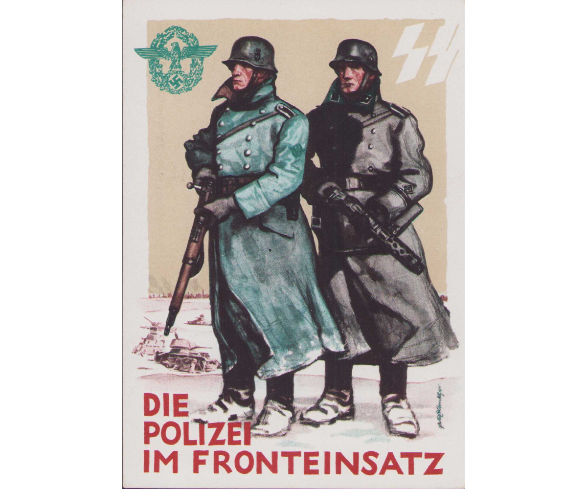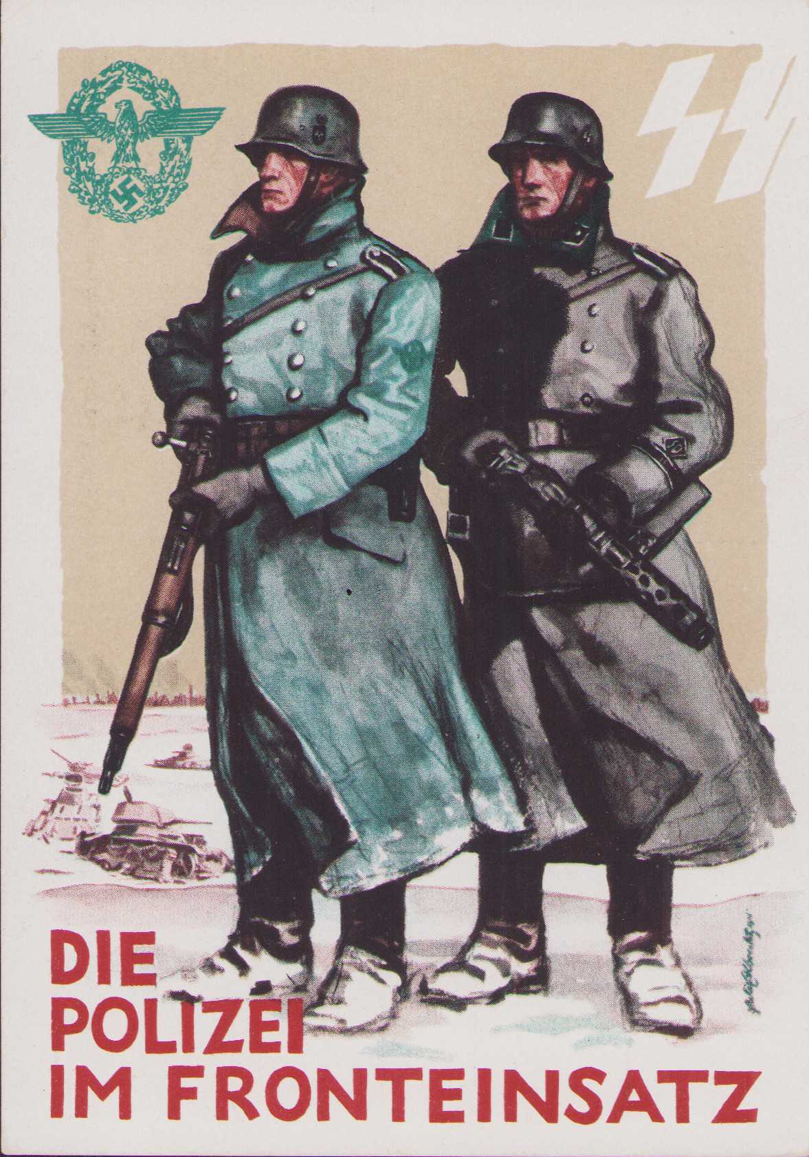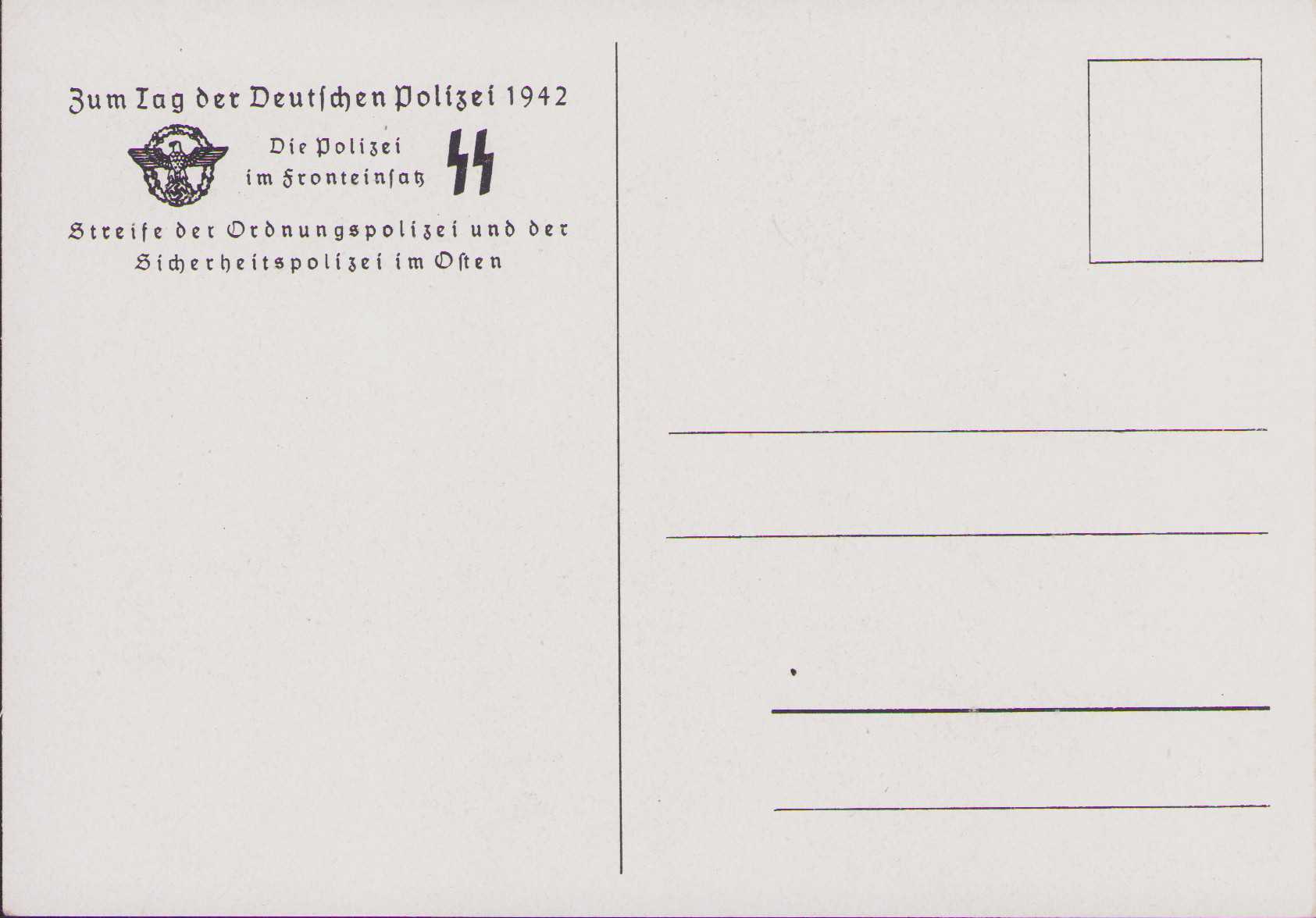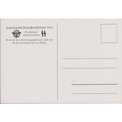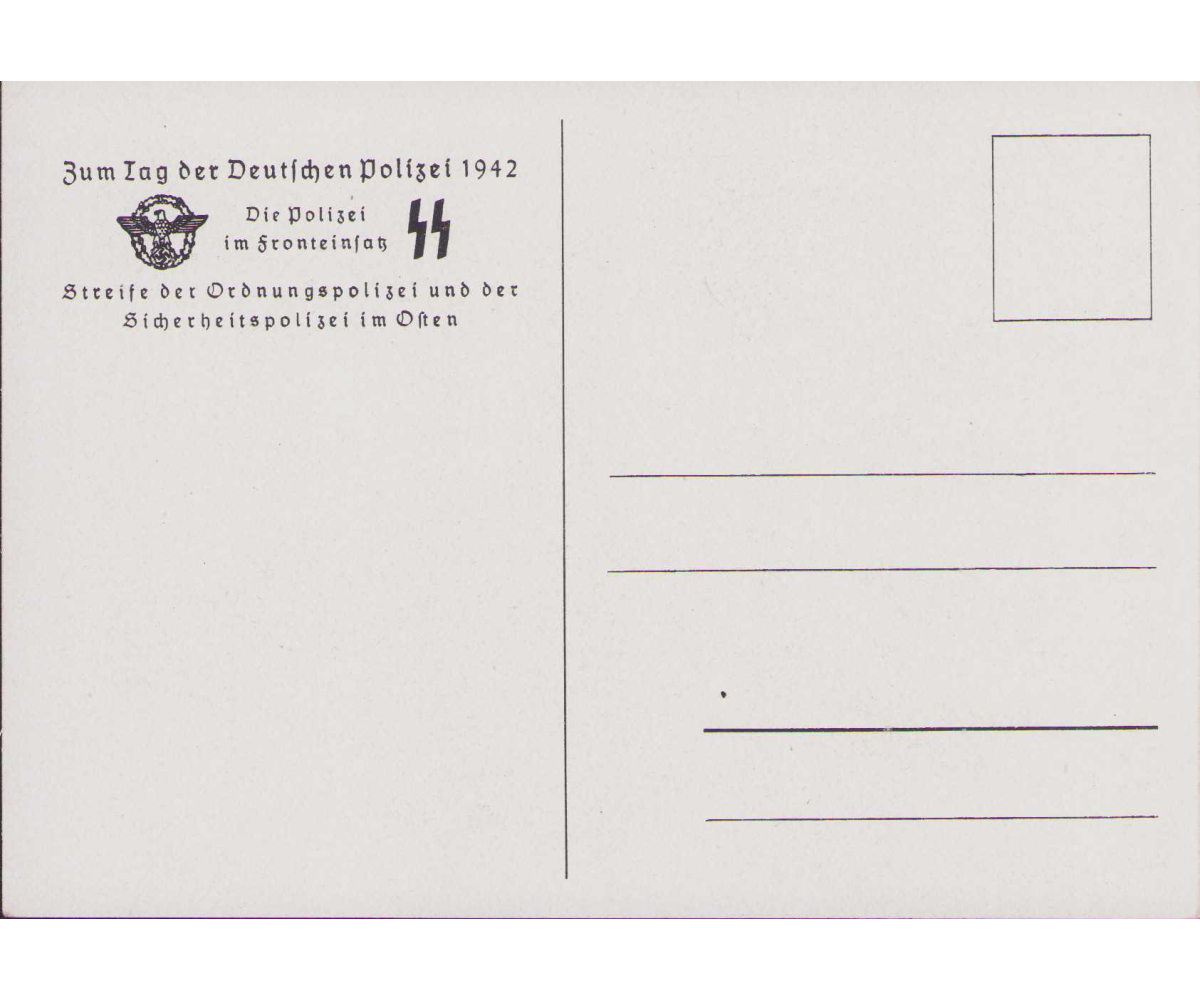 The postcard shows overall minor signs of storage wear. On the back nicely marked with the Polizei decal and SS runen. 'Zum Tag der Deutschen Polizei 1942'.