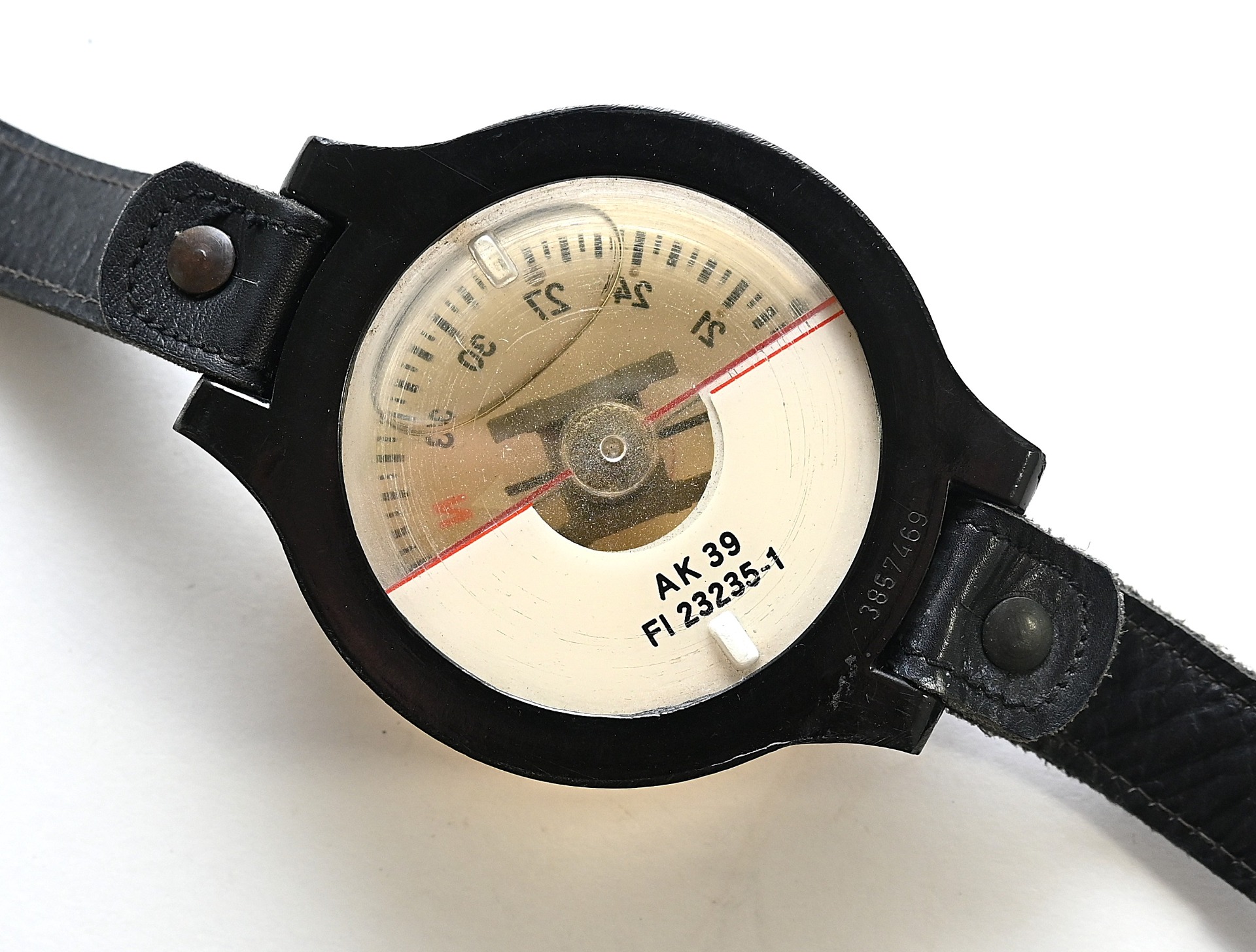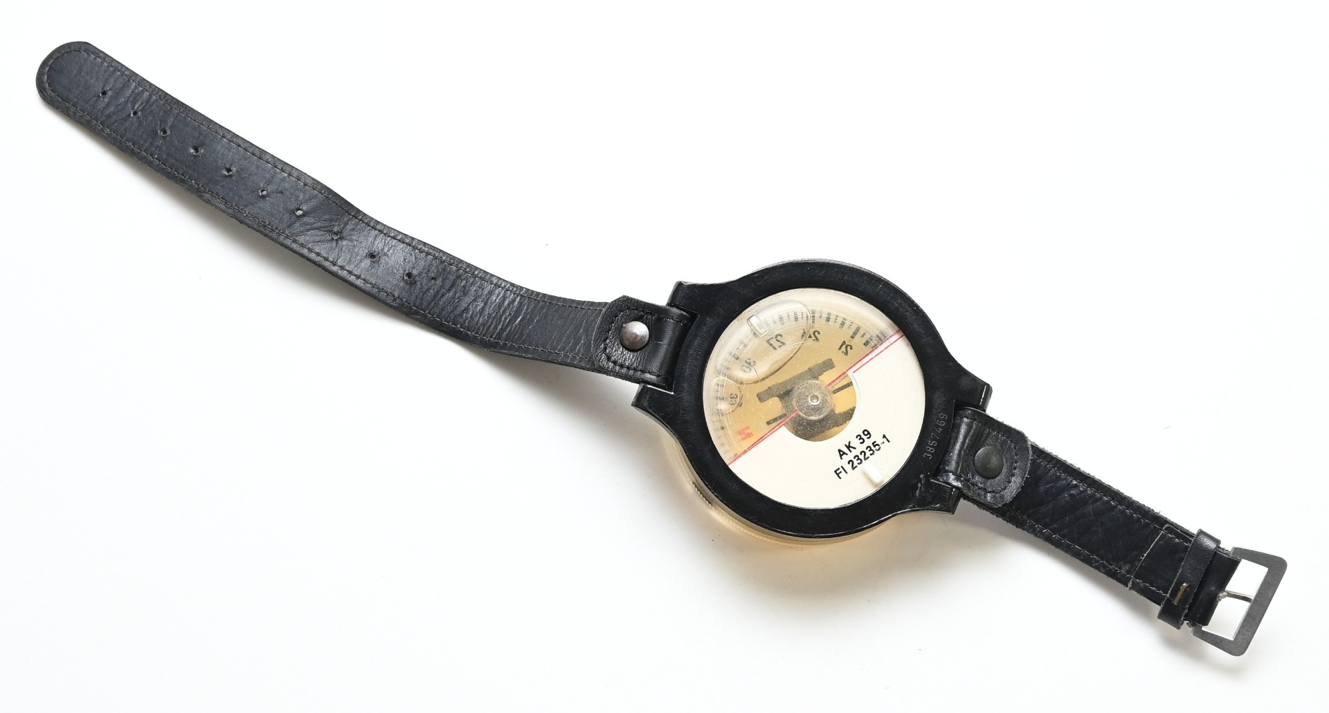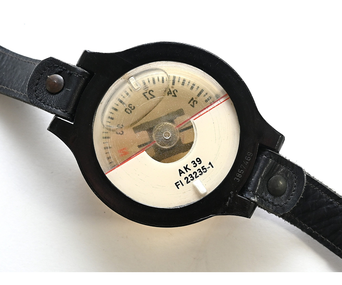 The compass shows overall minor to no signs of wear. It's in working order and complete with both leather straps. Marked on the back with 'AK39' and 'Fl23235-1'.
