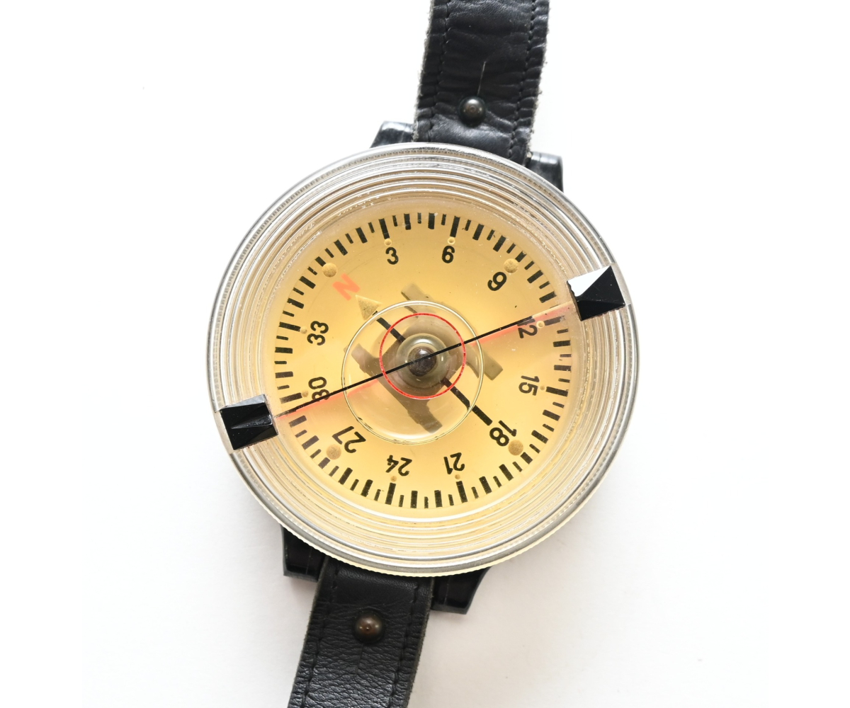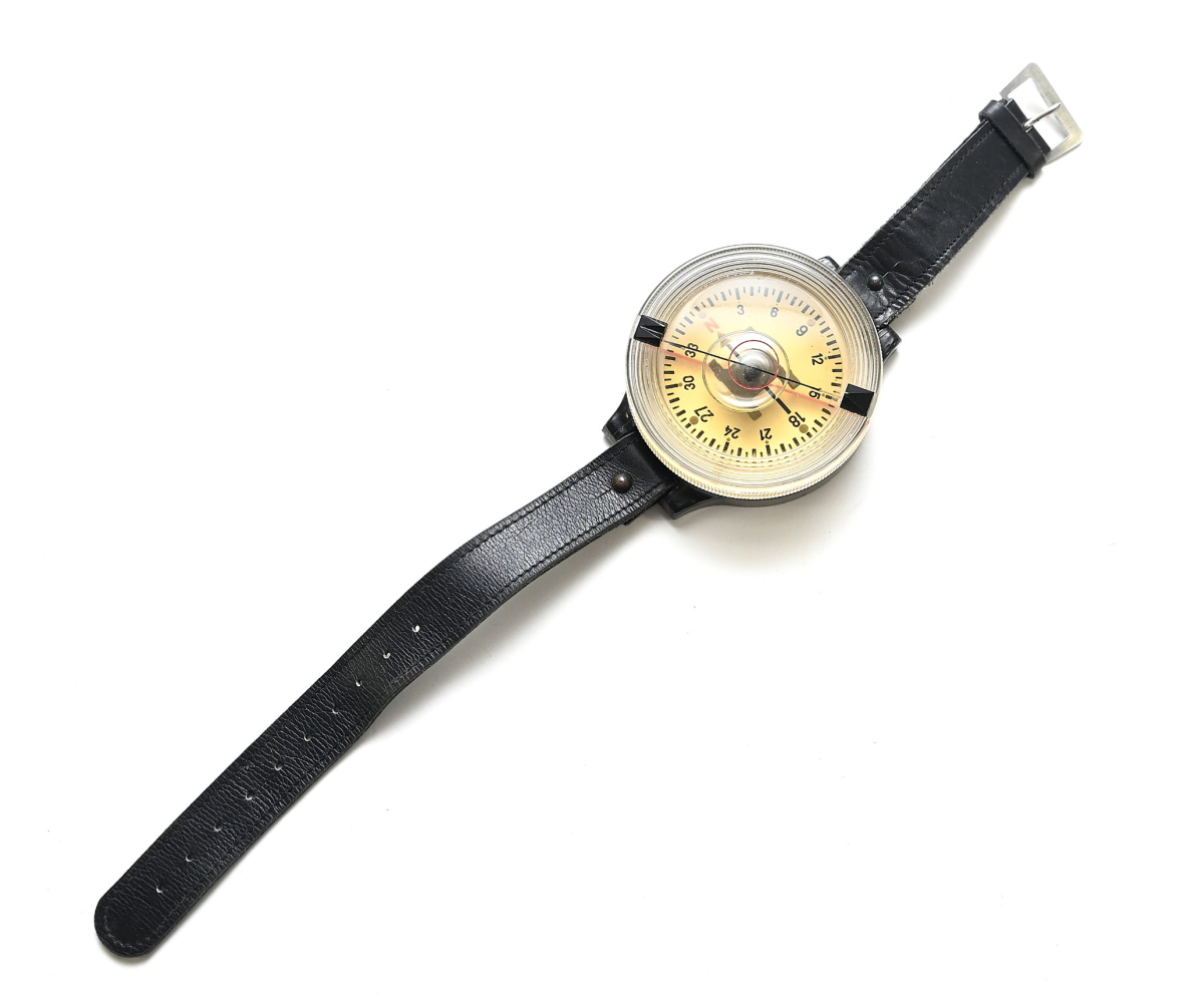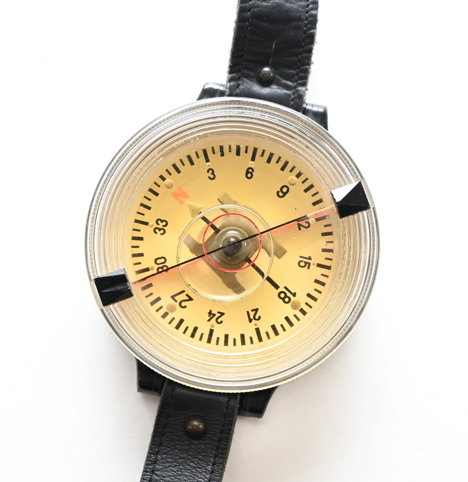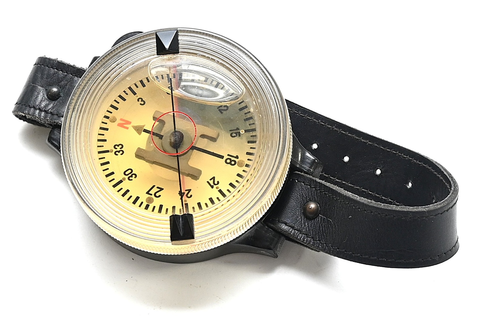 The compass shows overall minor to no signs of wear. It's in working order and complete with both leather straps. Marked on the back with 'AK39' and 'Fl23235-1'.