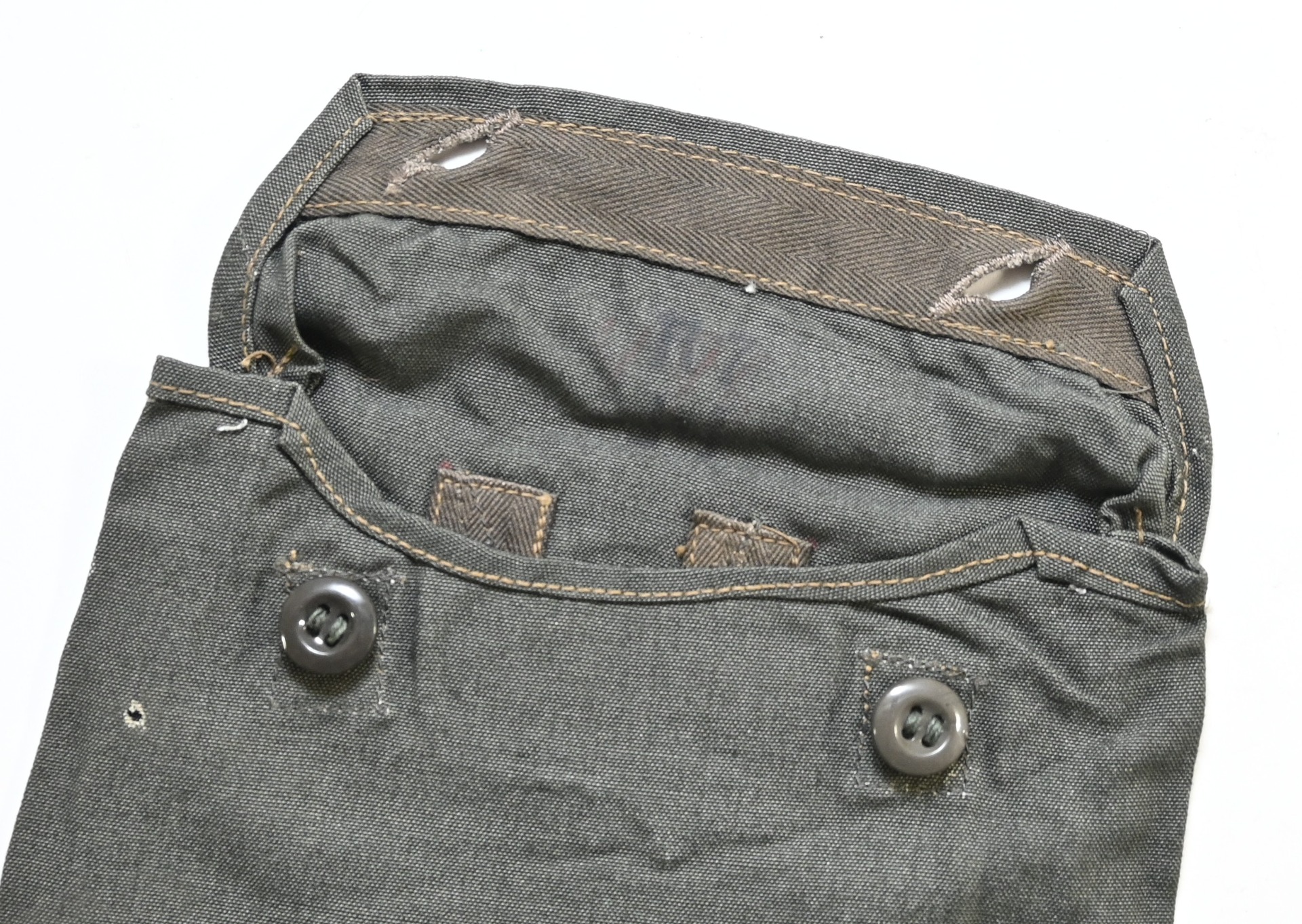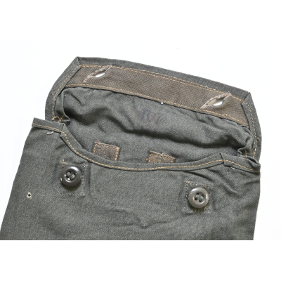 The pouch shows overall minor signs of use. The setup of the (glass) buttons is often seen on the rubberized variant of this pouch which makes it a harder to find variant.