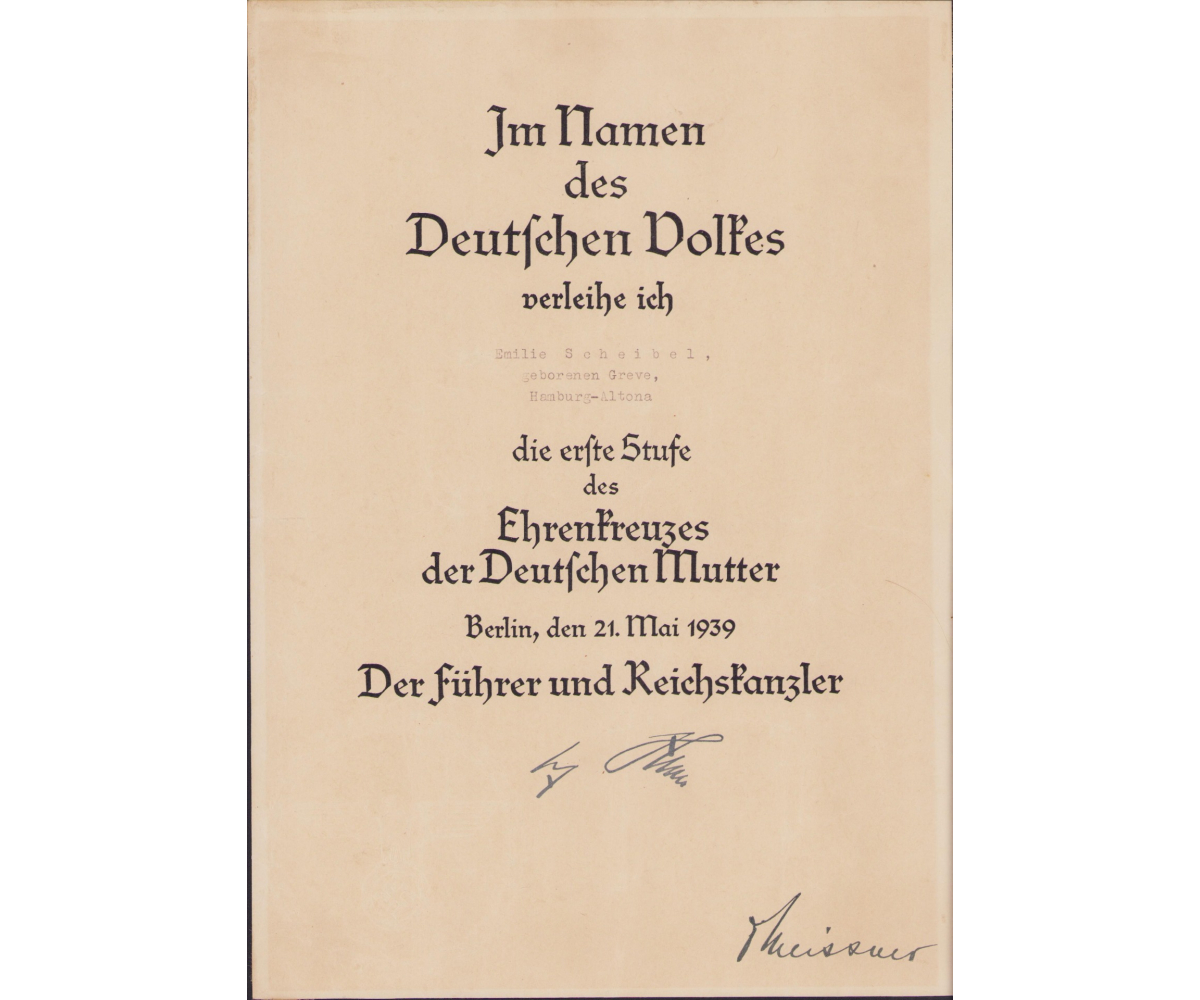 The document shows overall signs of wear. The 'die erste Stufe des Ehrenkreuzes der Deutschen Mutter' was issued to Emilie Scheibel from Hamburg-Altona on the 21st of May 1939.